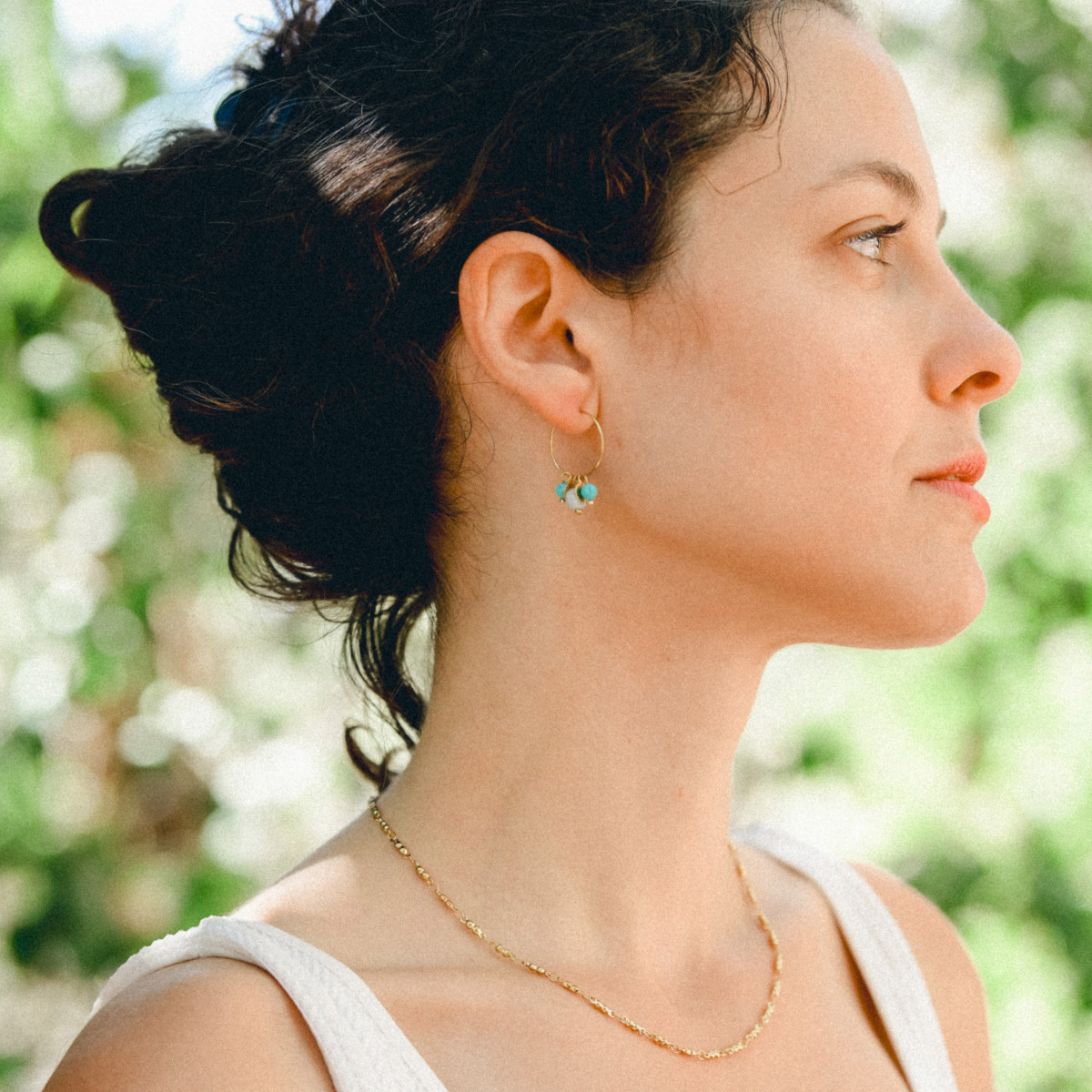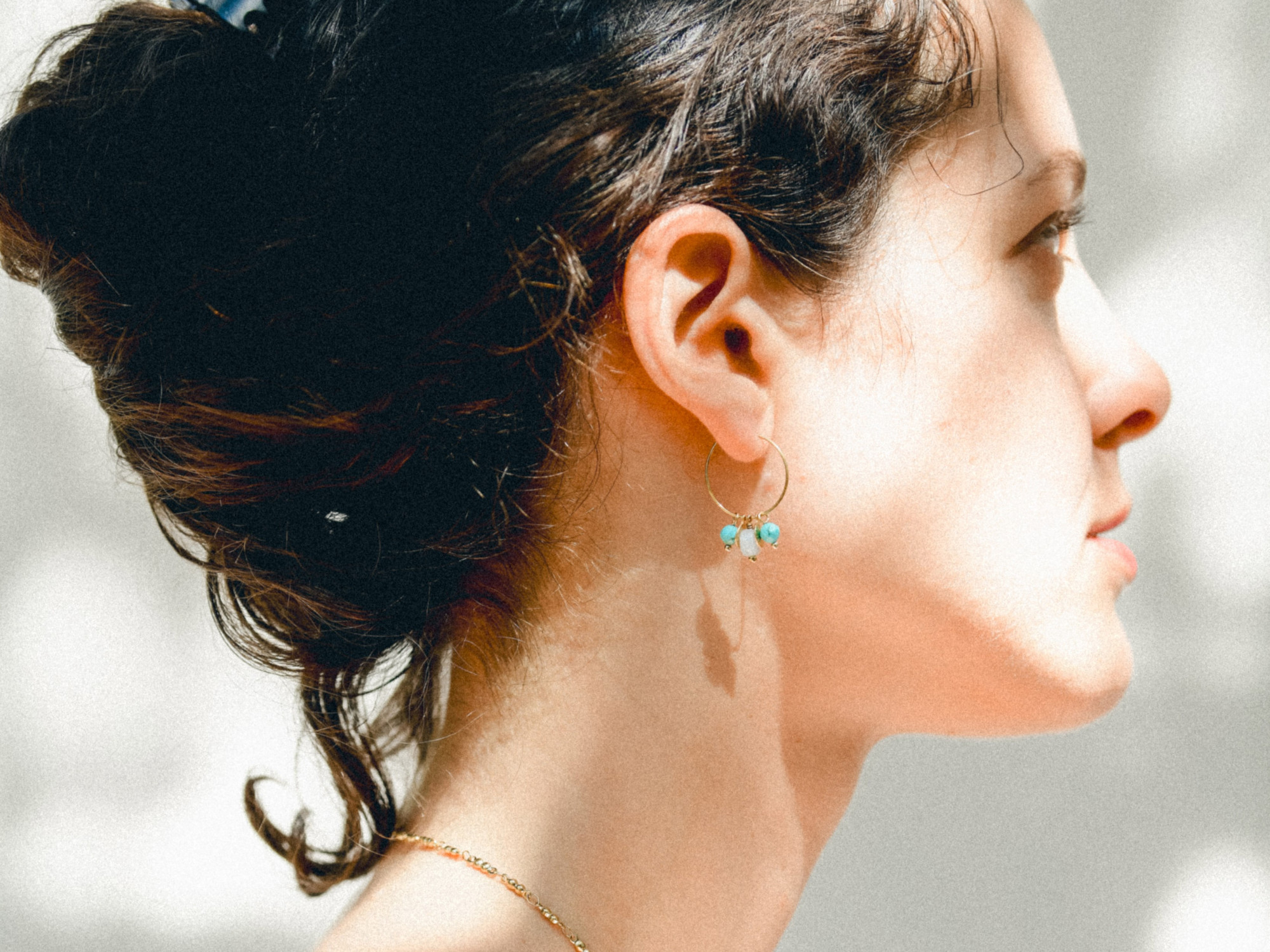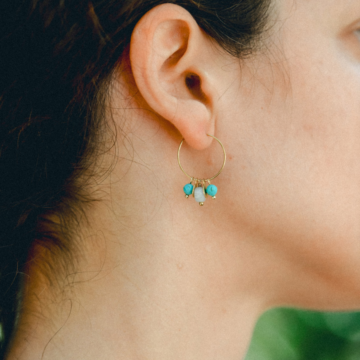 עגילי חישוק קטנים עם חרוזי אבני חן בגווני טורקיז ותכלת, בשילוב מטבעות זהובים קטנים. עגילים בעיצוב בוהו קליל, קיצי ומשמח.
