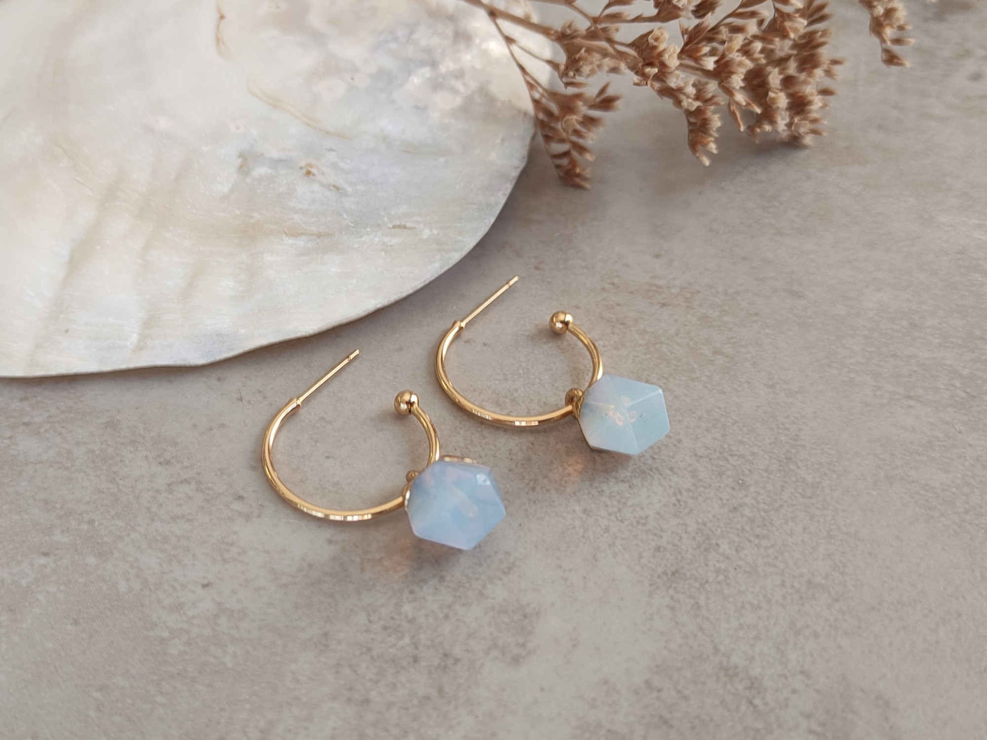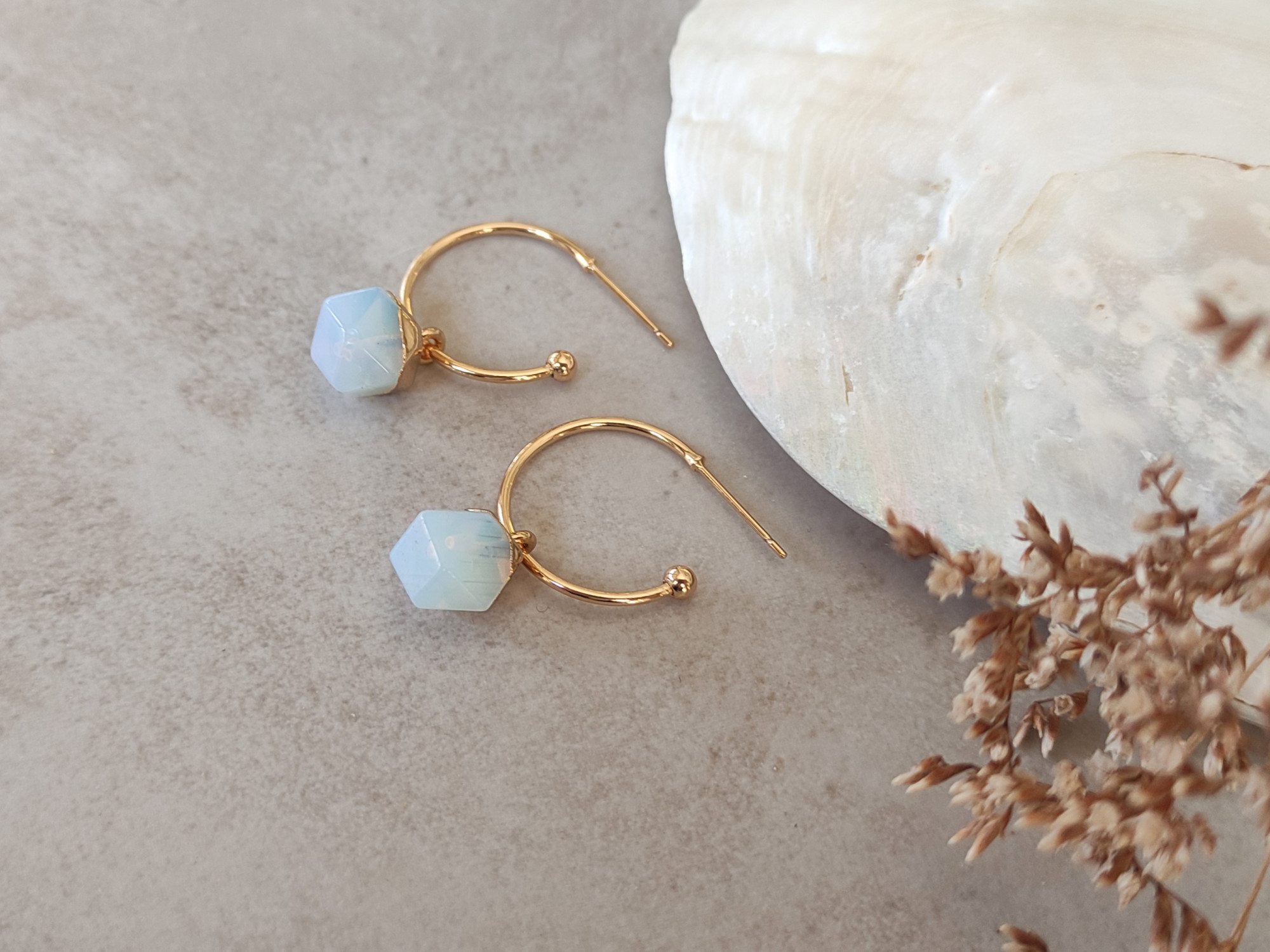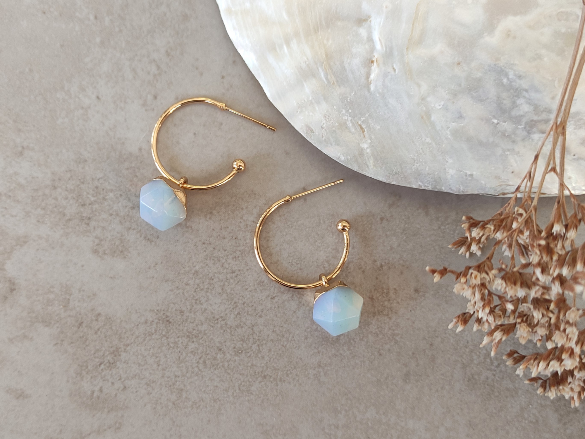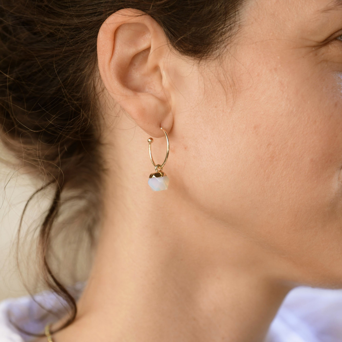 עגילי חישוק קטנים ועדינים עם תליון אבן אופאל בחיתוך גיאומטרי.