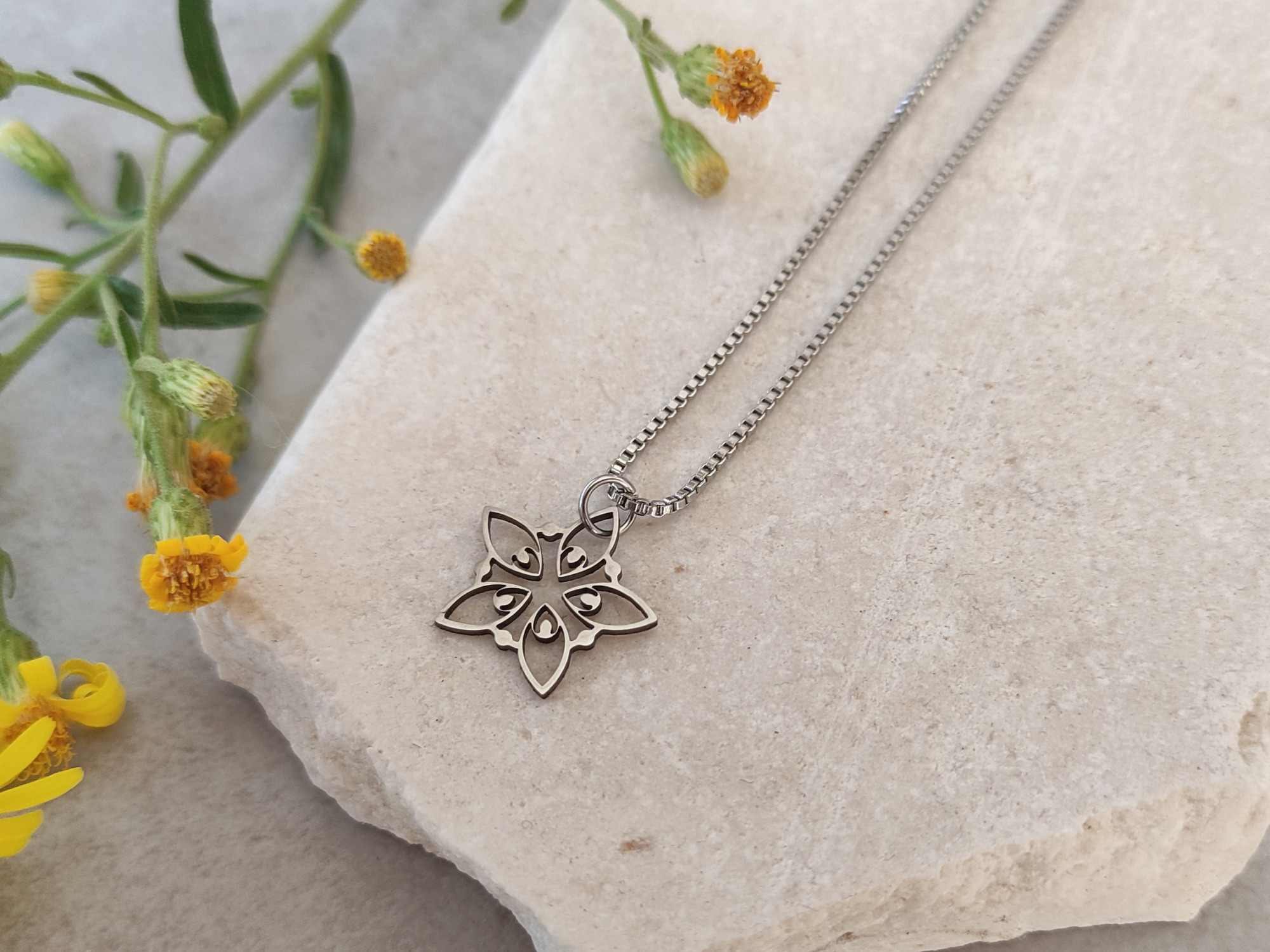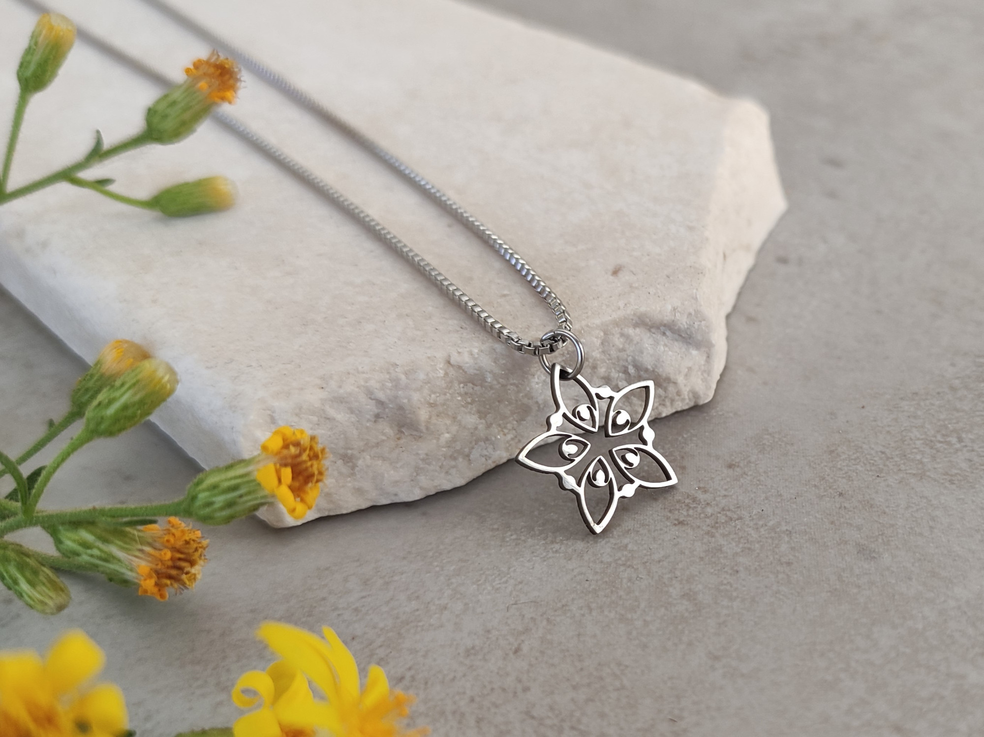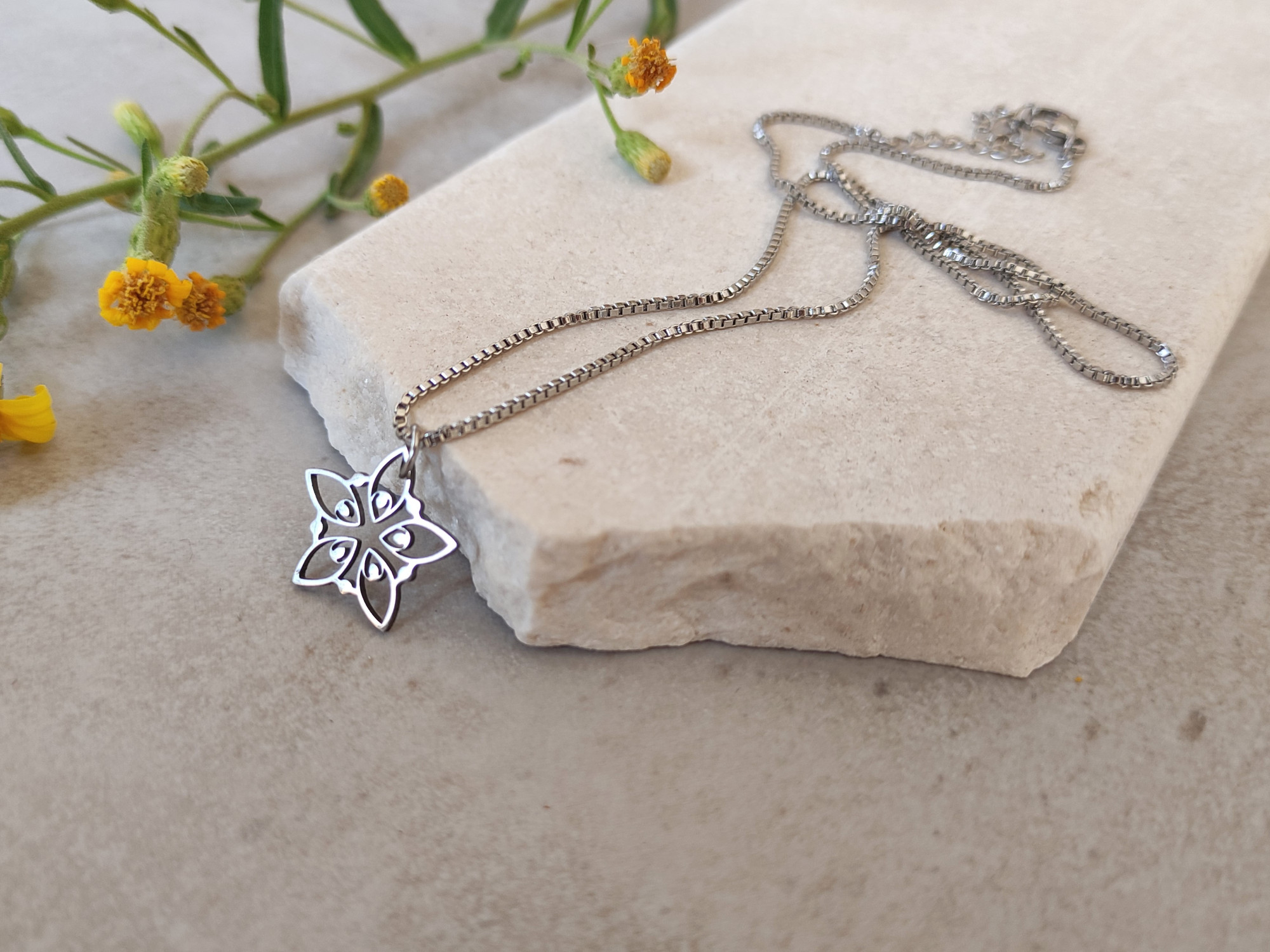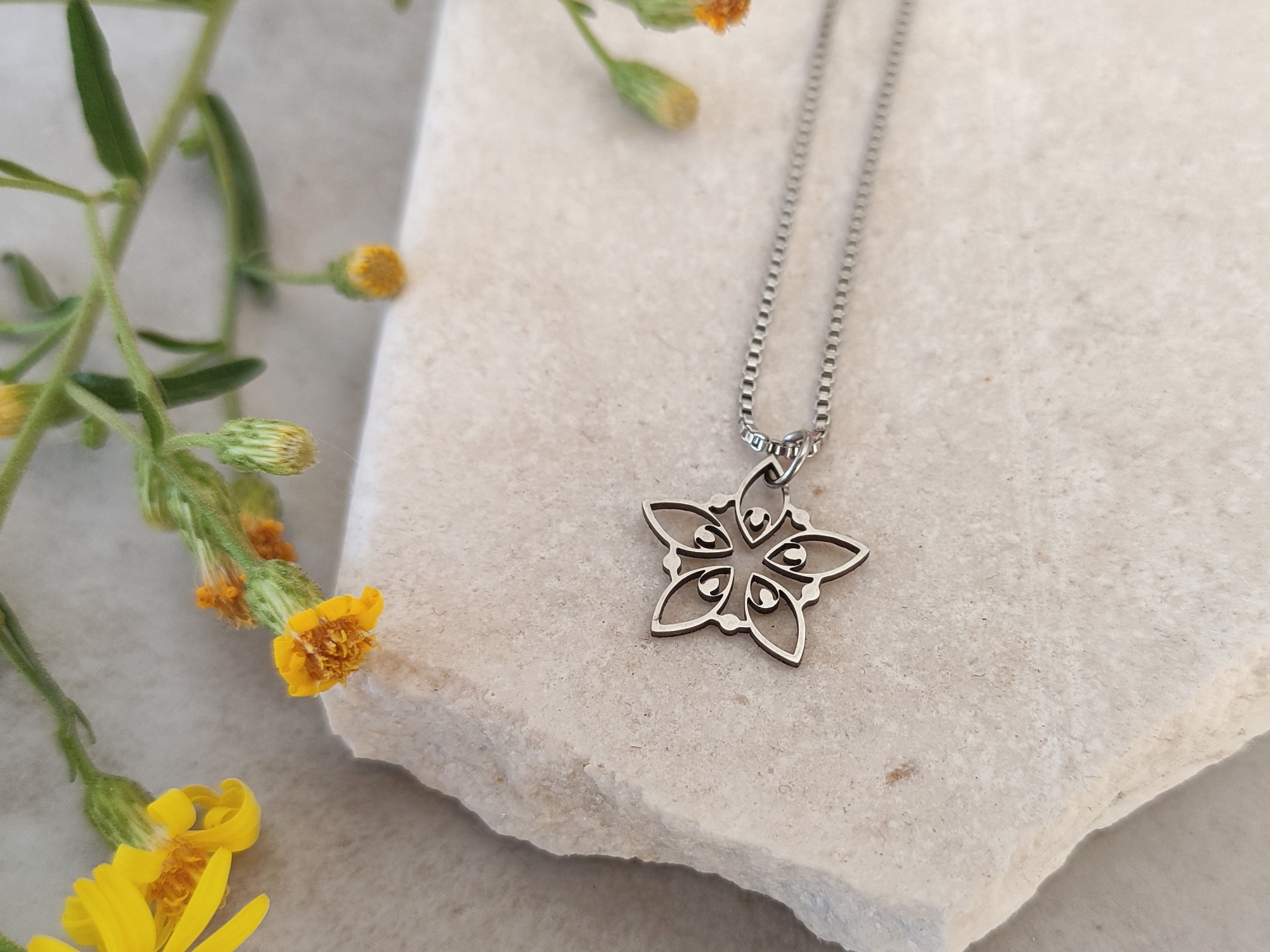 שרשרת כסופה קצרה עם תליון פרח עדין, בעיצוב פיתוחים קסום ומיוחד.