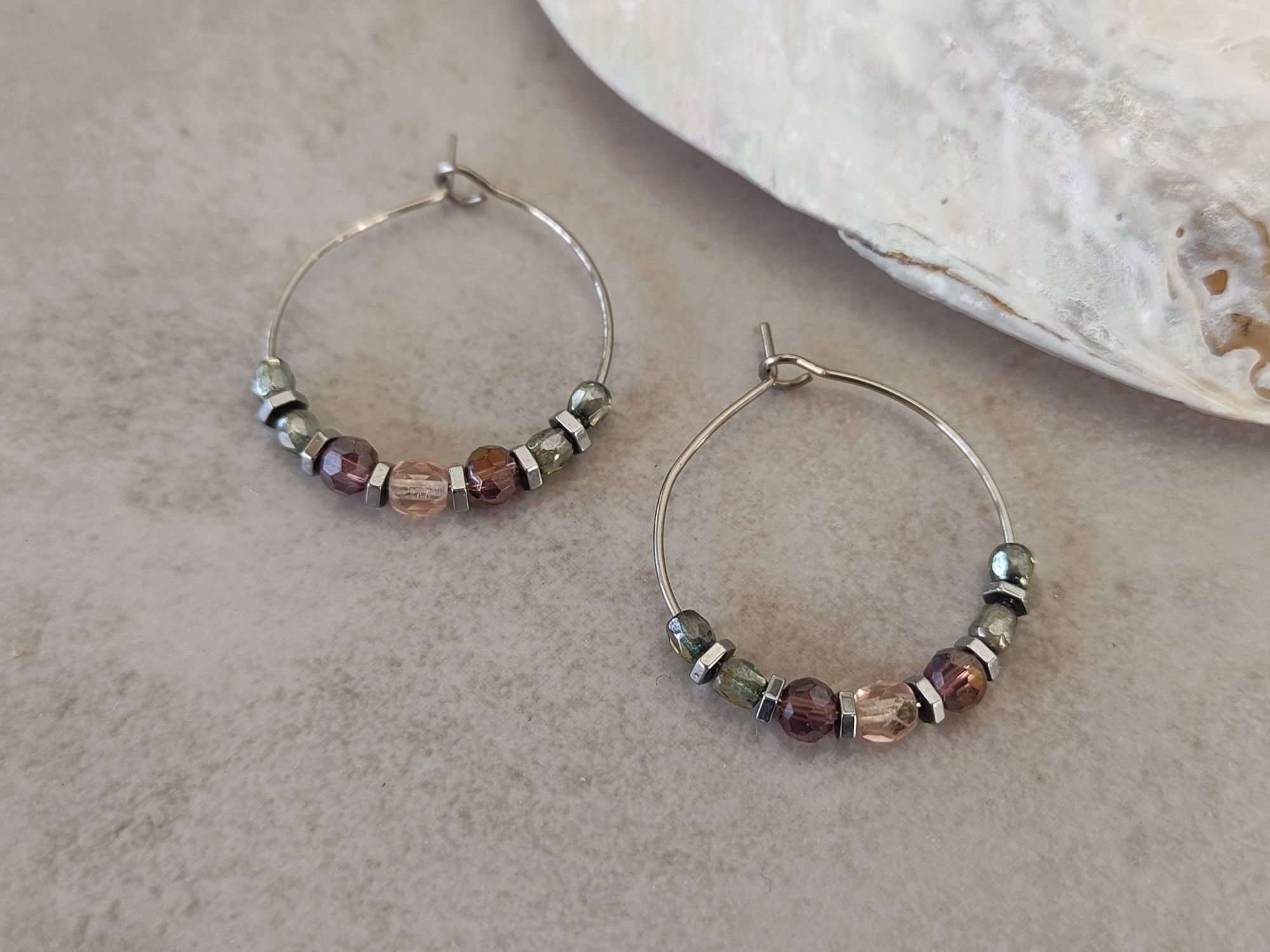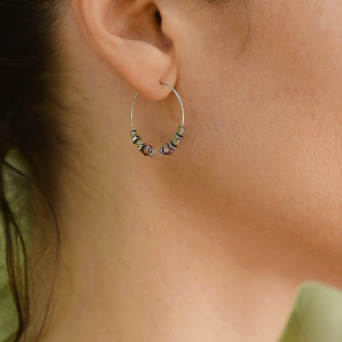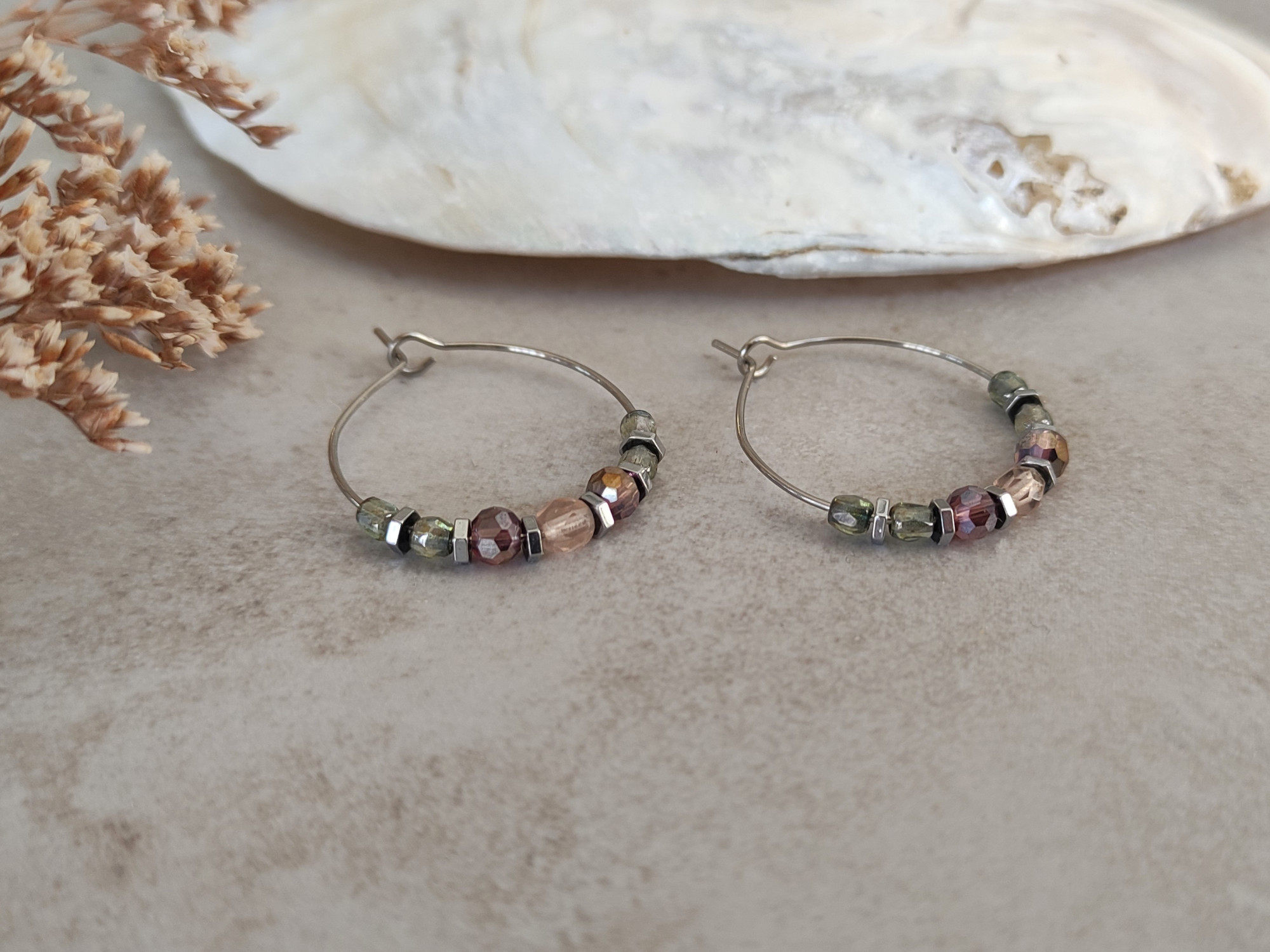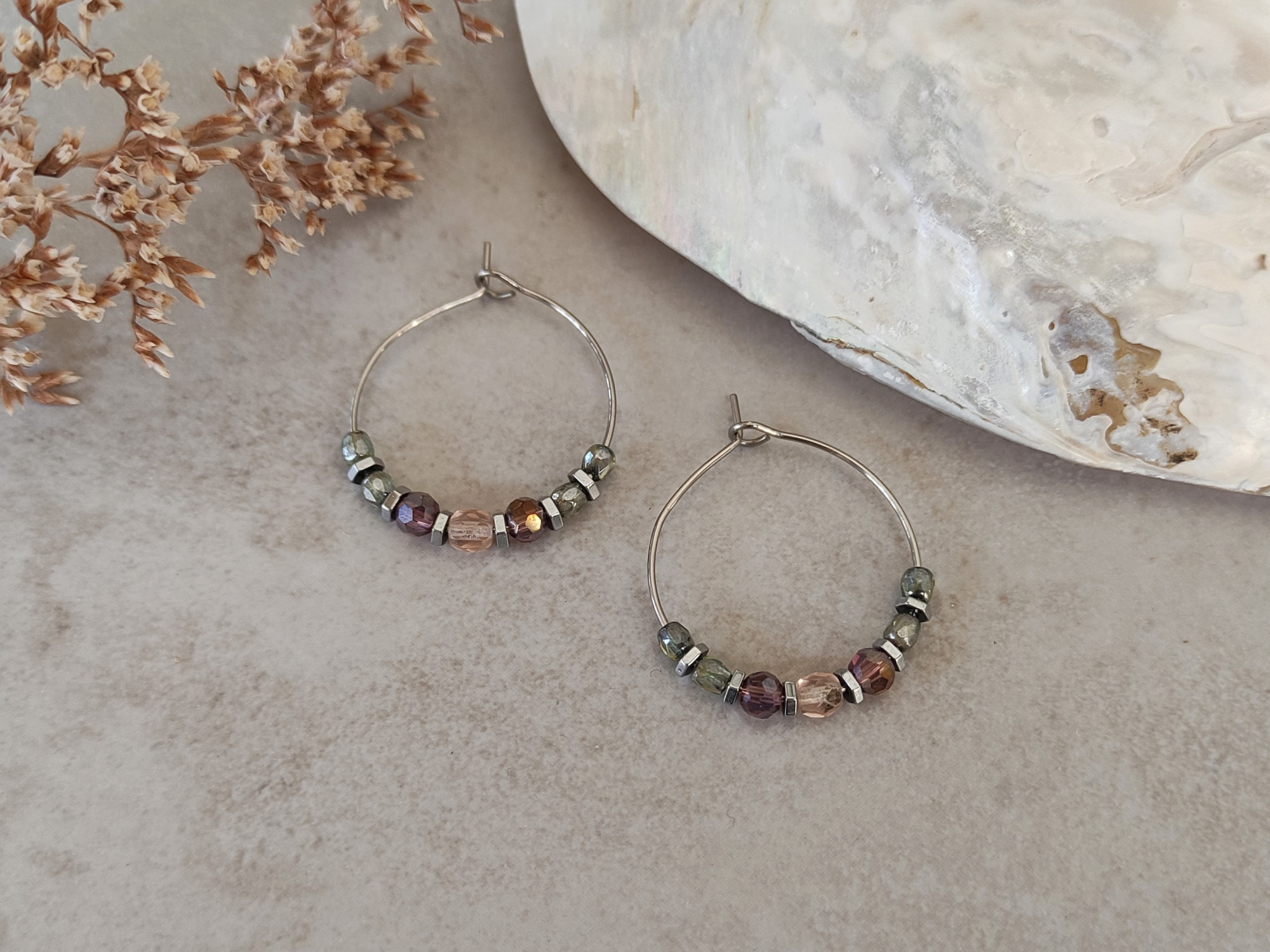עגילי חישוק כסופים בצבעוניות רכה עדינה, עם חרוזי זכוכית בגווני ירוק, ורוד עתיק ואפור, בשילוב חרוזי המטייט כסופים. עגילים ניטרליים וסופר שימושיים. מושלמים כעגילים יומיומיים, קלי משקל, נוחים לענידה ולא משתלטים על ההופעה.