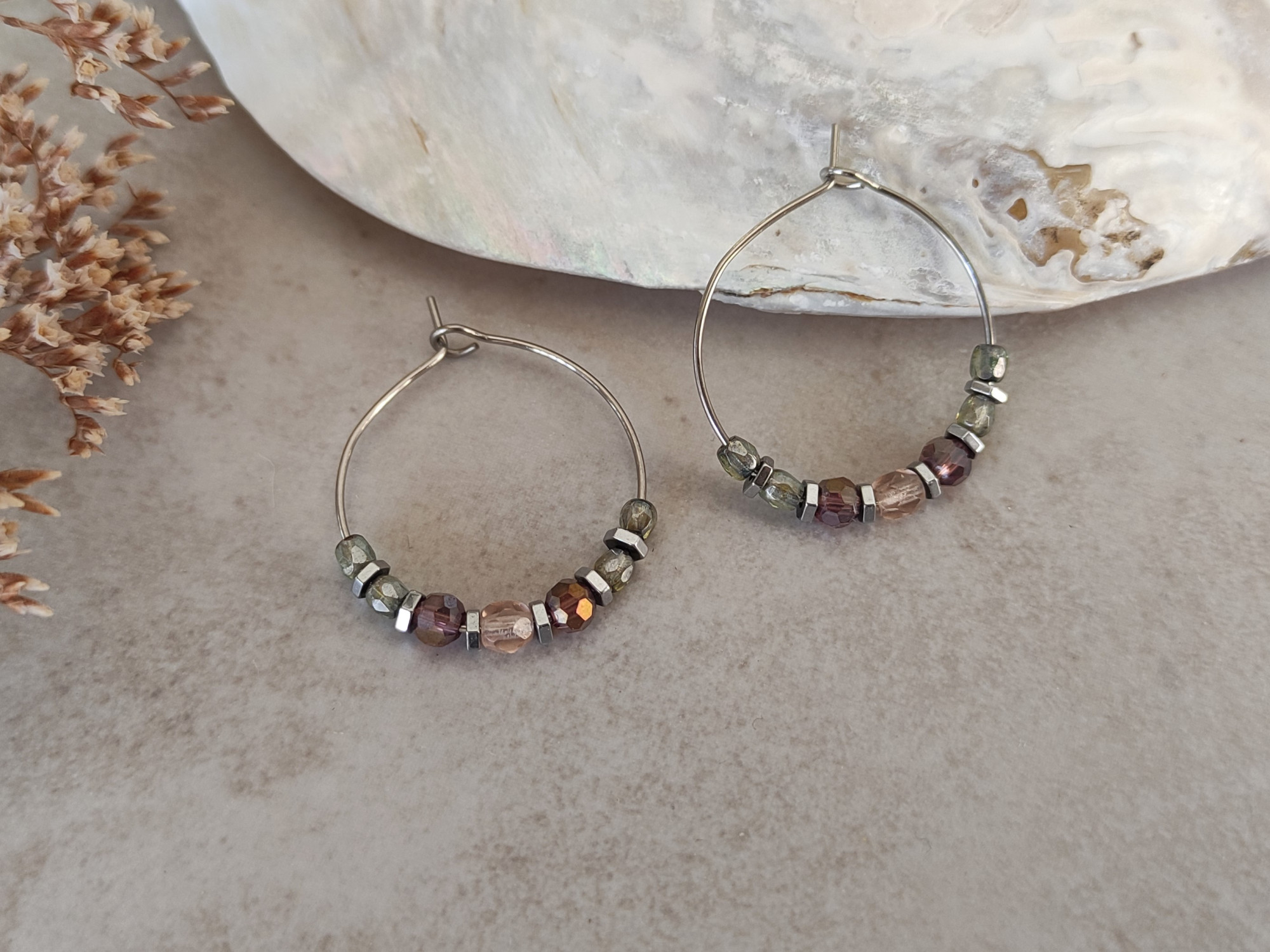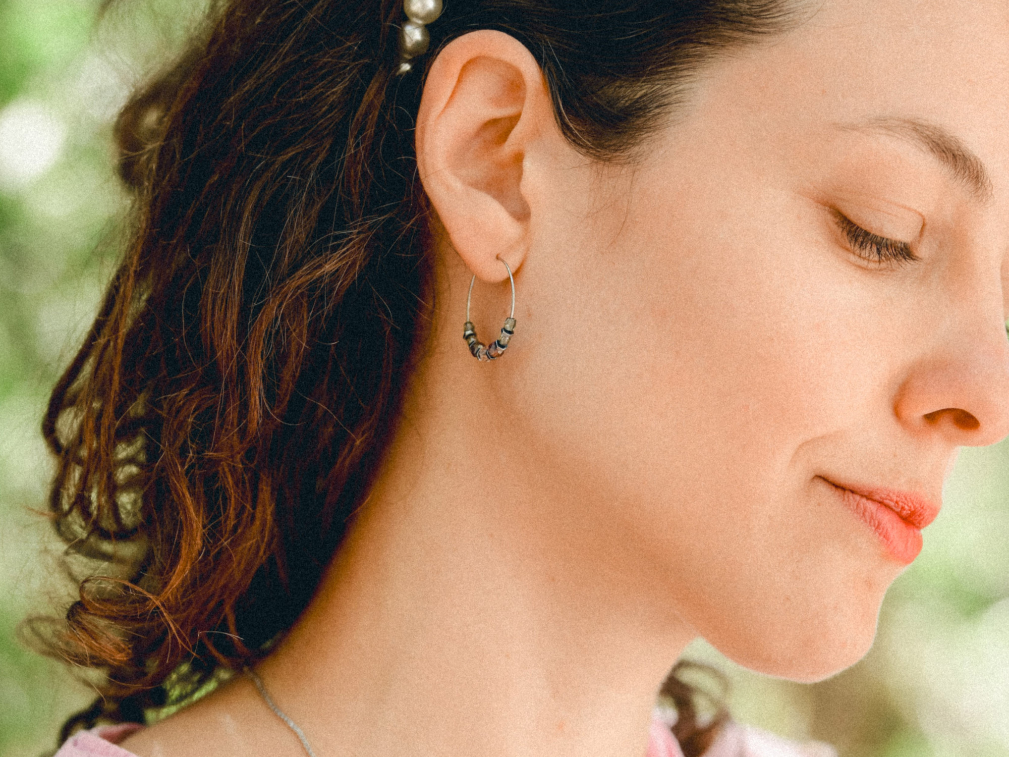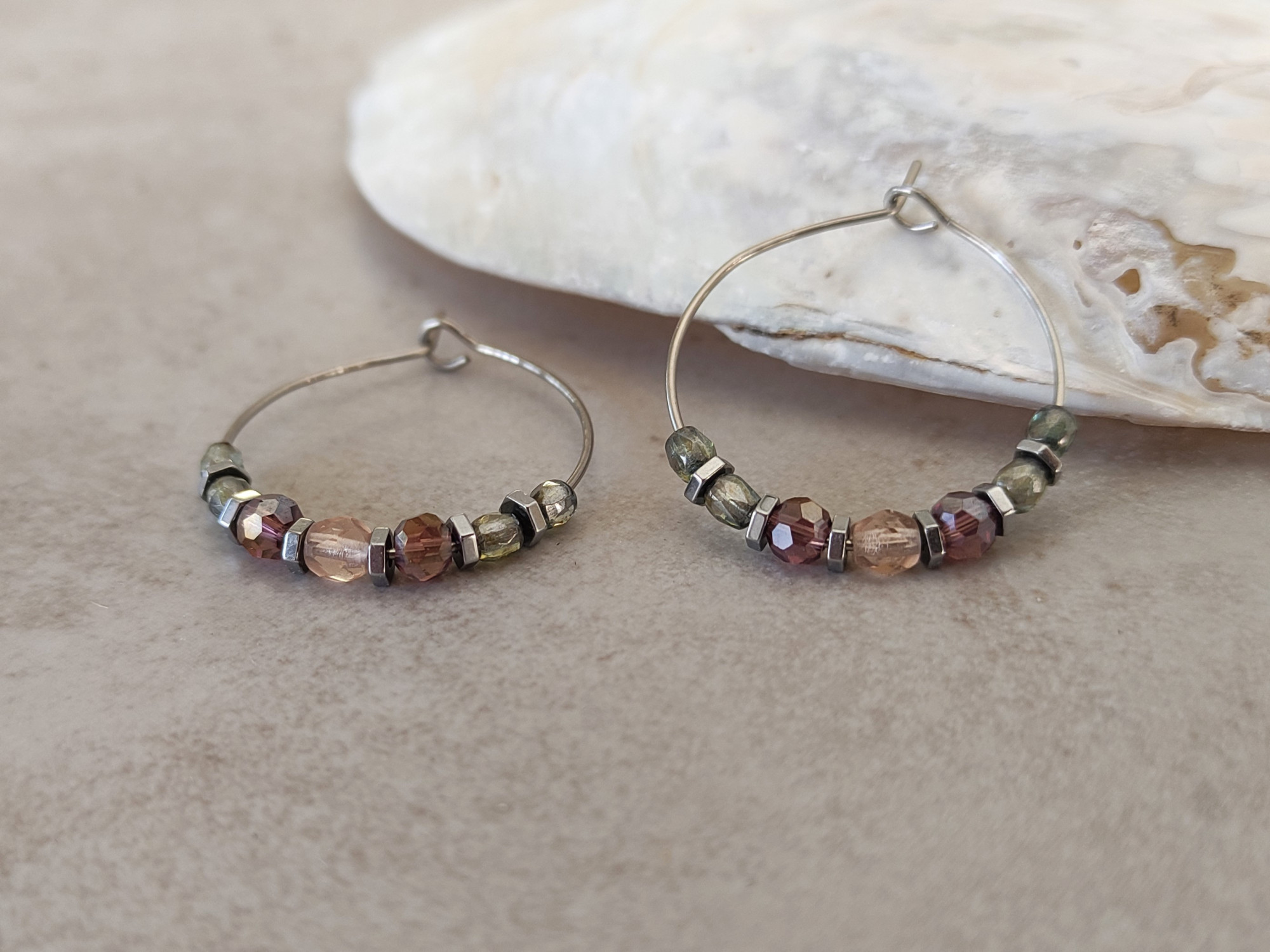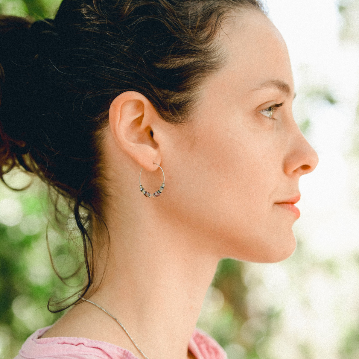 עגילי חישוק כסופים בצבעוניות רכה עדינה, עם חרוזי זכוכית בגווני ירוק, ורוד עתיק ואפור, בשילוב חרוזי המטייט כסופים. עגילים ניטרליים וסופר שימושיים. מושלמים כעגילים יומיומיים, קלי משקל, נוחים לענידה ולא משתלטים על ההופעה.