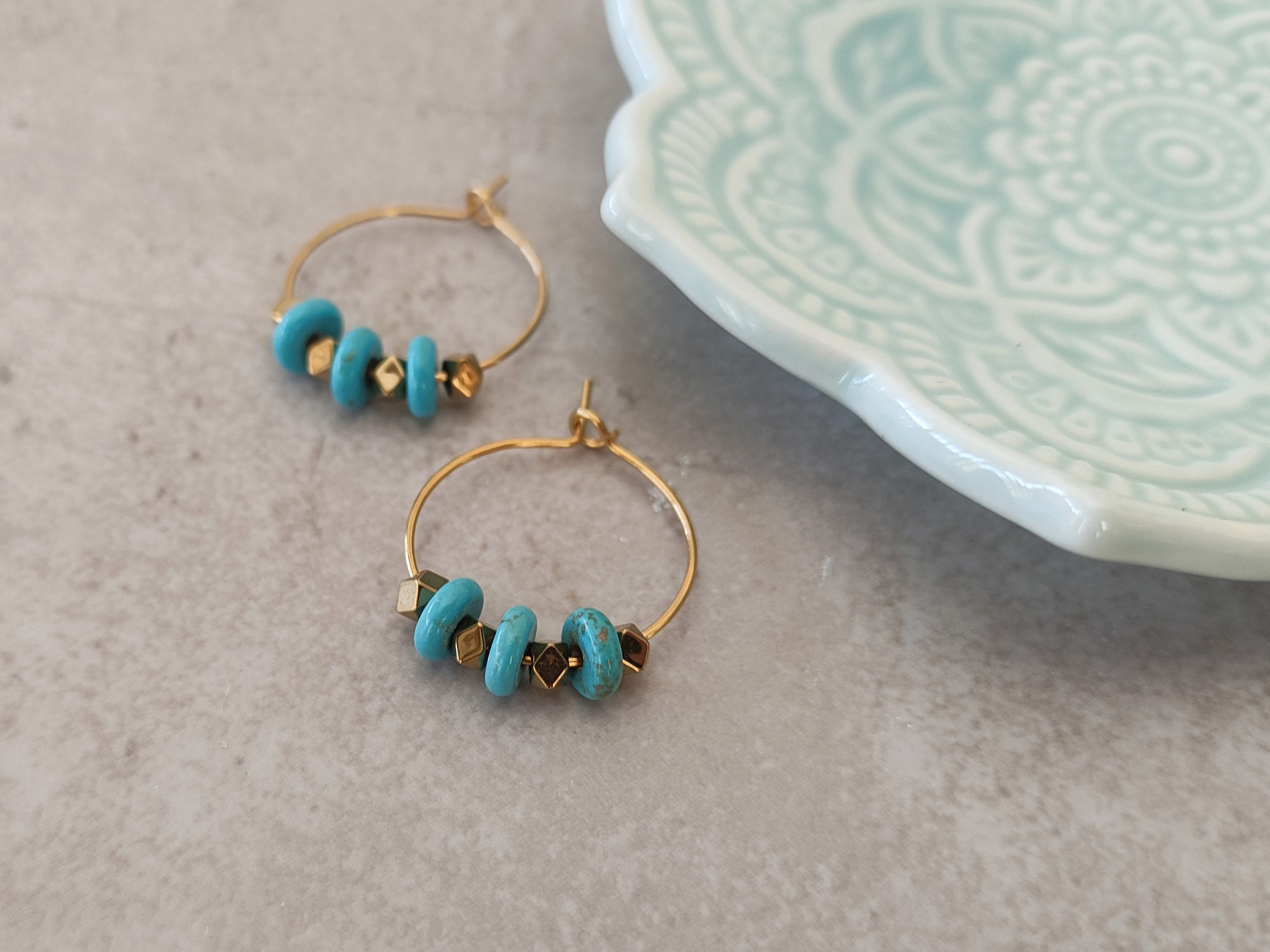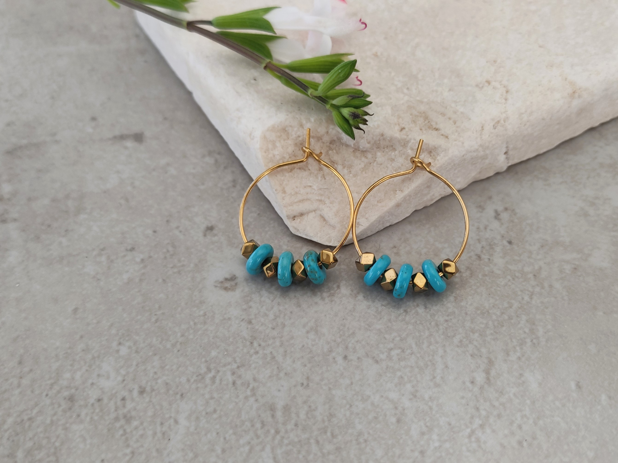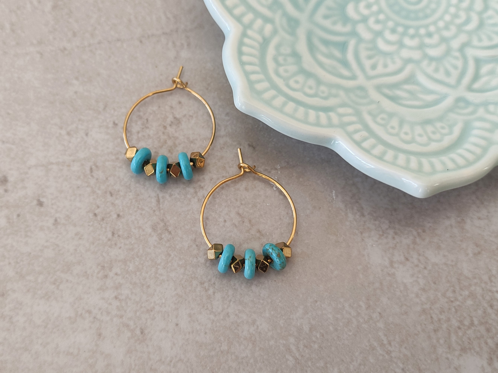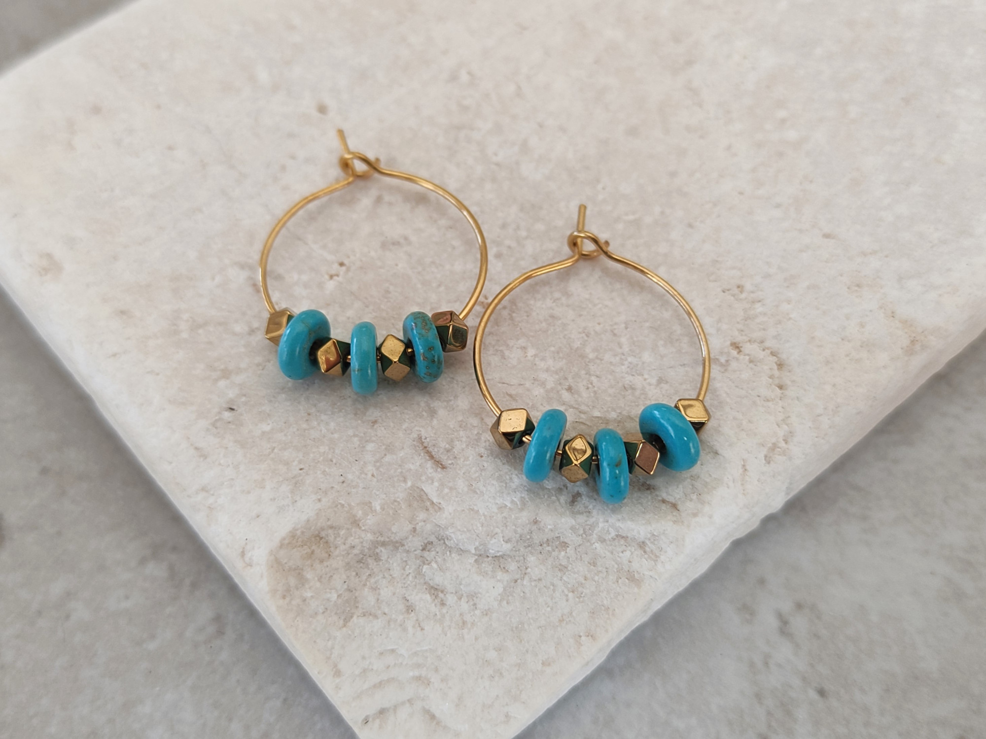 עגילי חישוק קטנים עם חרוזים בגווני זהב וטורקיז. עגילים מושלמים ליומיום, מוסיפים נגיעה של צבע כיפי ומשמח לכל הופעה.