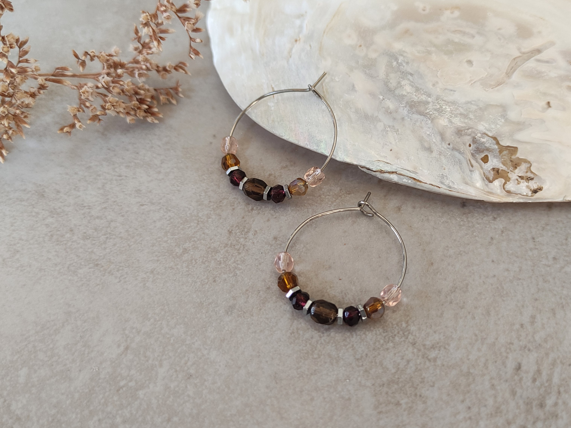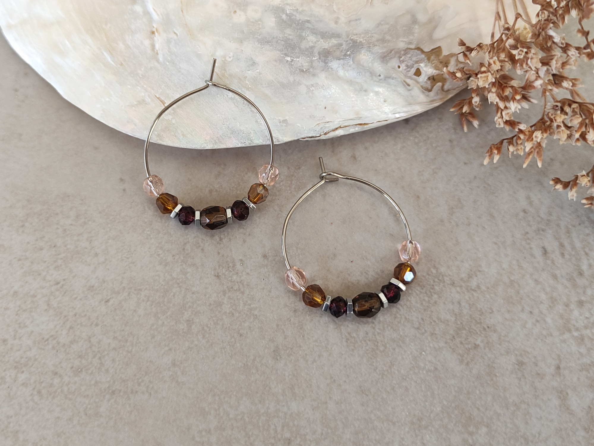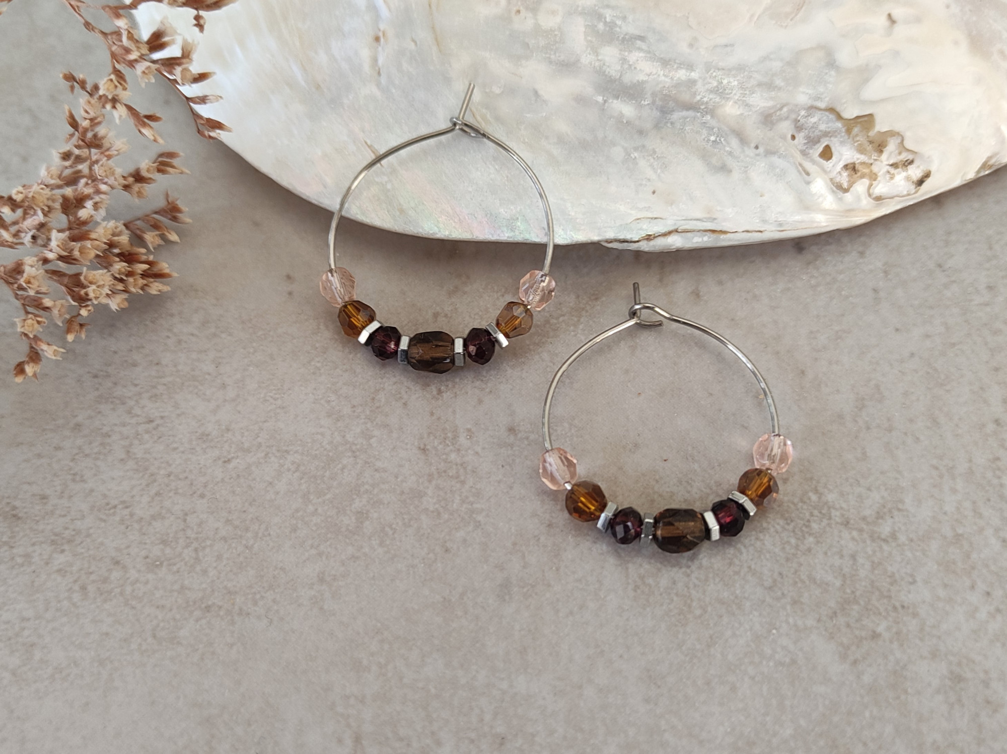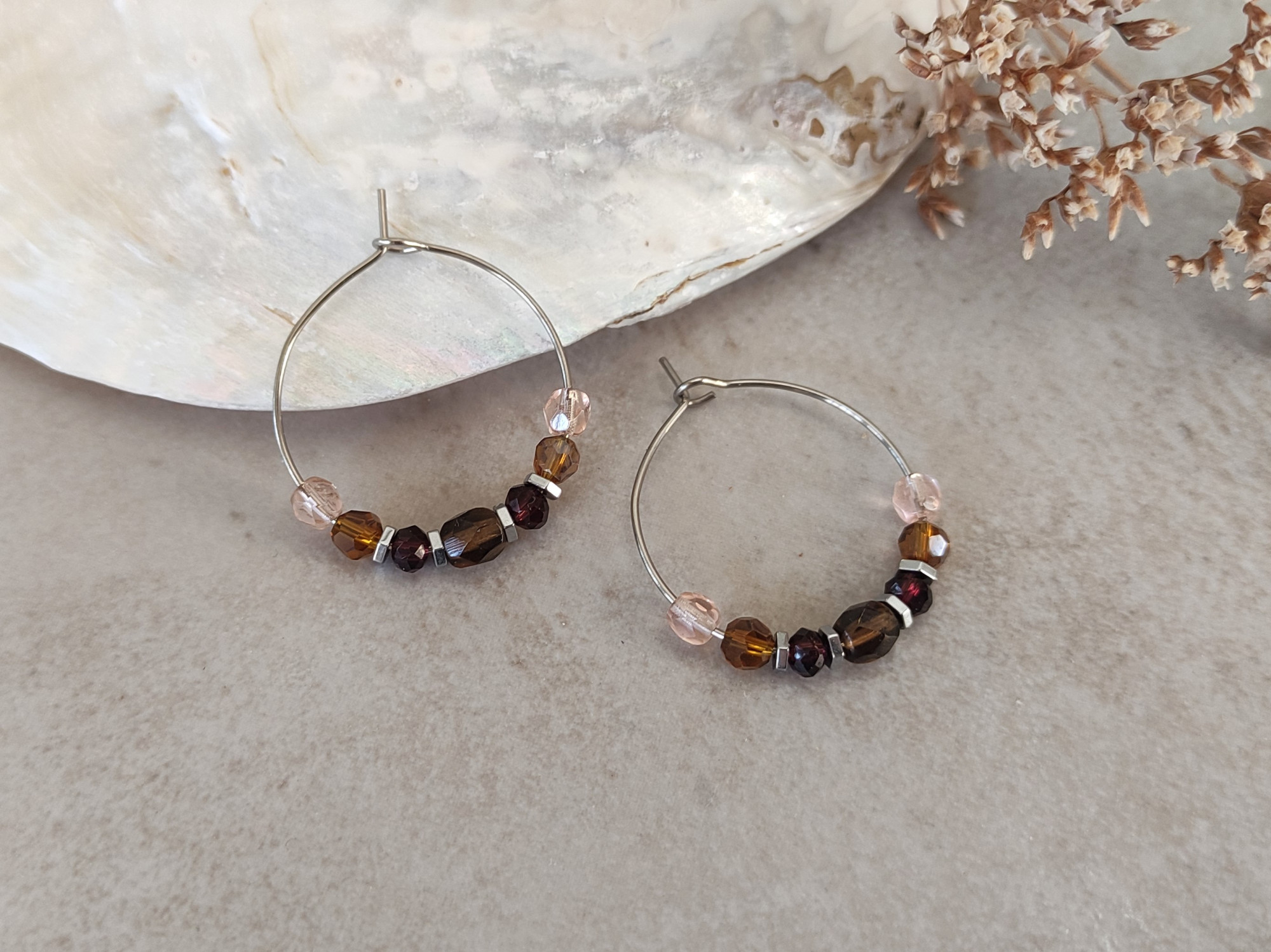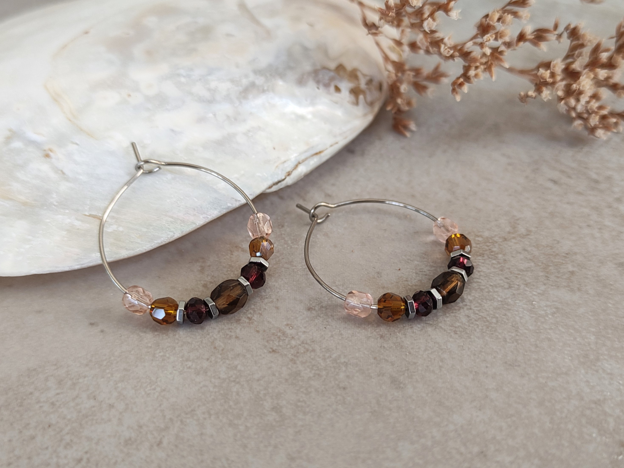 עגילי חישוק כסופים בצבעוניות של סתיו, עם חרוזי זכוכית בגווני ורוד וחום, בשילוב חרוזי המטייט כסופים. מוסיפים נגיעה של צבע מבלי להשתלט על ההופעה. מושלמים כעגילים יומיומיים, קלי משקל, נוחים לענידה.