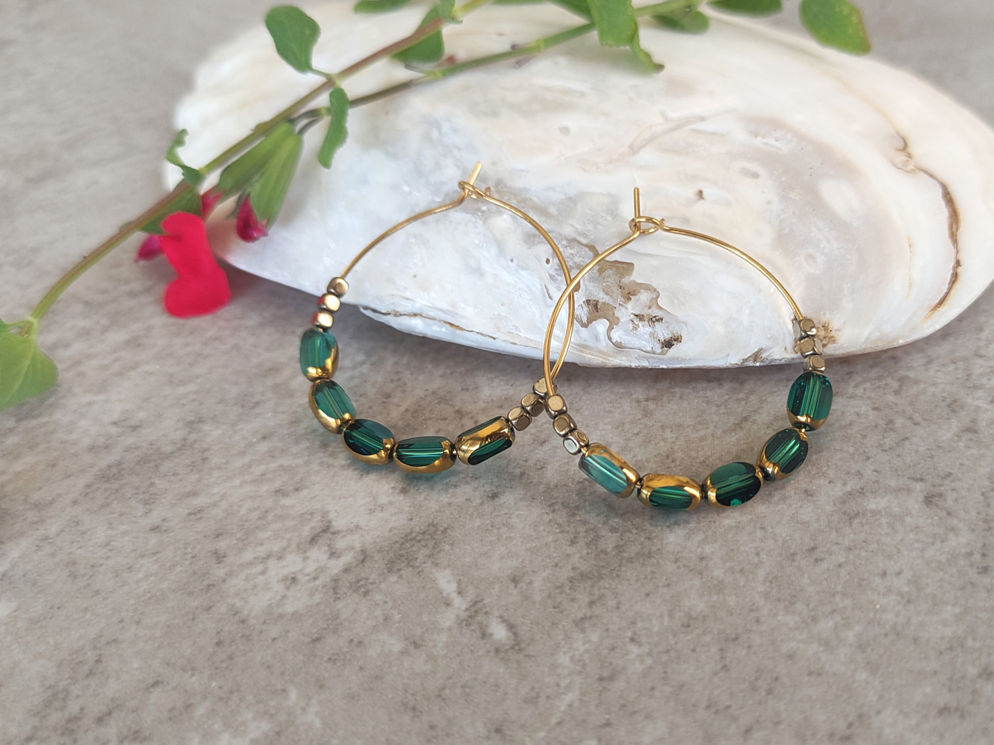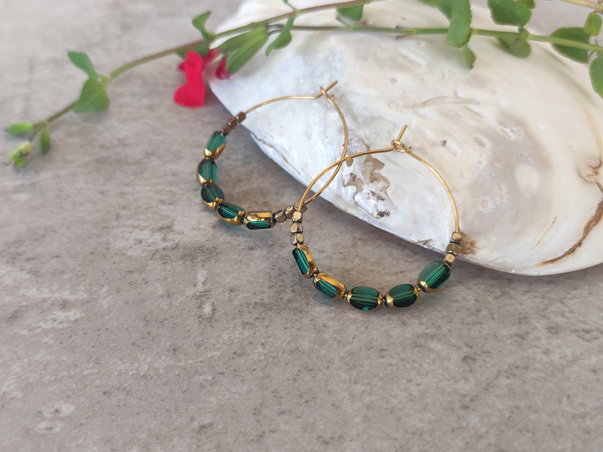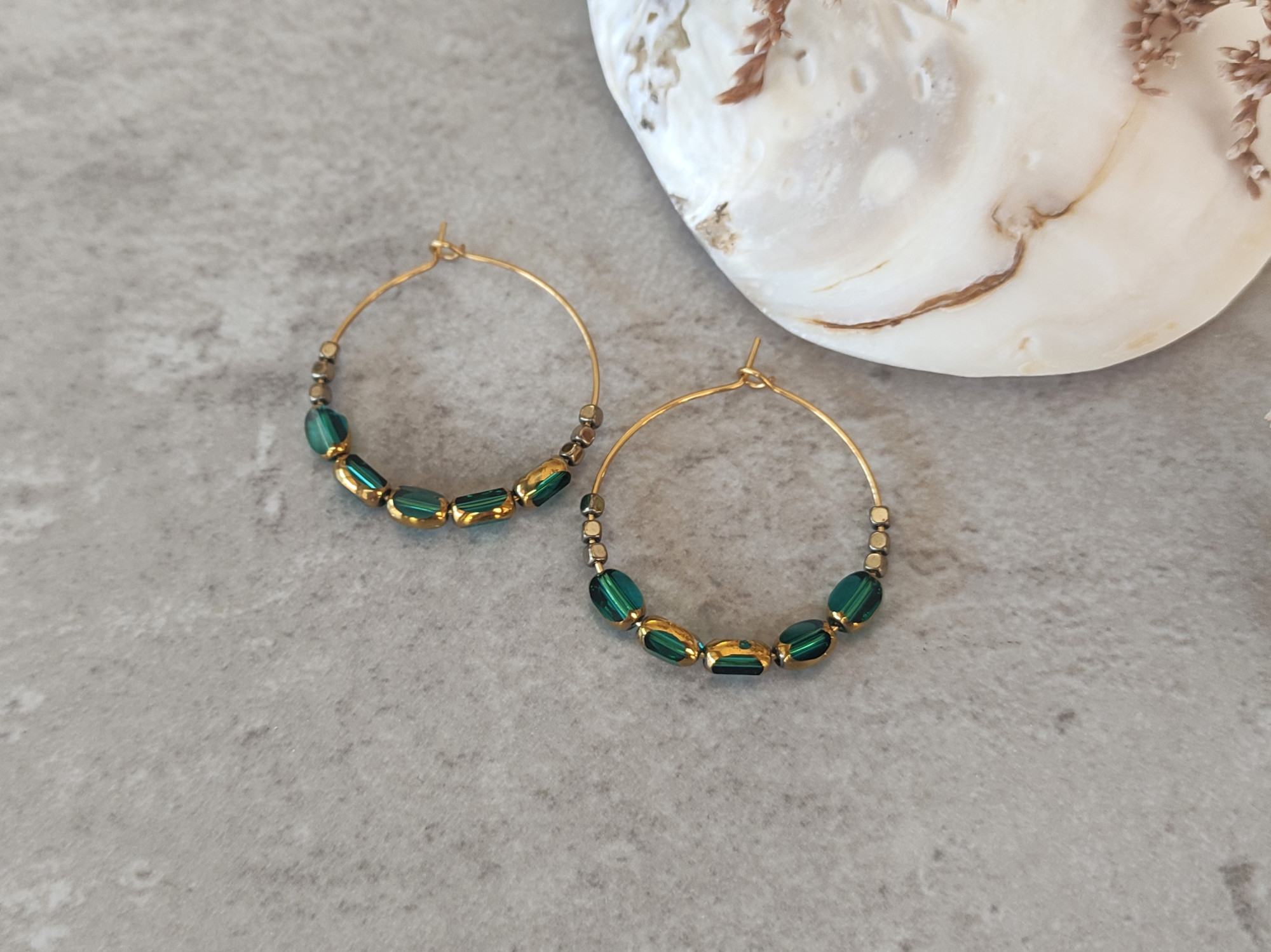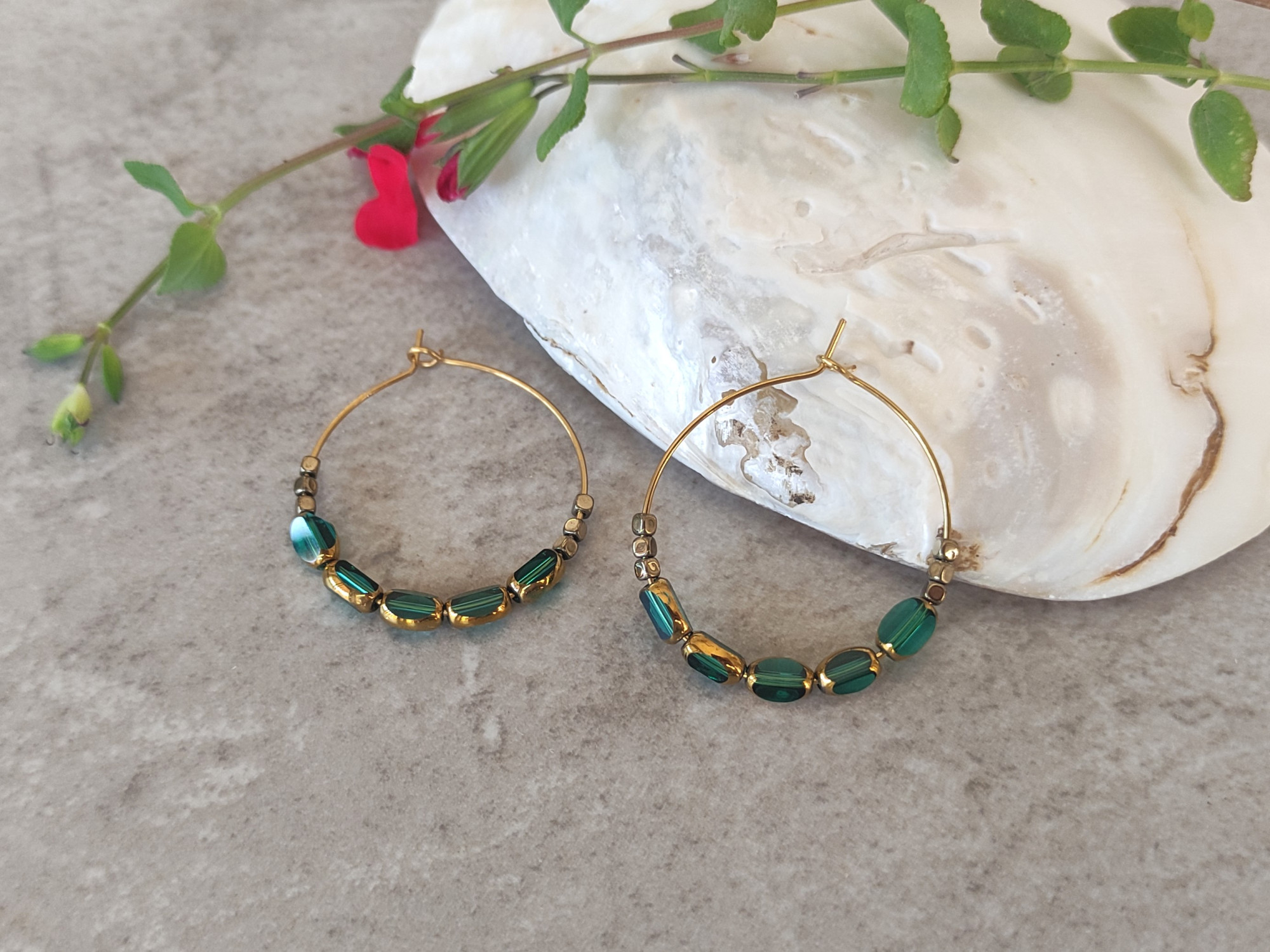 עגילי חישוק עם חרוזי זכוכית בגווני ירוק וזהב. מוסיפים אווירת בוהו קסומה לכל הופעה.