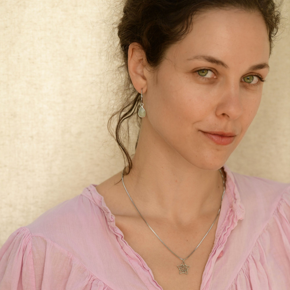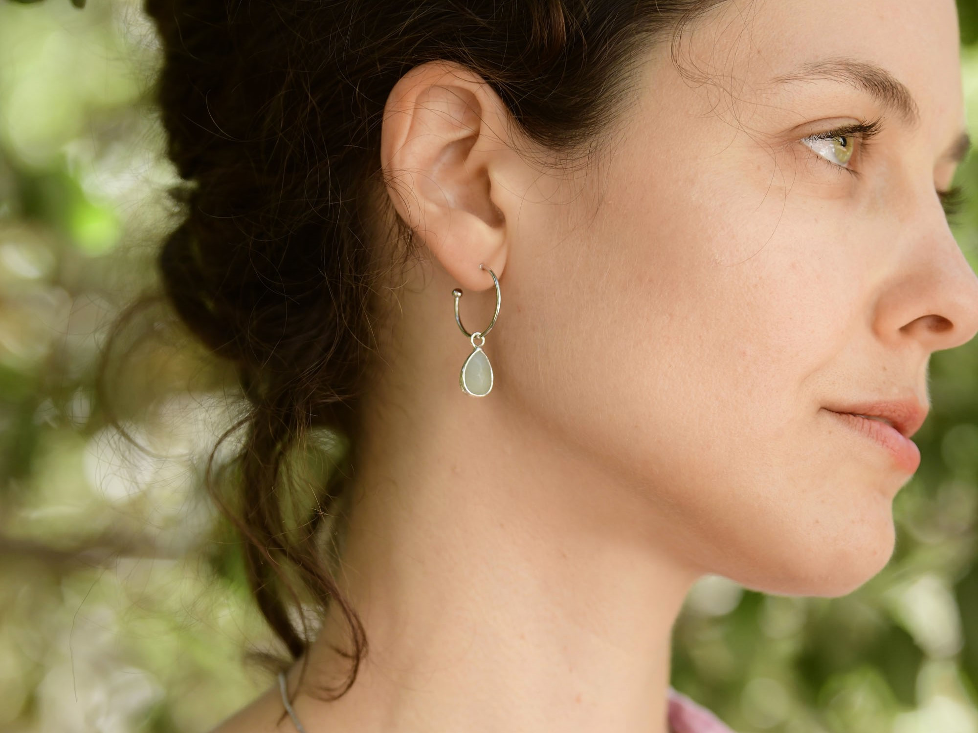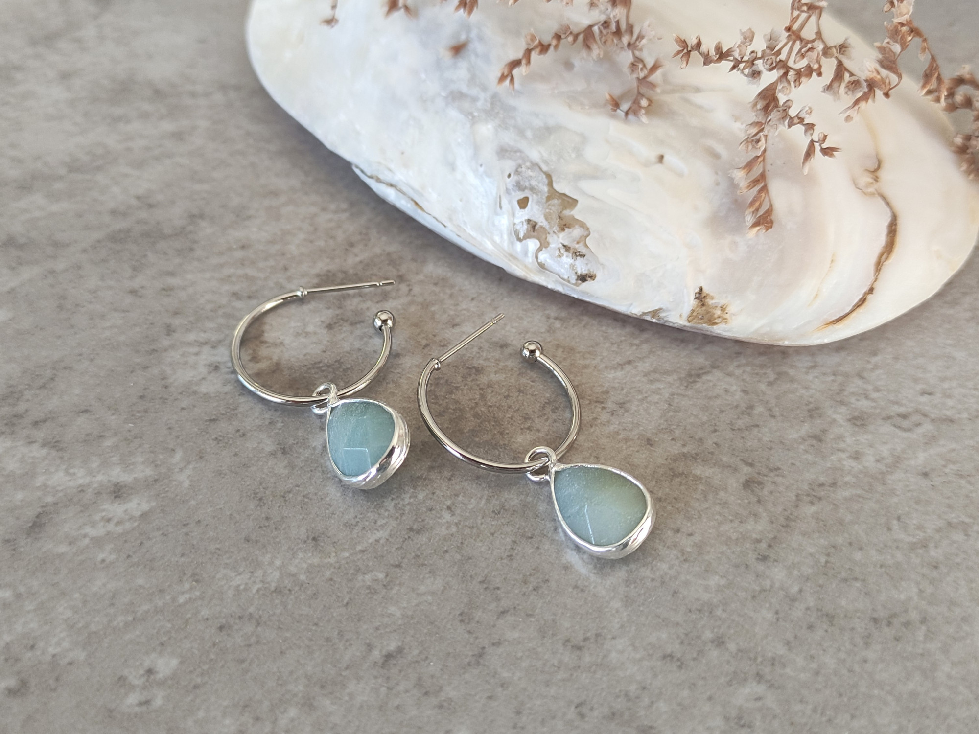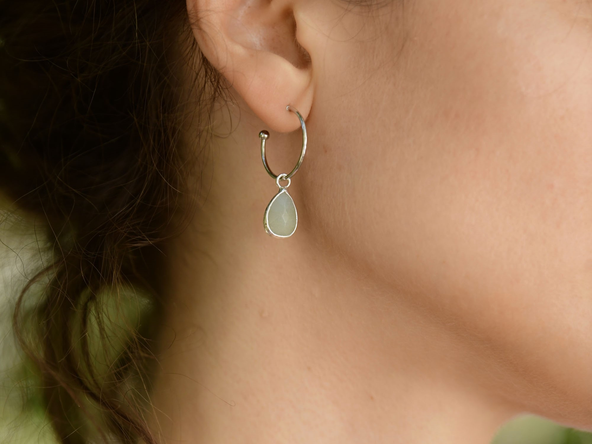 עגילי חישוק קטנים ועדינים בגוון כסוף, עם תליון אבן אמזונייט (בגוון תכלת-ירקרק) בצורת טיפה.