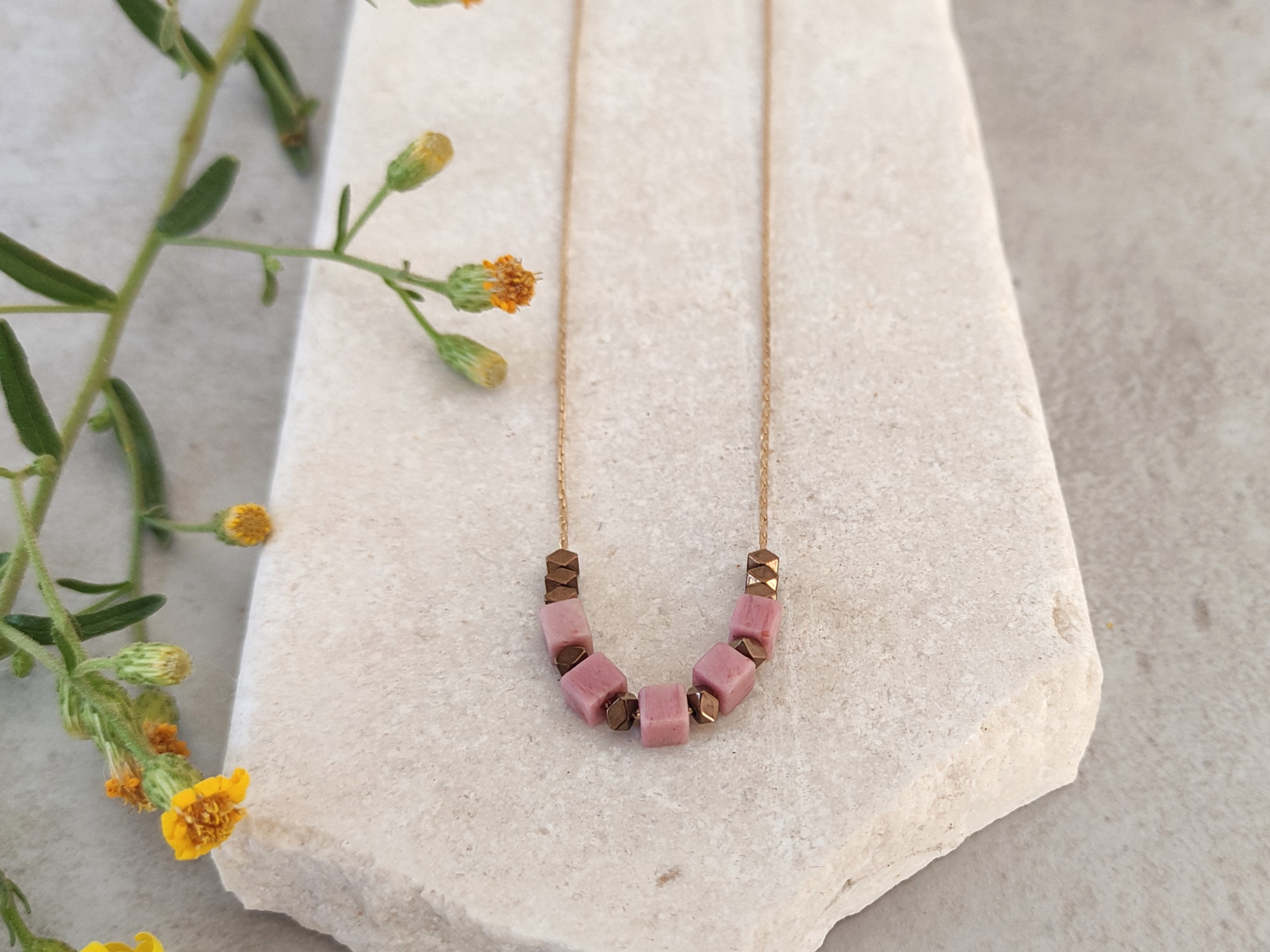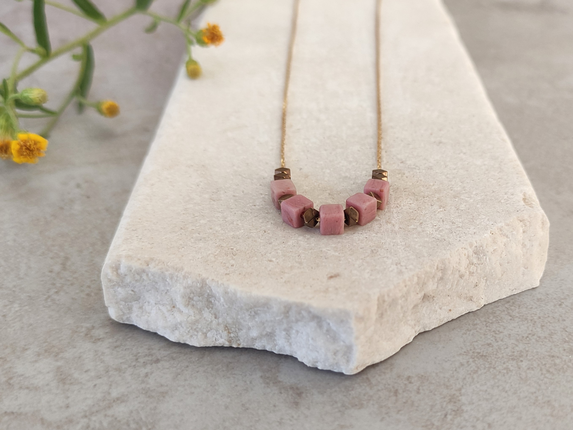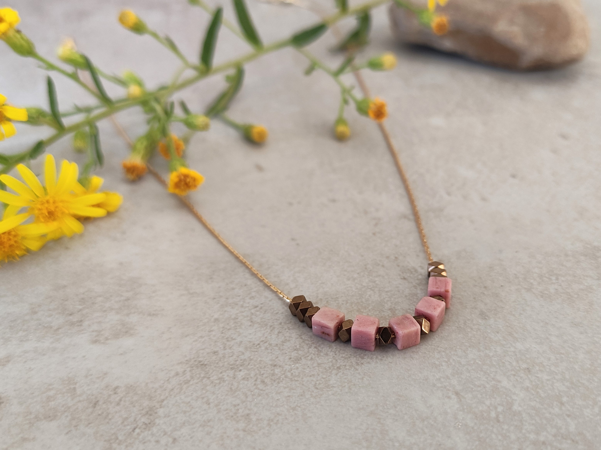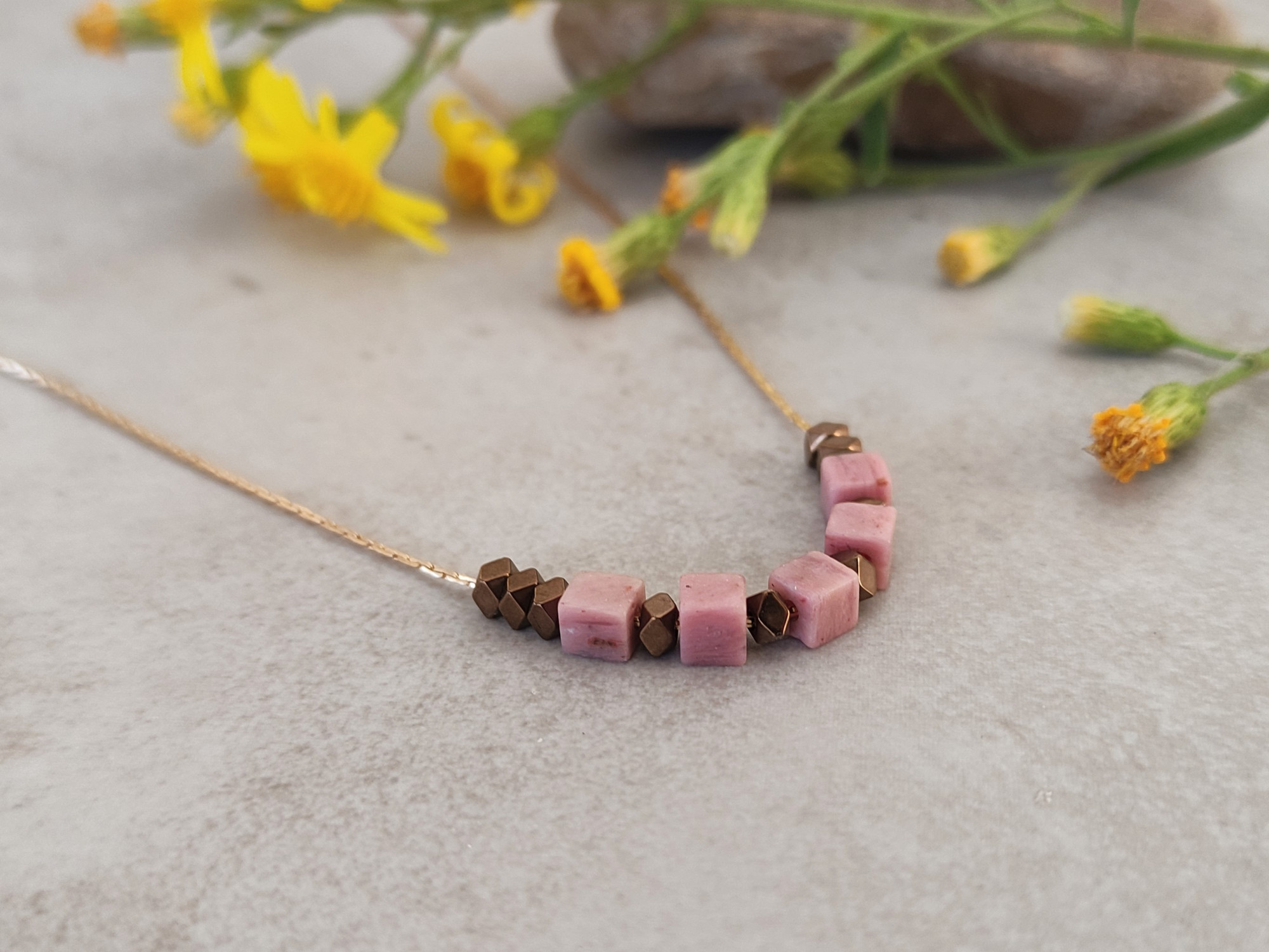 שרשרת עדינה עם שורת קוביות אבני חן ורודות (רודונייט), וביניהן חרוזי המטייט בגימור בגוון נחושת. שרשרת ייחודית בעיצוב גיאומטרי נקי וגוונים כיפיים שמעלים חיוך על הפנים. מושלמת ליומיום וגם לרגעים חגיגיים.