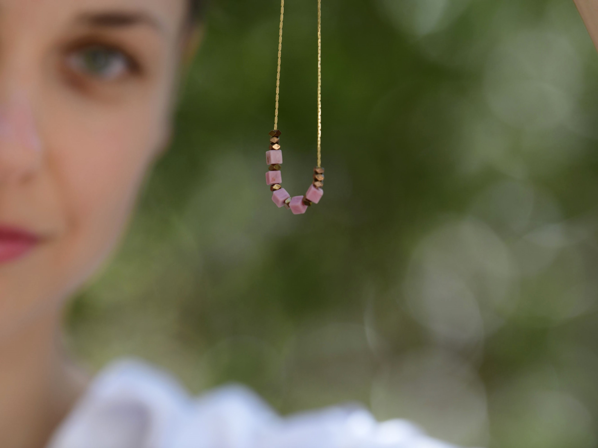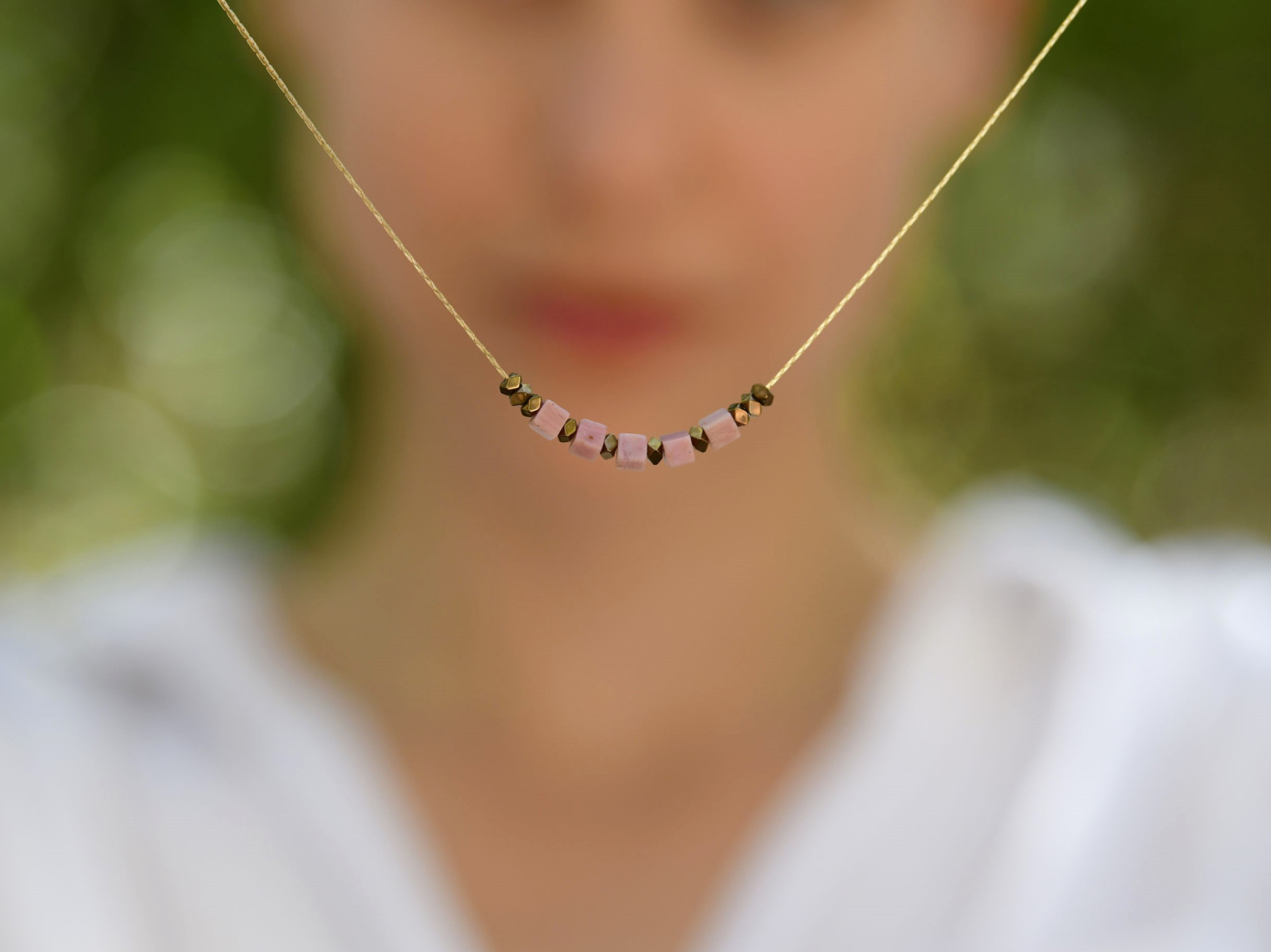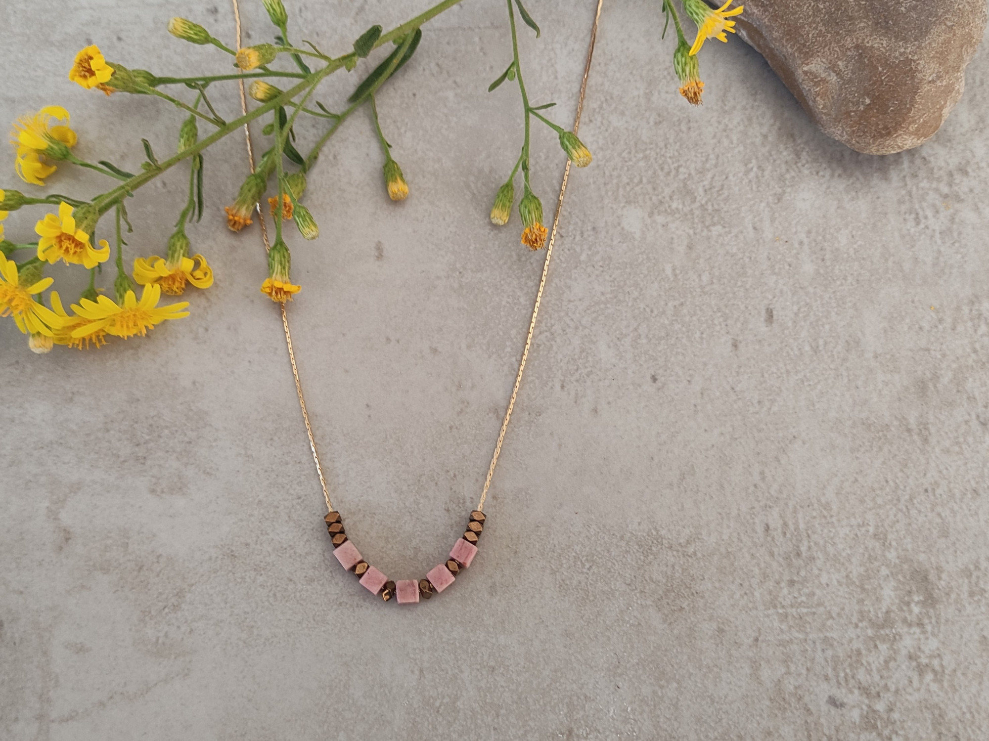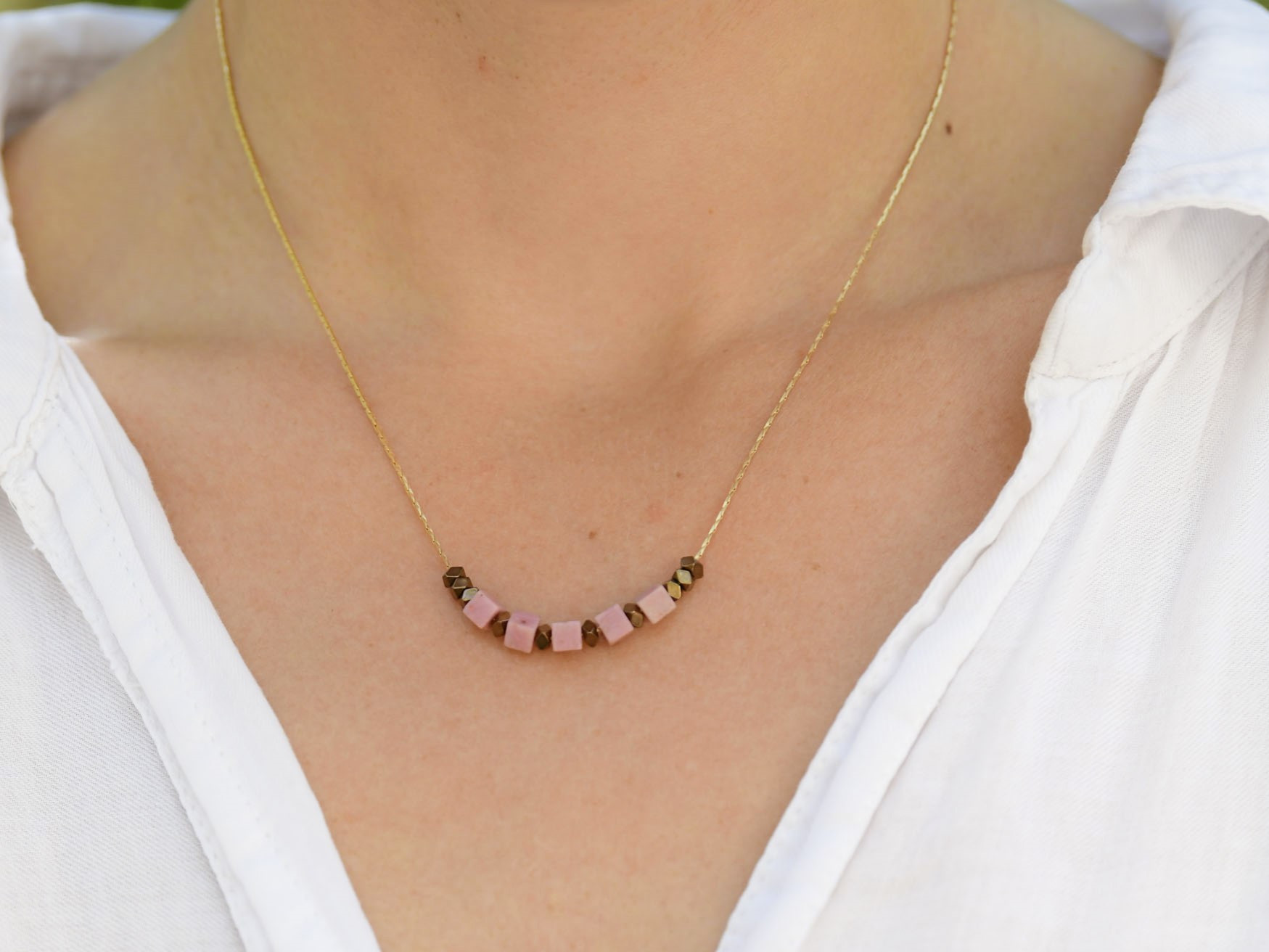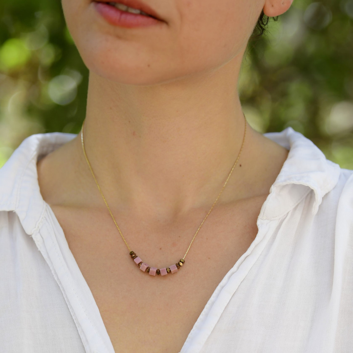 שרשרת עדינה עם שורת קוביות אבני חן ורודות (רודונייט), וביניהן חרוזי המטייט בגימור בגוון נחושת. שרשרת ייחודית בעיצוב גיאומטרי נקי וגוונים כיפיים שמעלים חיוך על הפנים. מושלמת ליומיום וגם לרגעים חגיגיים.
