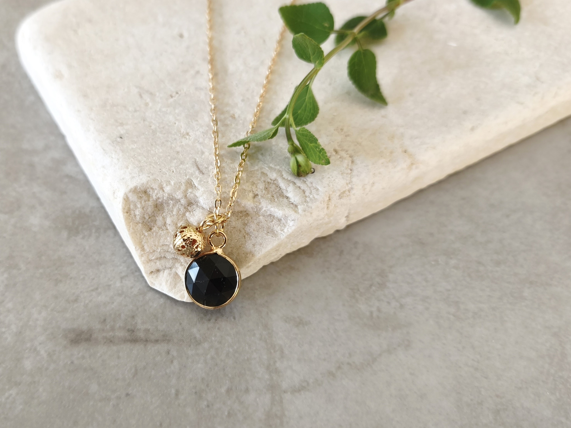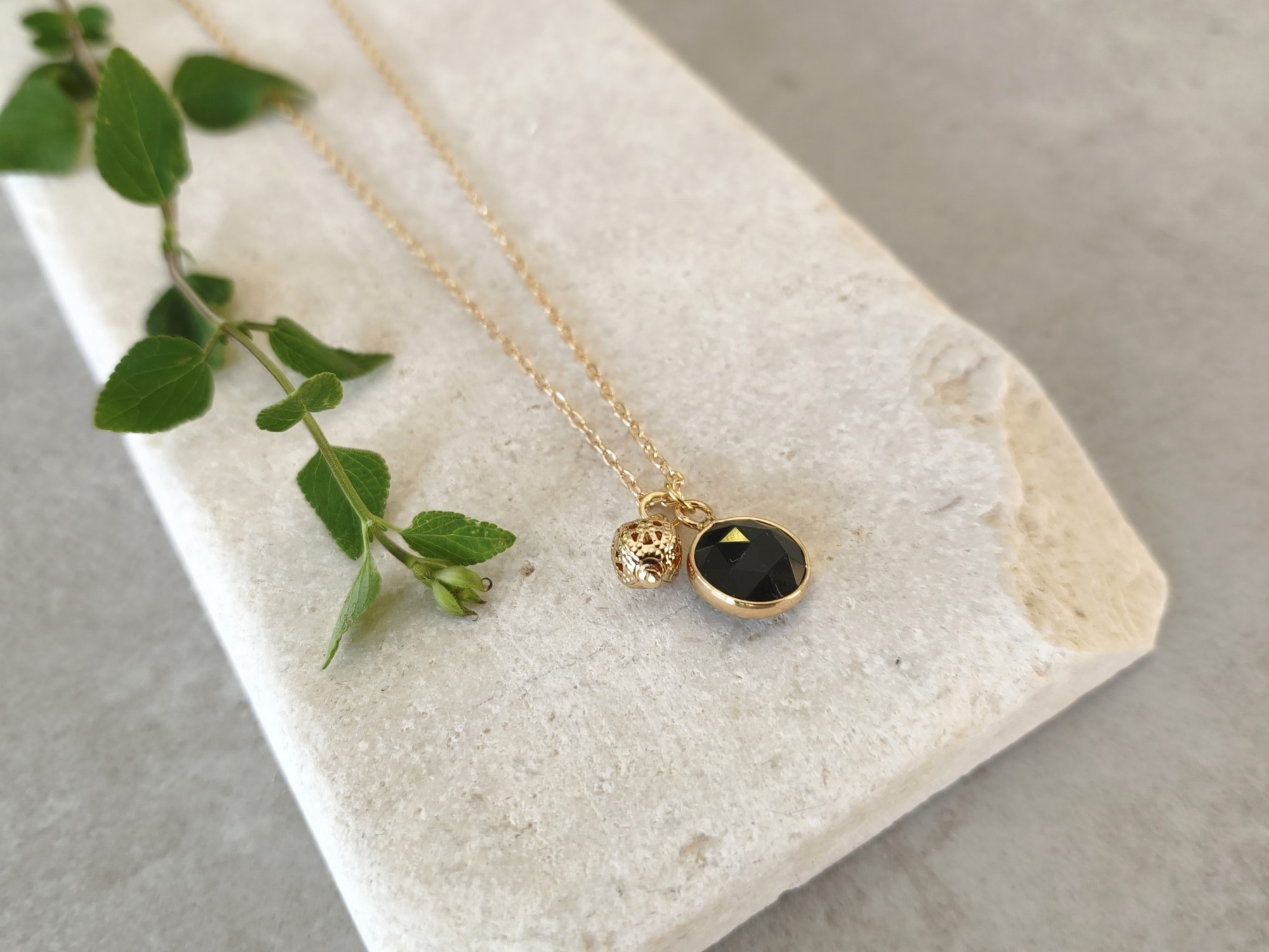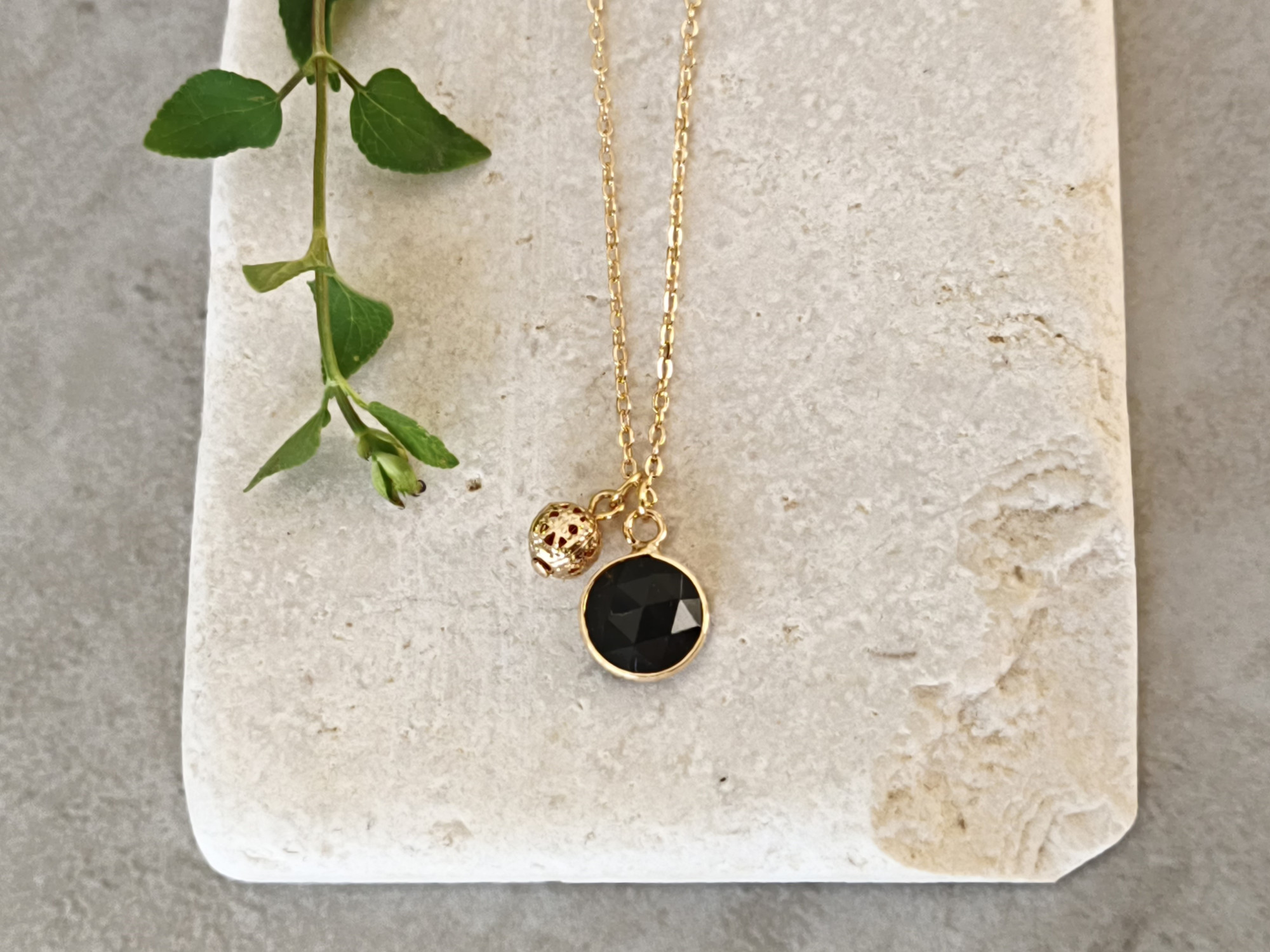 שרשרת עדינה עם תליון אבן אגאט שחורה, וכדור תחרה זהוב.
