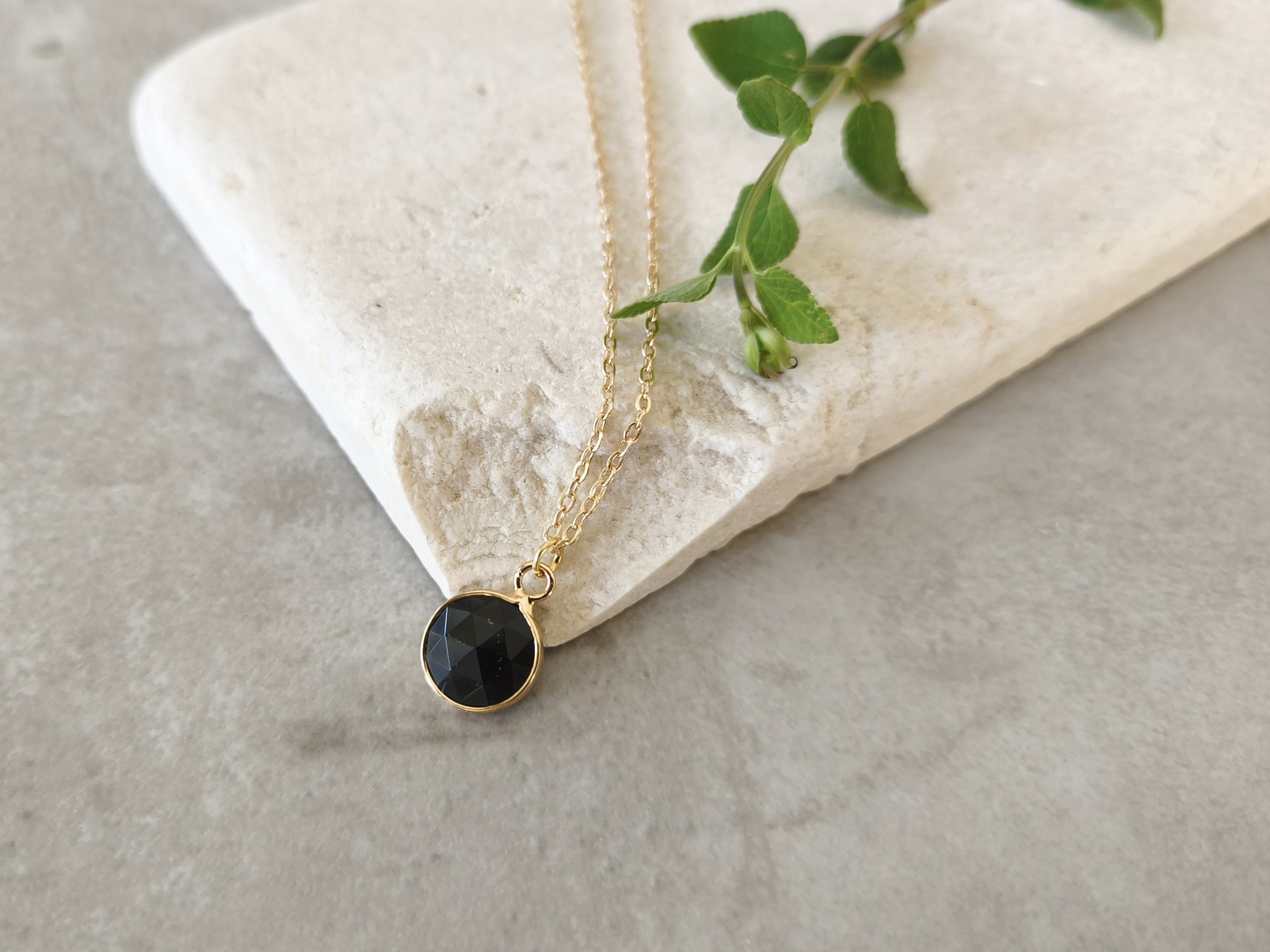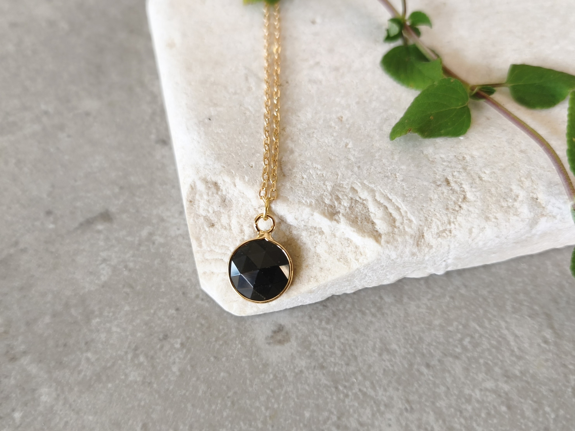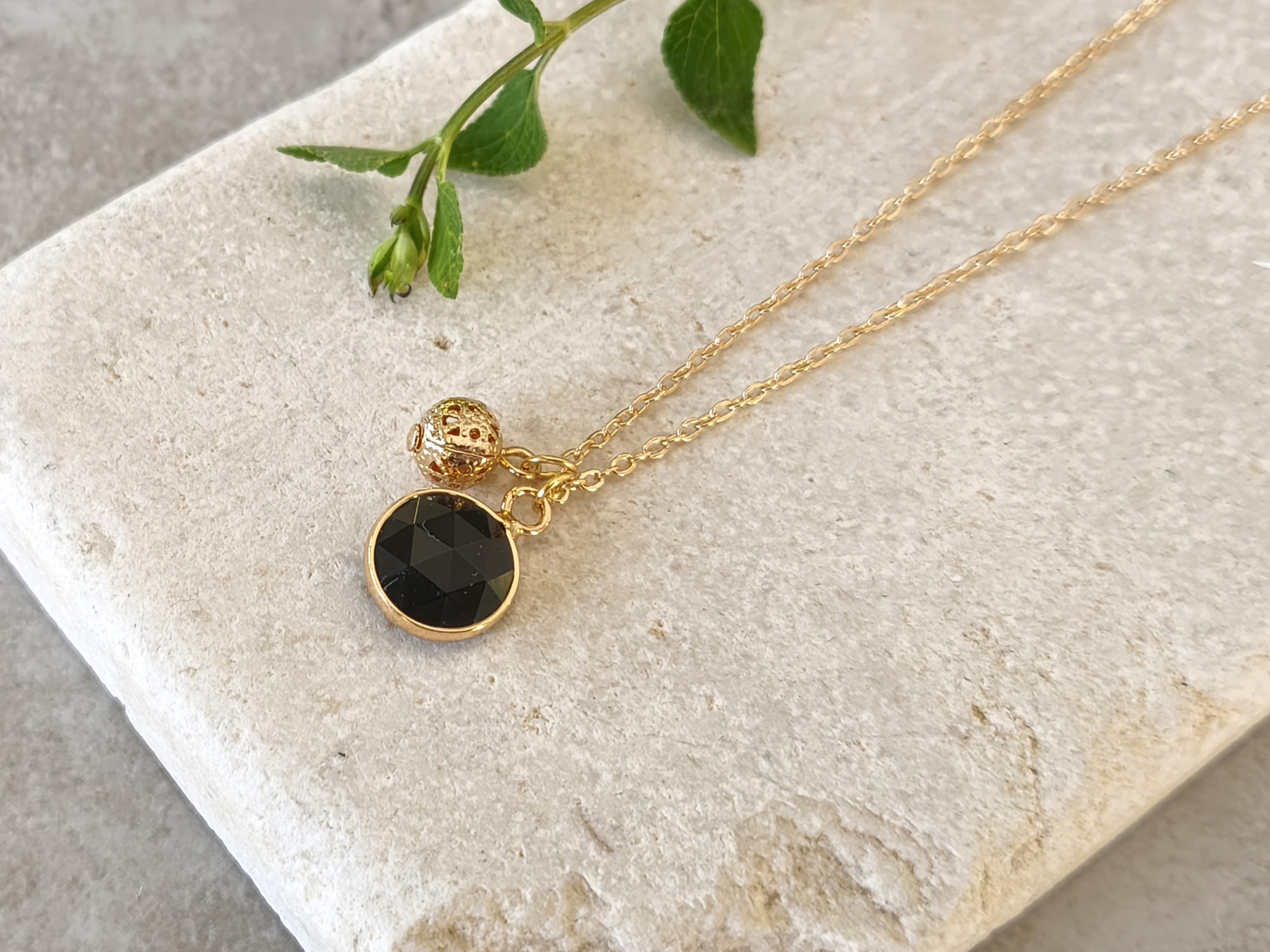 שרשרת עדינה עם תליון אבן אגאט שחורה, וכדור תחרה זהוב.