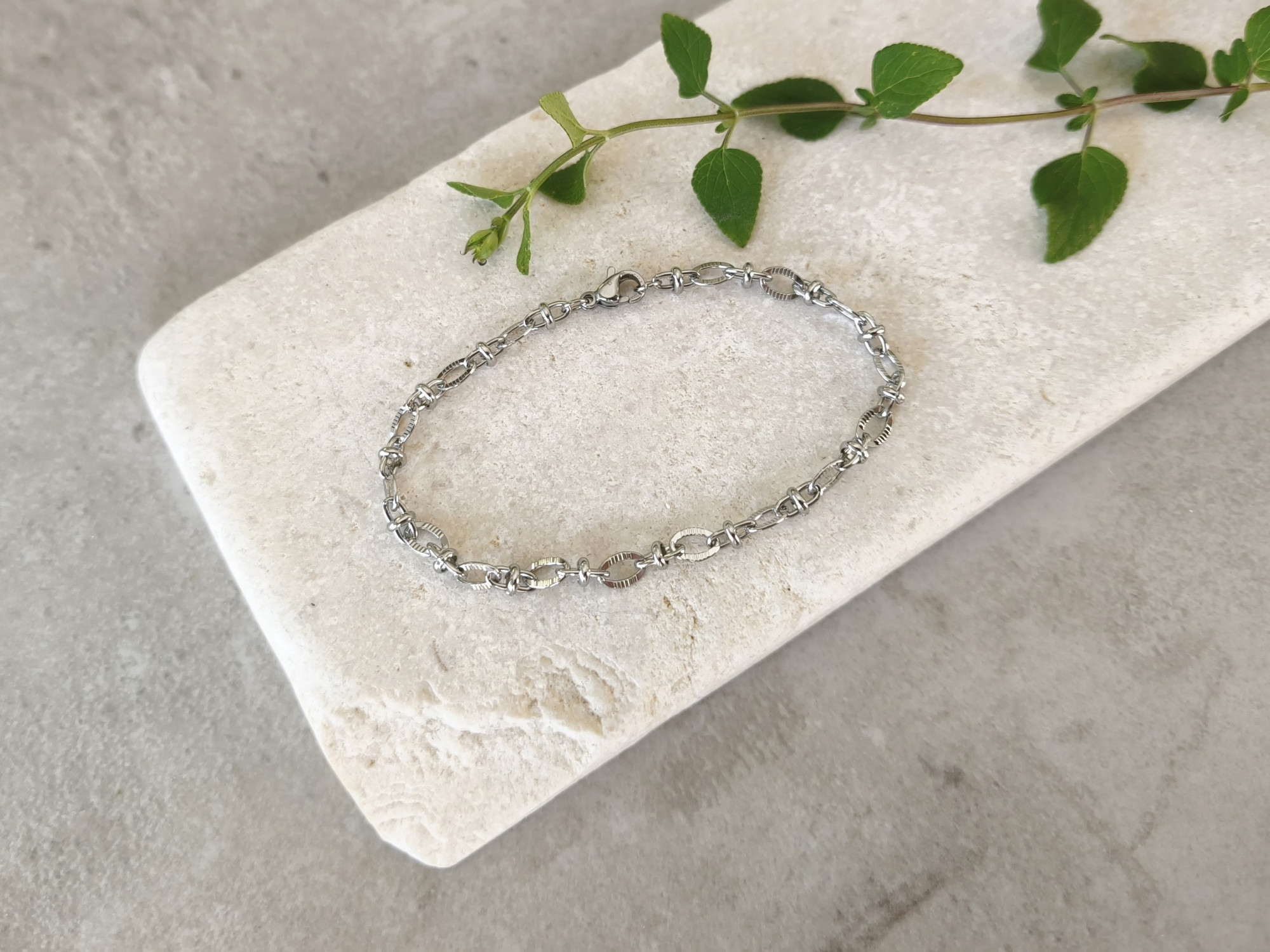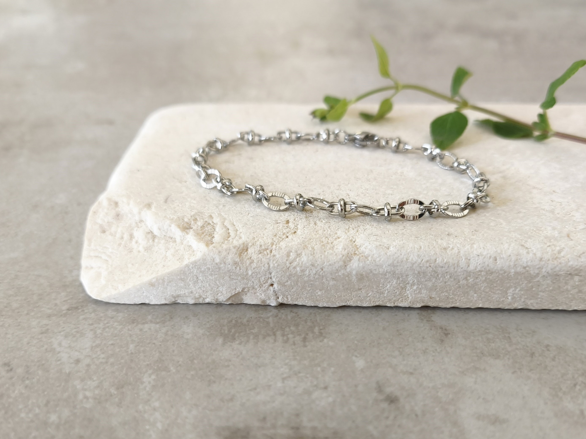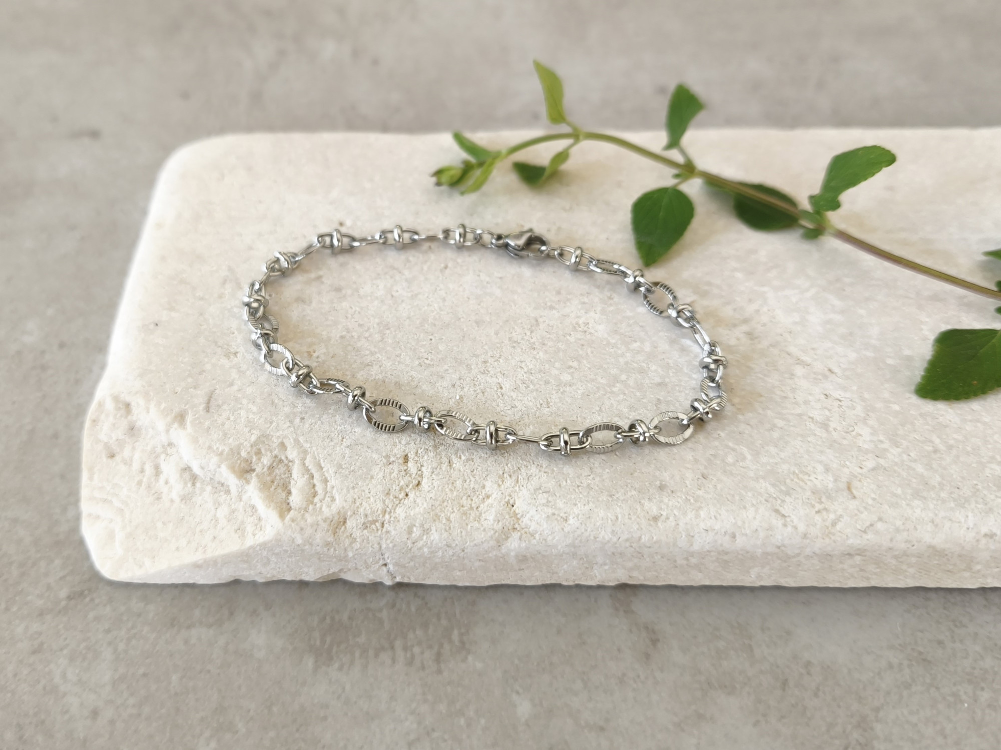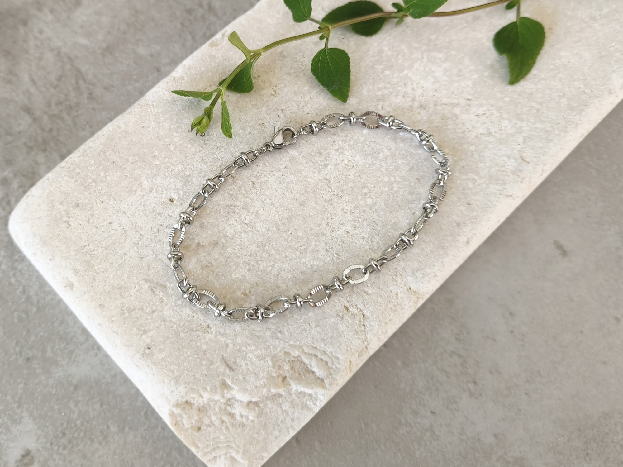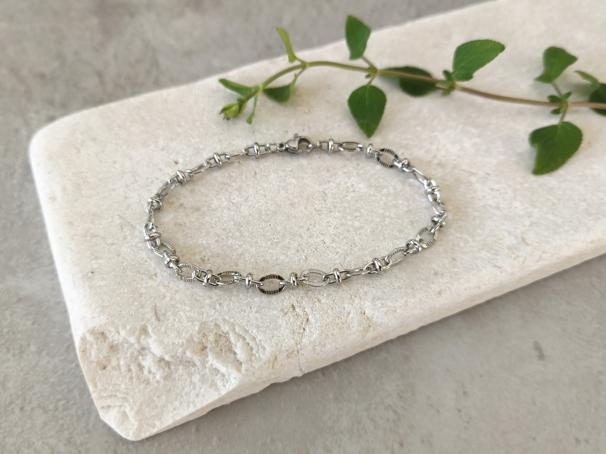 צמיד פלדת אל-חלד, המורכב מחוליות גדולות מעוטרות פסים. צמיד בעל נוכחות, ועם זאת עדין, משדרג כל הופעה ומתאים לכל מצב. מושלם בפני עצמו, וגם בשילוב עם צמידים נוספים. עמיד במים ומתאים לעור רגיש.
