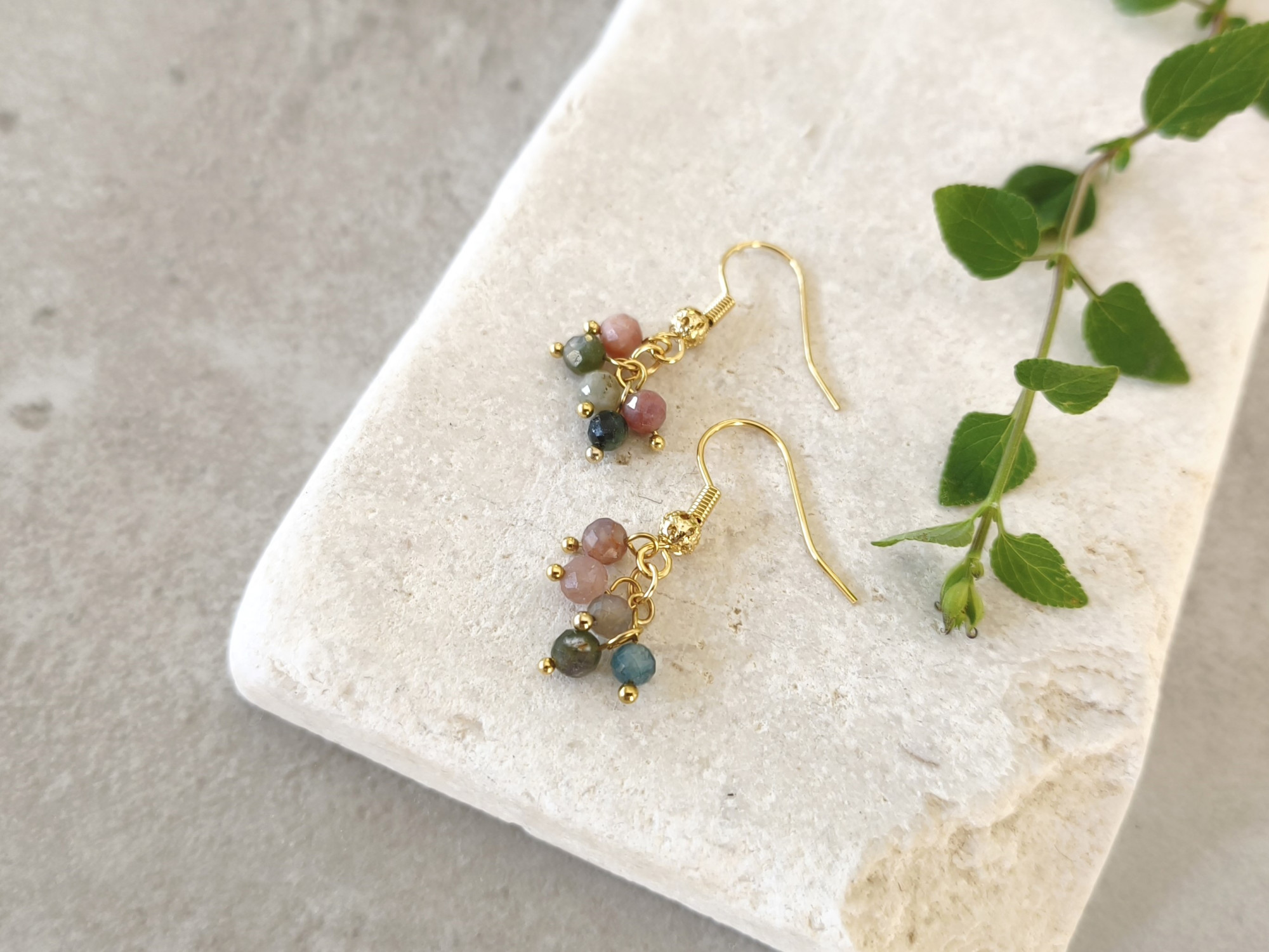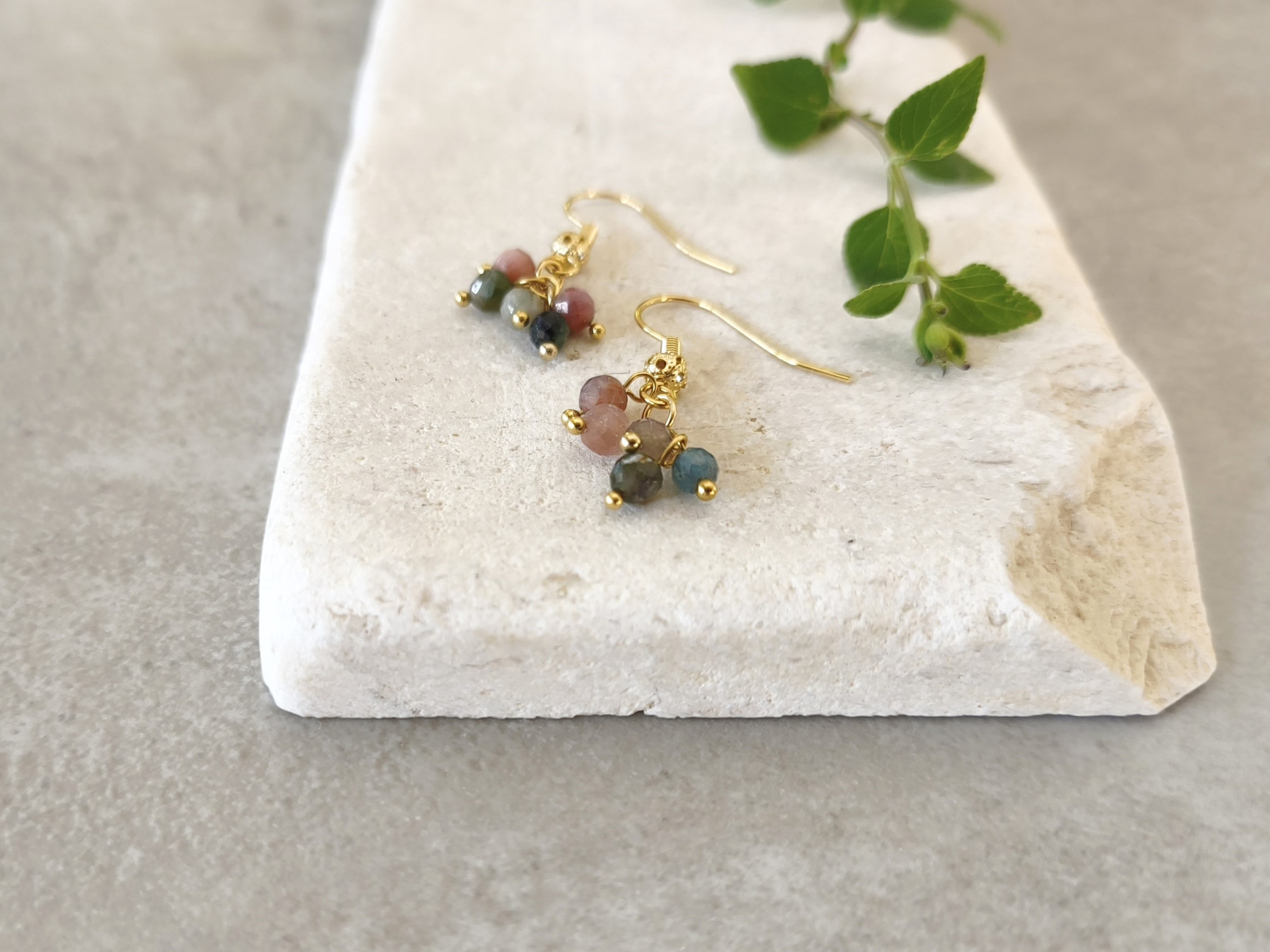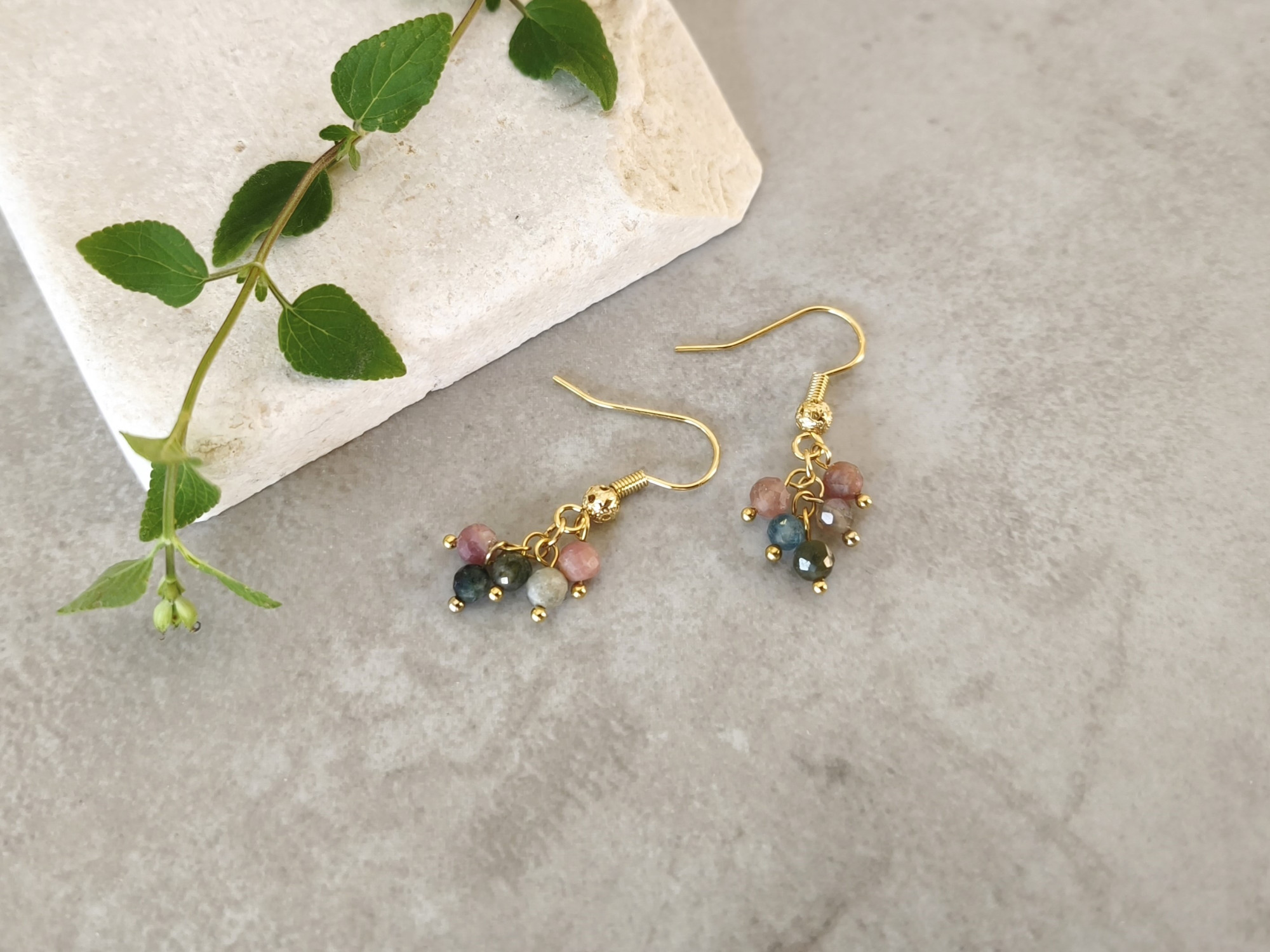 עגילים תלויים עם אשכול חרוזי אבני טורמליין בגווני ורוד וירוק. עגילים קסומים ועדינים, מביאים איתם רוח אביב נעימה בכל יום בשנה.