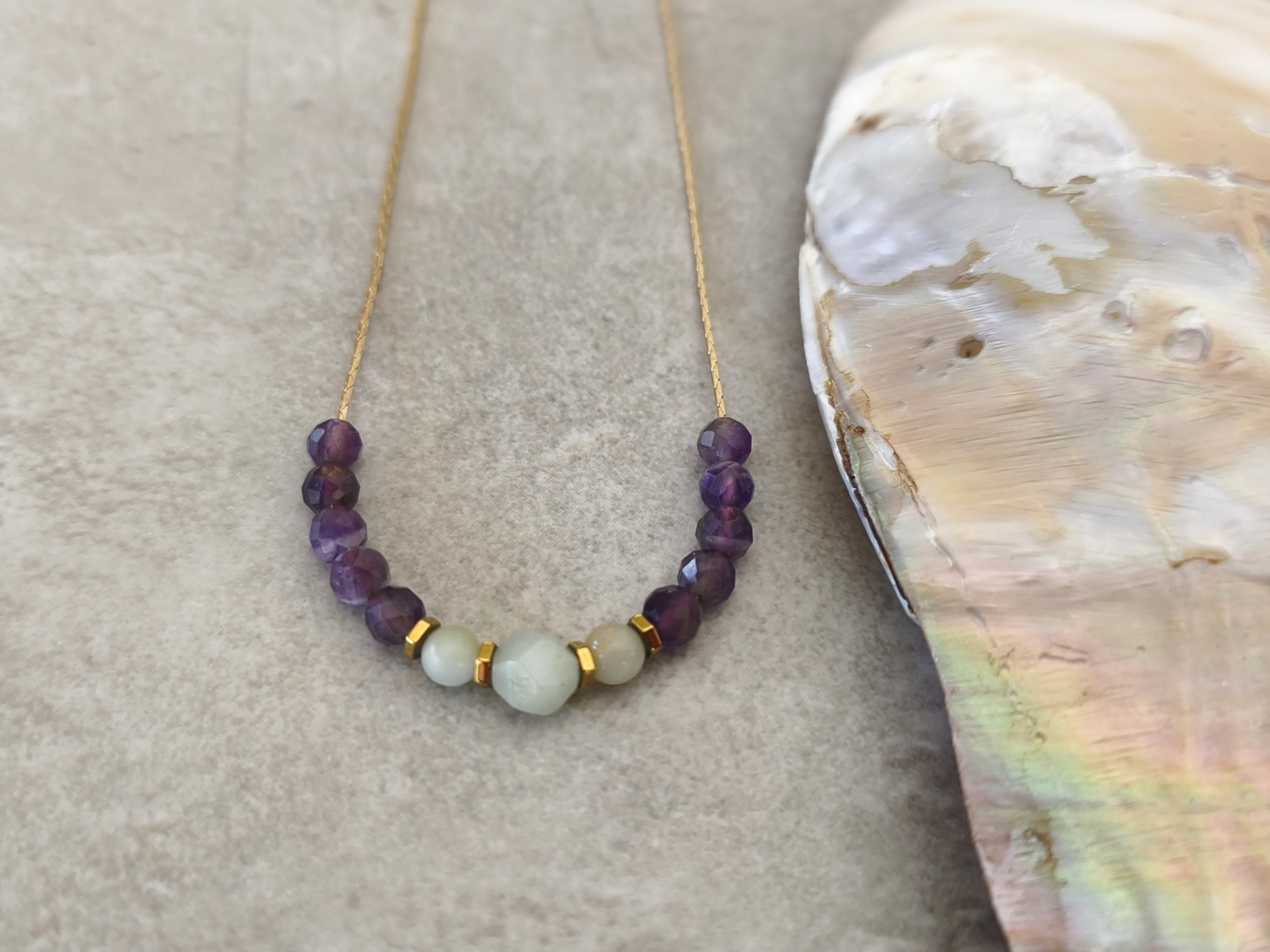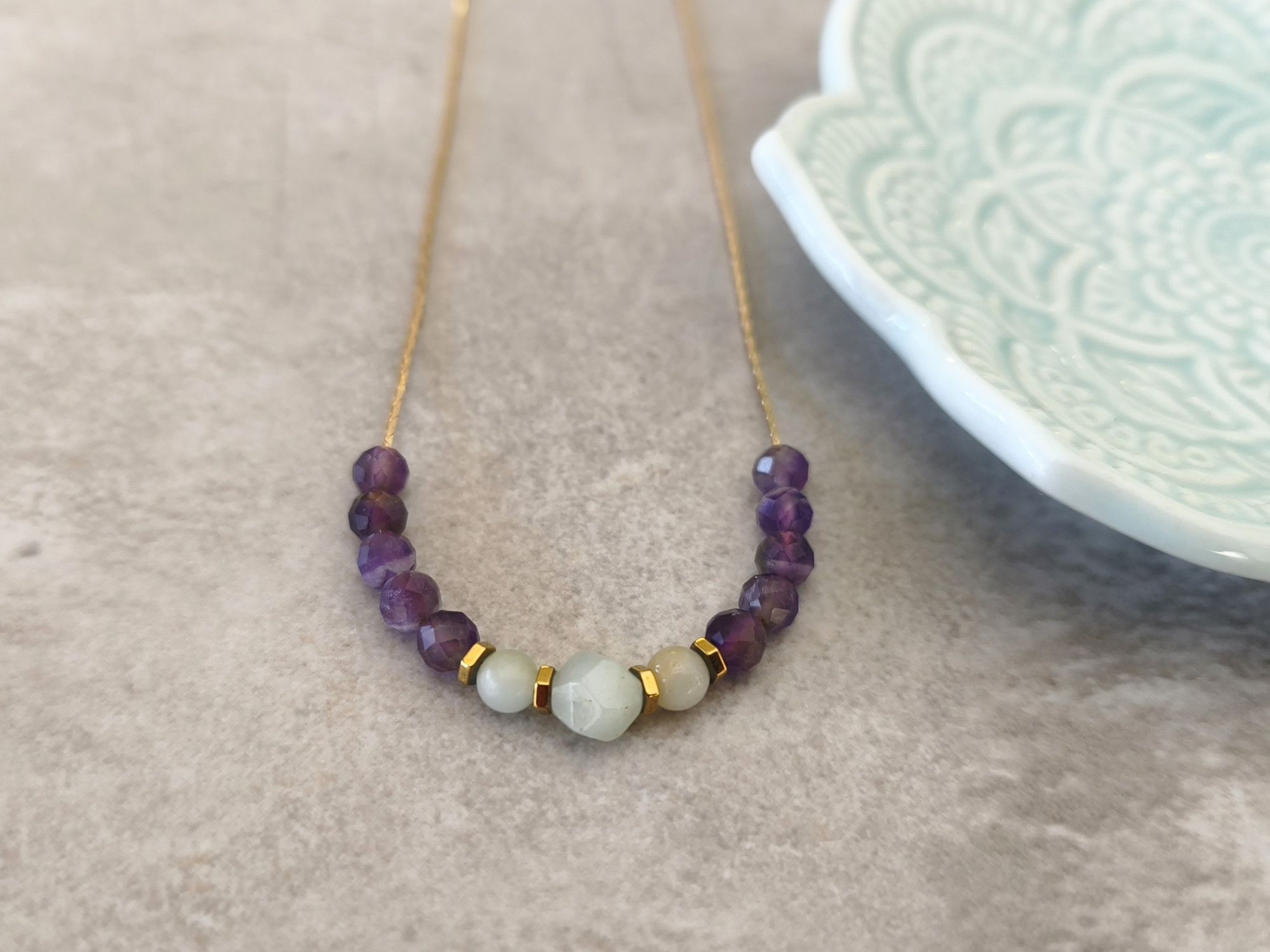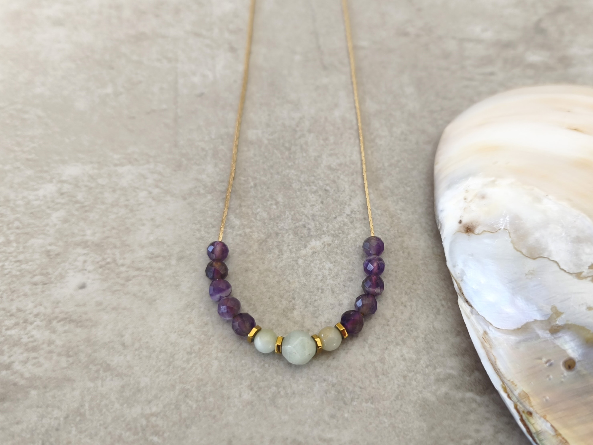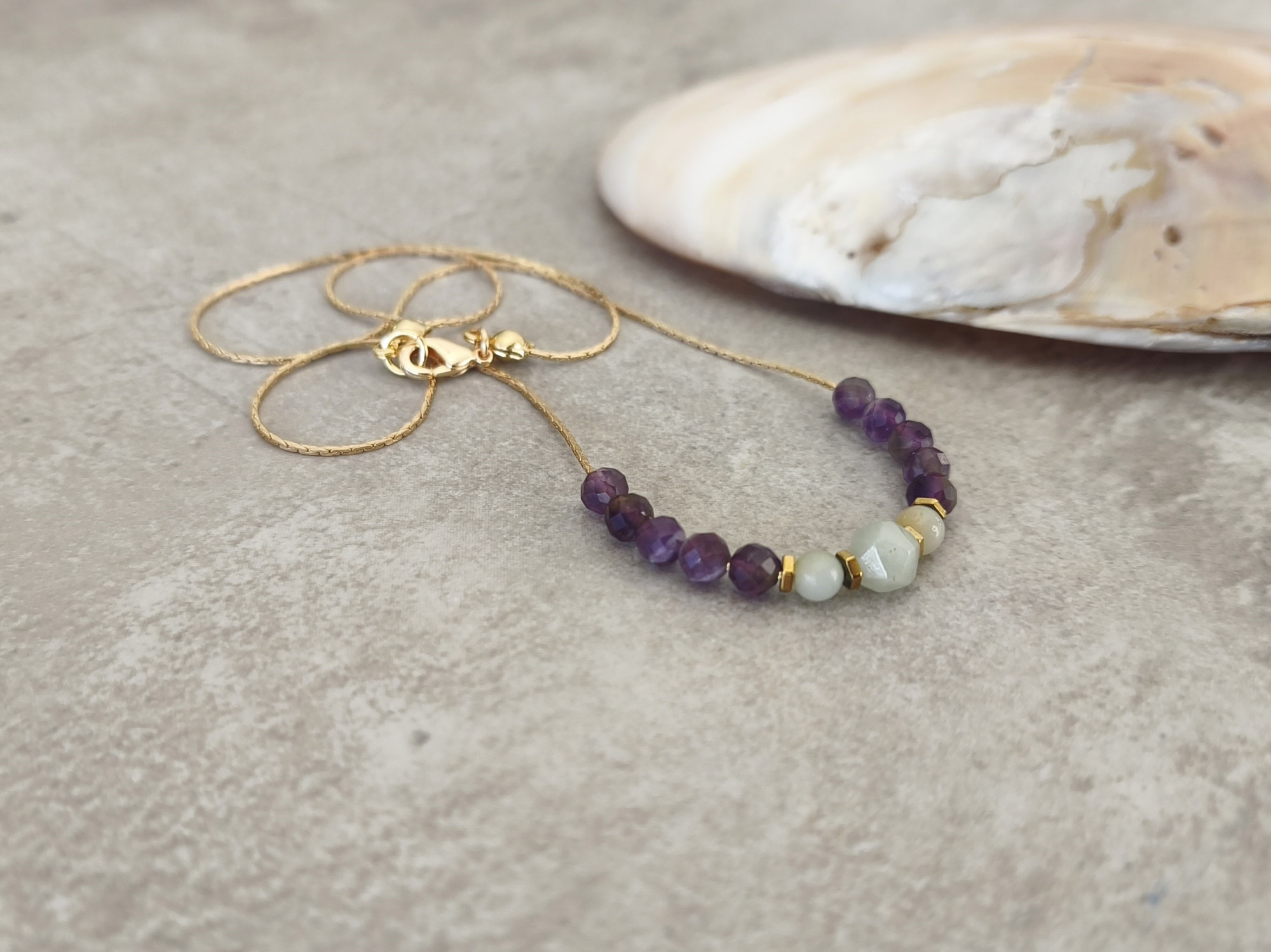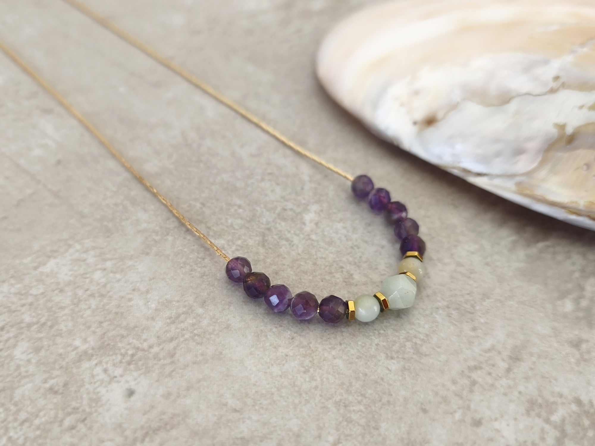 שרשרת עדינה עם שורת חרוזי אמטיסט (סגול) ואמזונייט (תכלת).