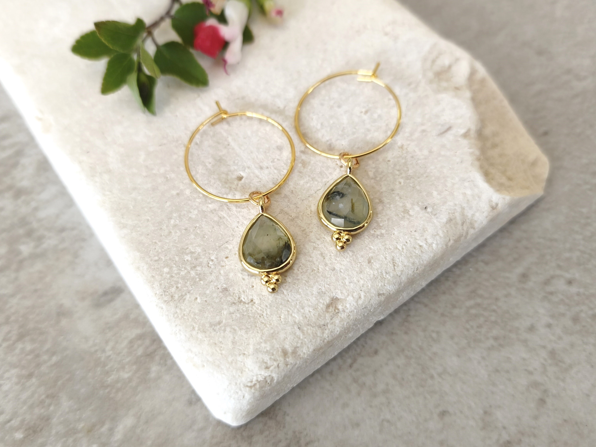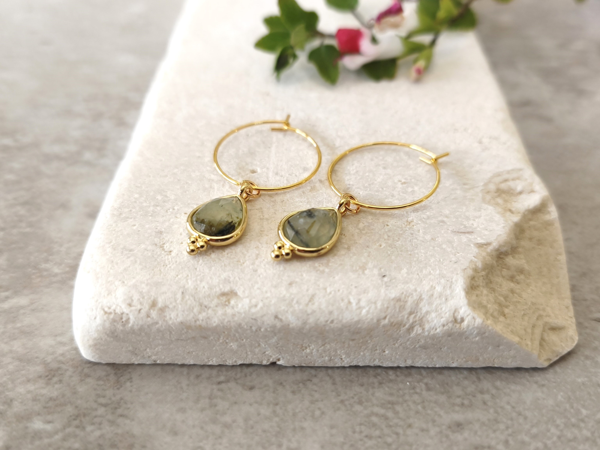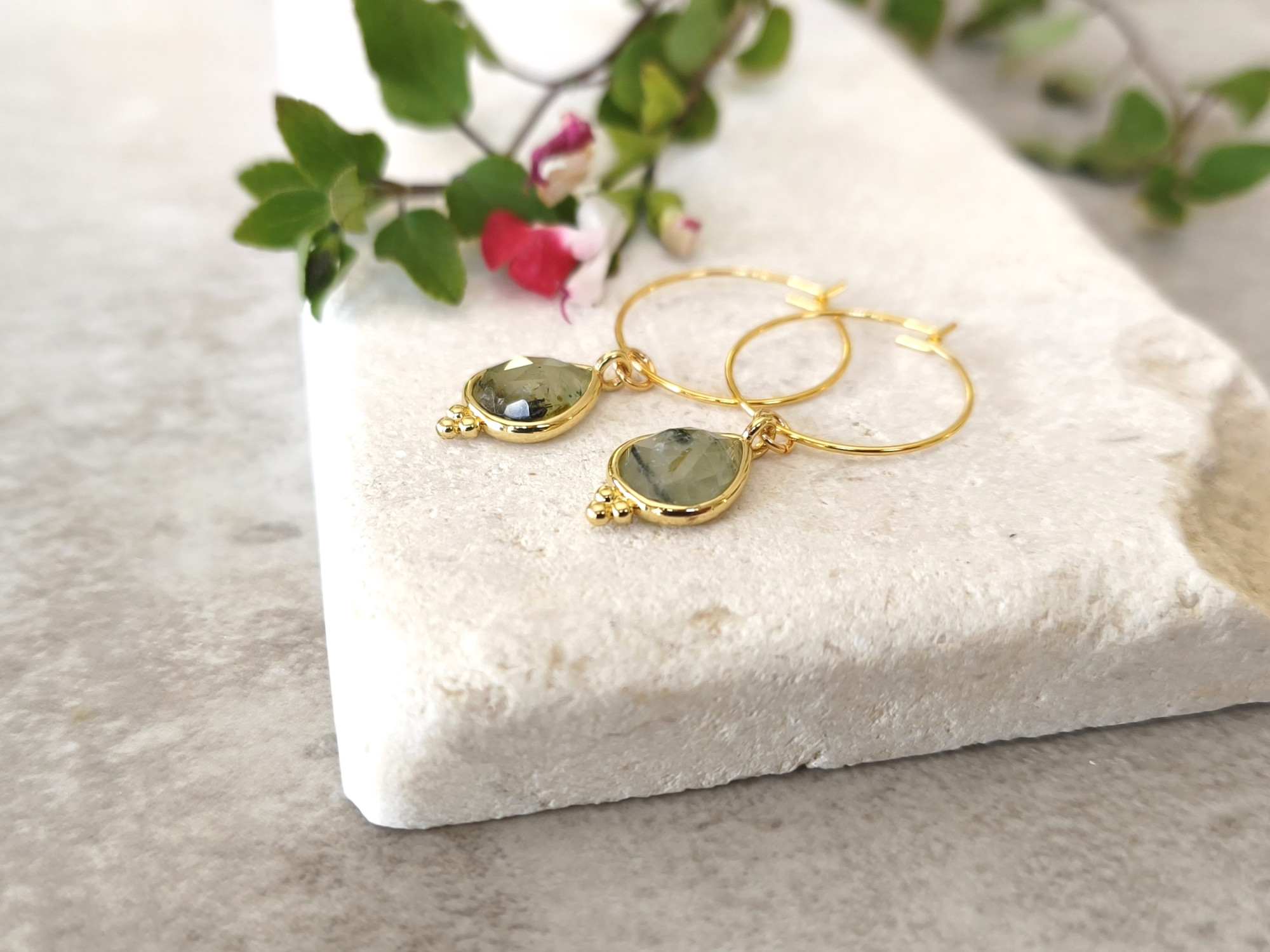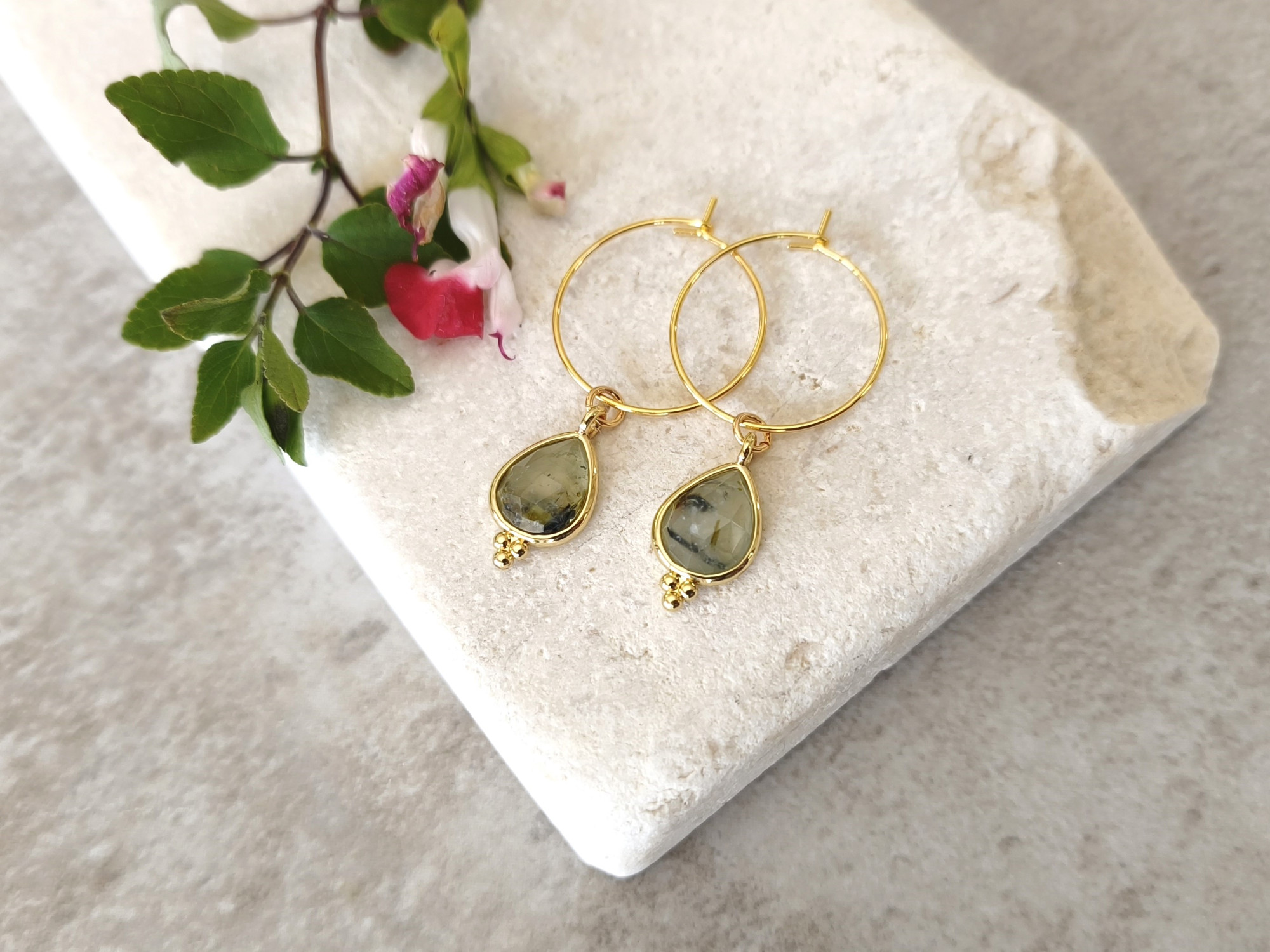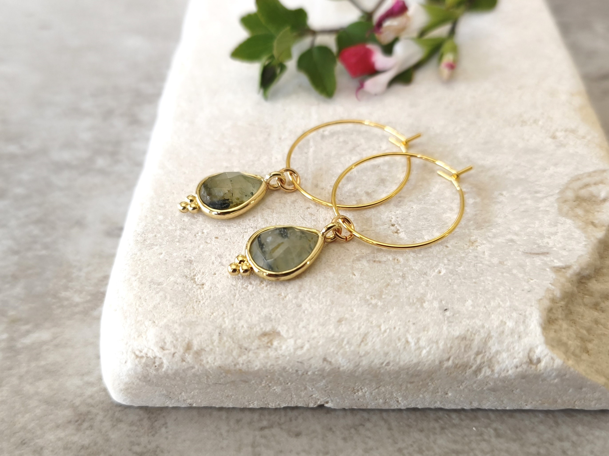 עגילי חישוק קטנים ועדינים עם תליון אבן לברדורייט אפורה.