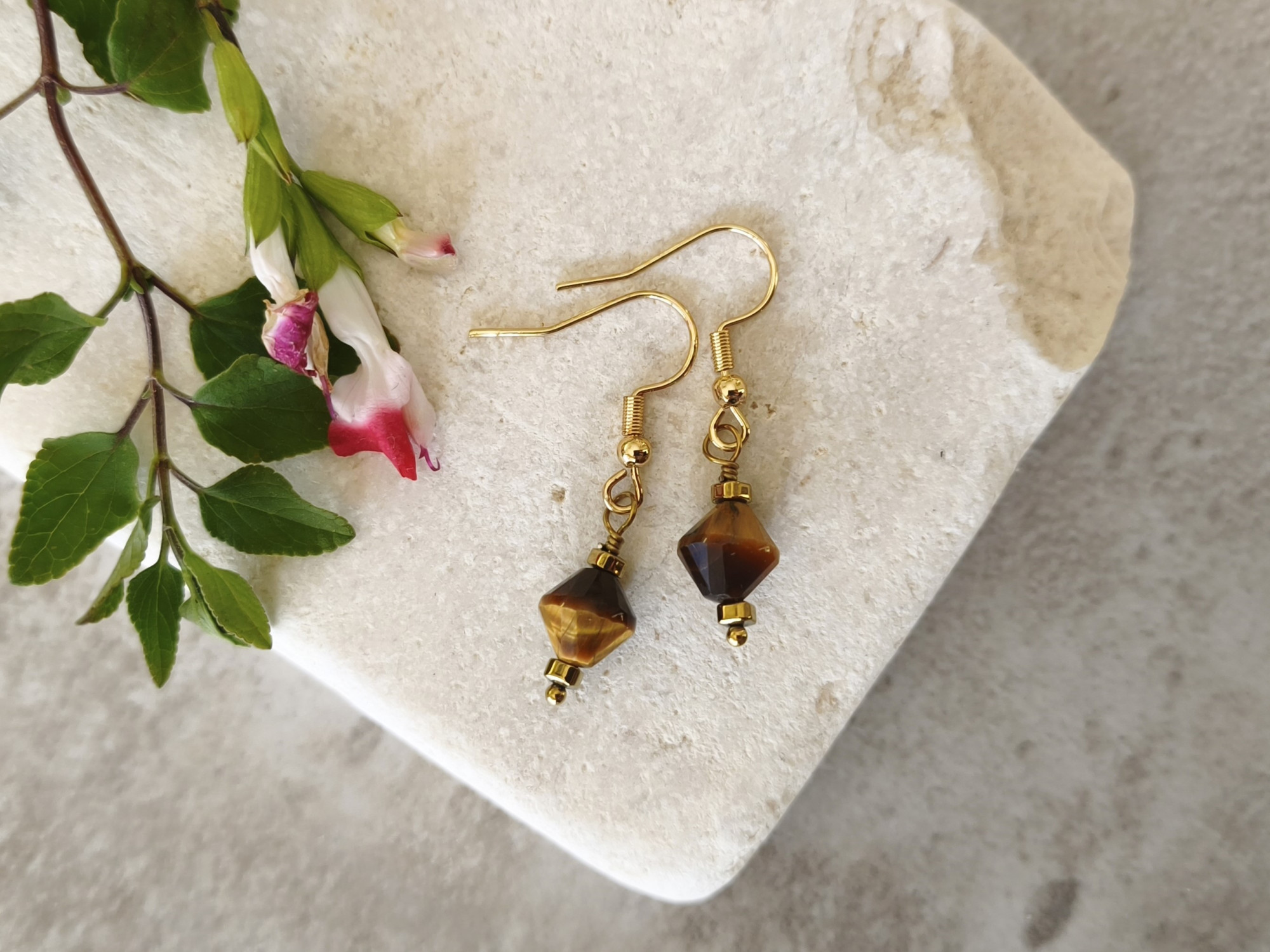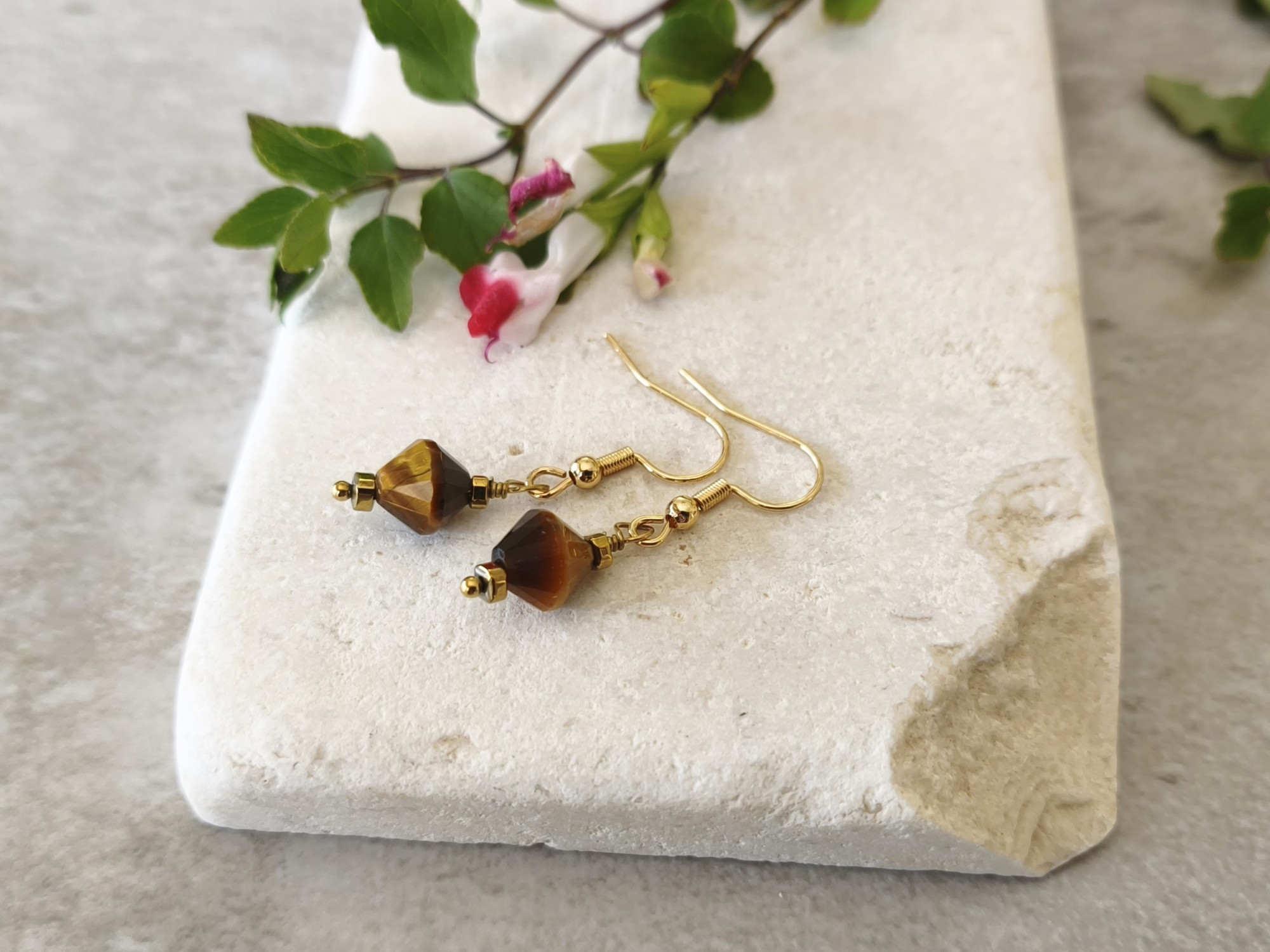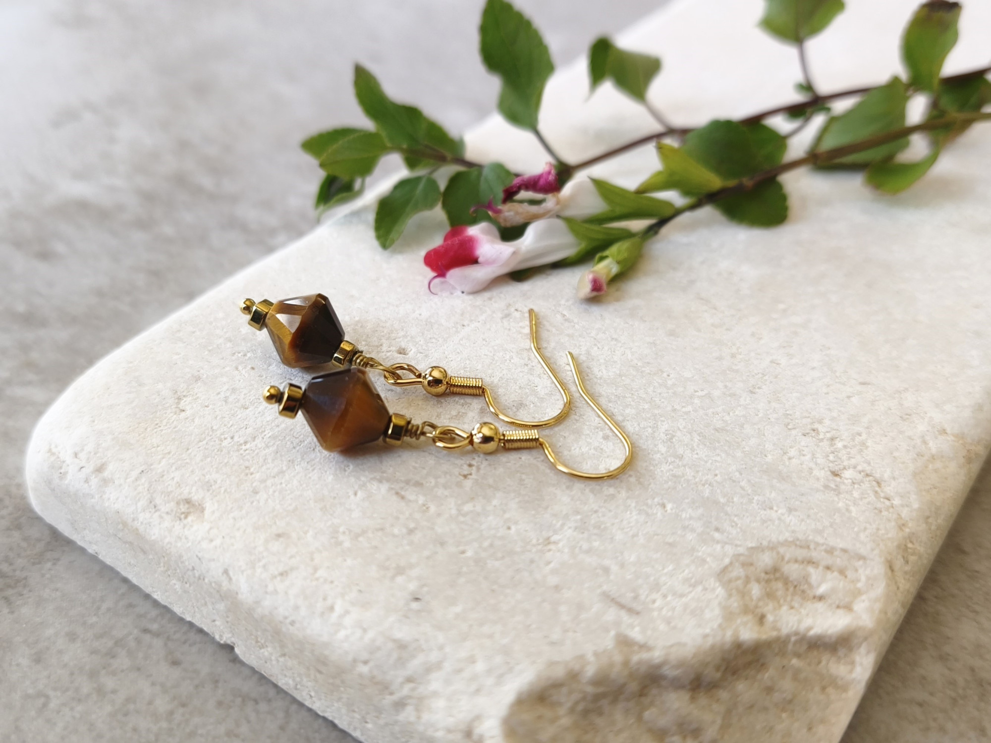 עגילים תלויים עם תליוני אבן עין הנמר (Tyger Eye) בגוון חום. עגילים עדינים בעיצוב גאומטרי ומינימליסטי שמדגיש את האופי והגוונים הנהדרים של האבן.