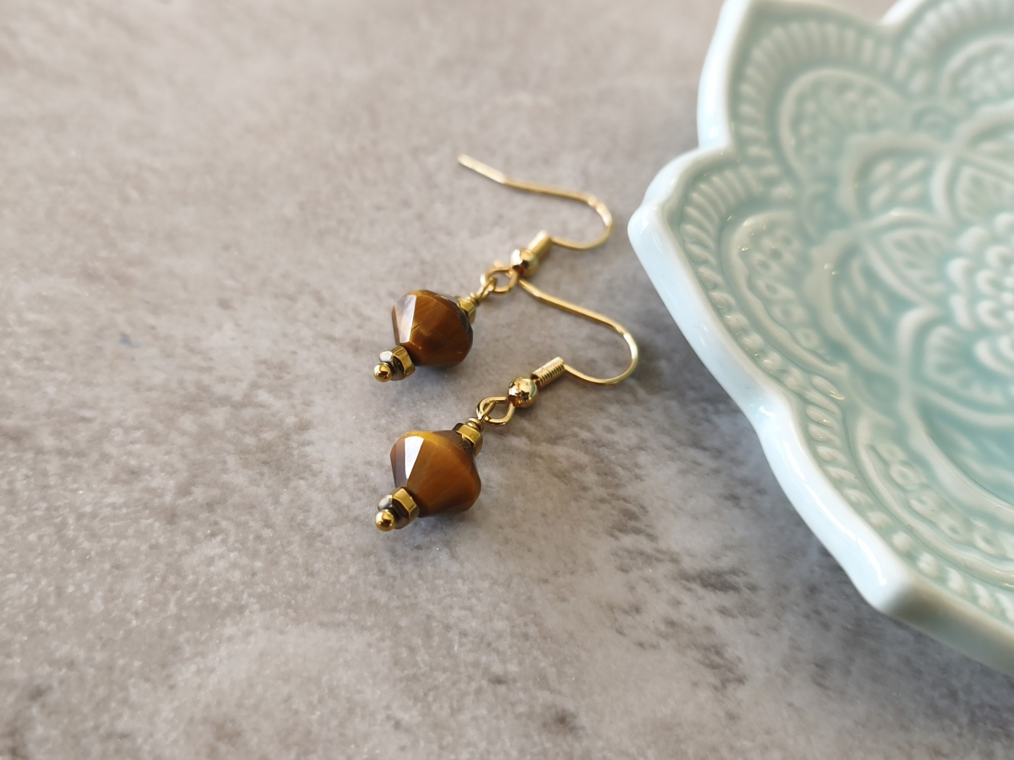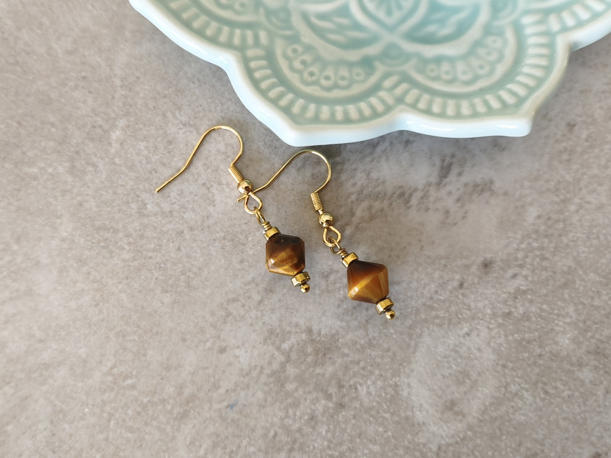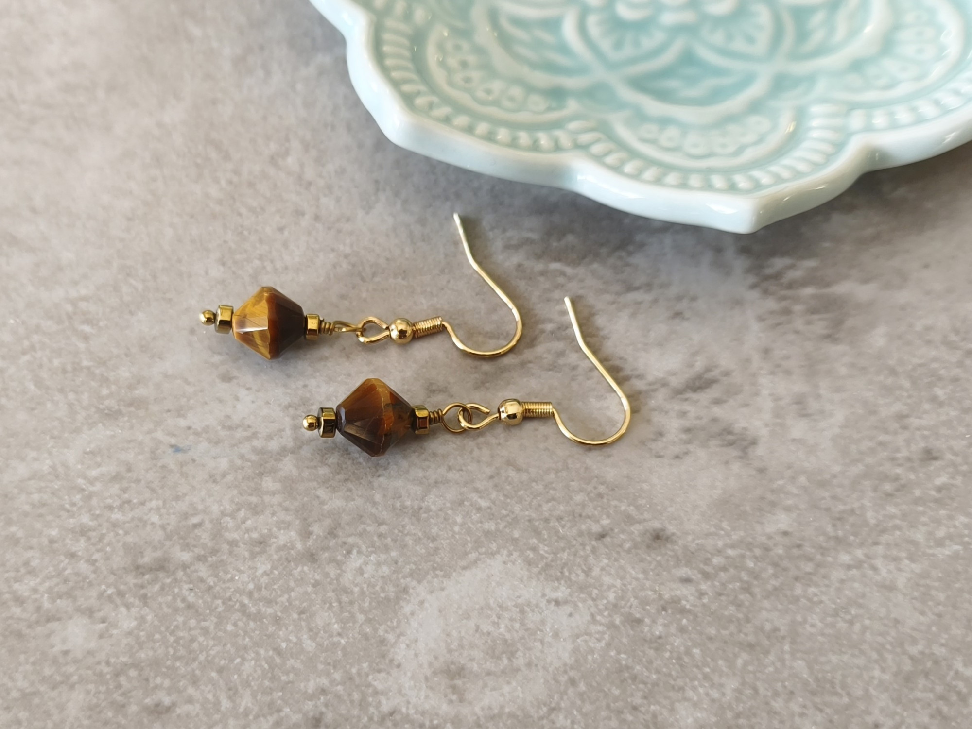 עגילים תלויים עם תליוני אבן עין הנמר (Tyger Eye) בגוון חום. עגילים עדינים בעיצוב גאומטרי ומינימליסטי שמדגיש את האופי והגוונים הנהדרים של האבן.