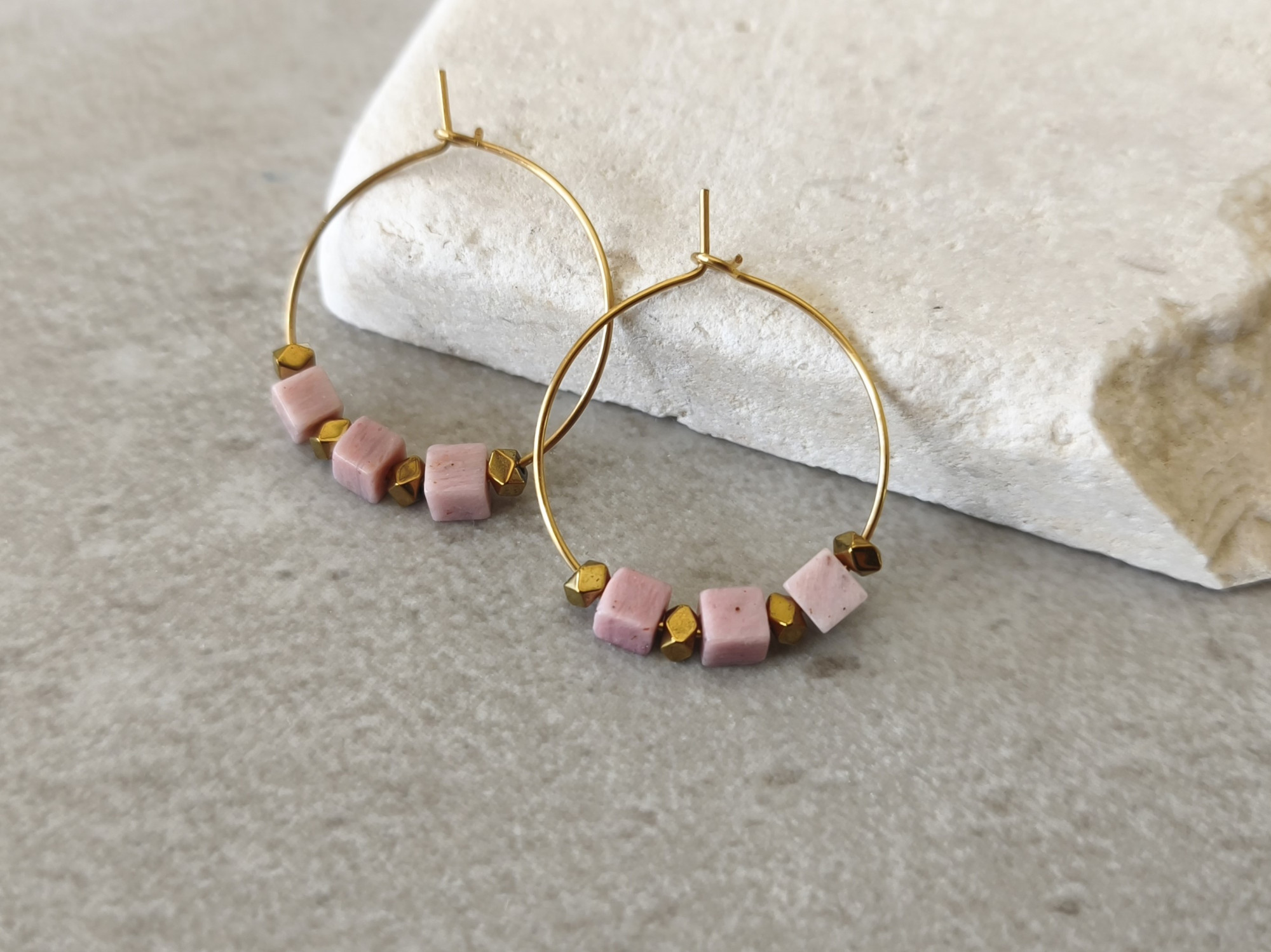 החרוזים הוורודים עשויים מאבן רודונייט טבעית.