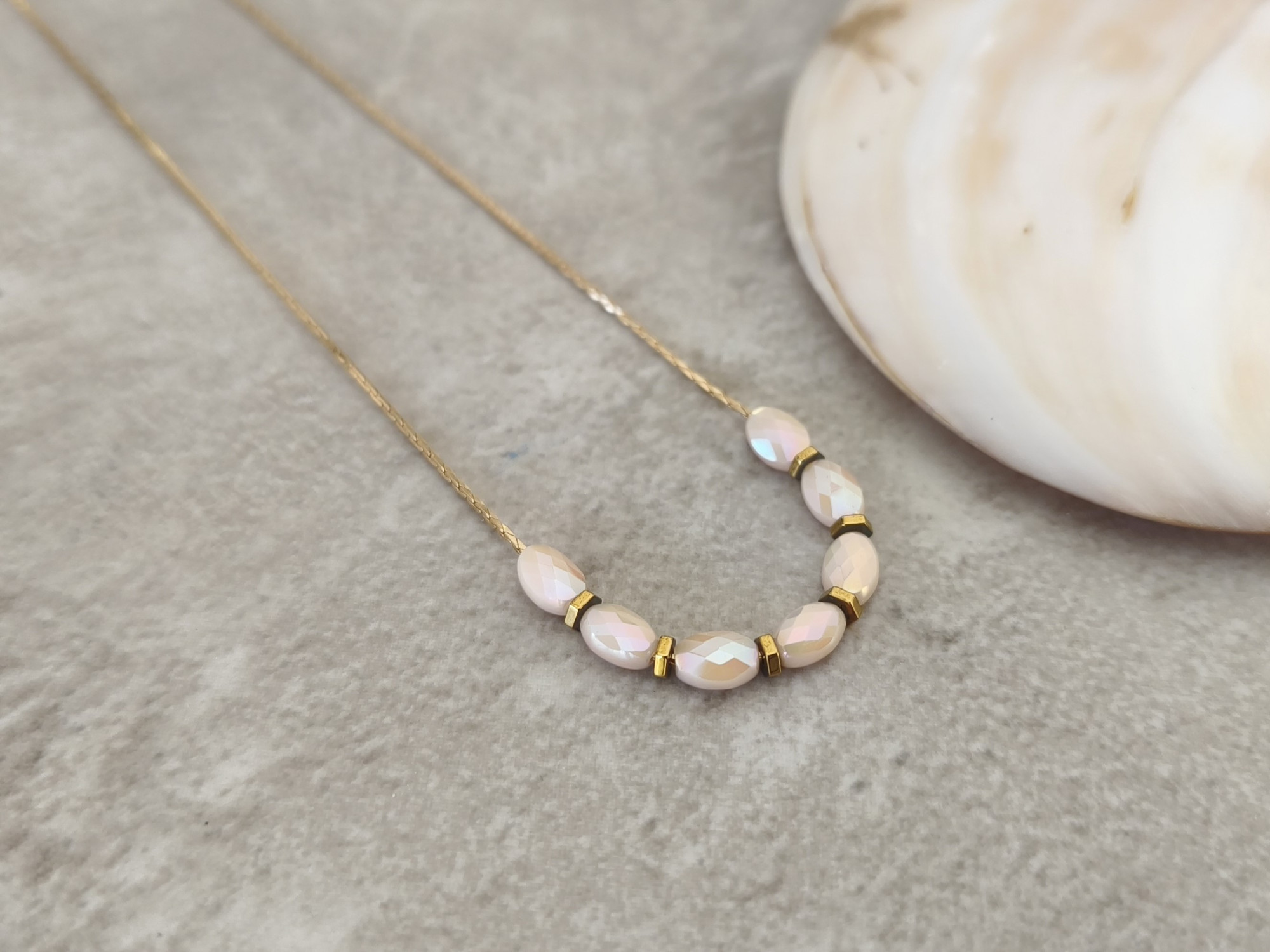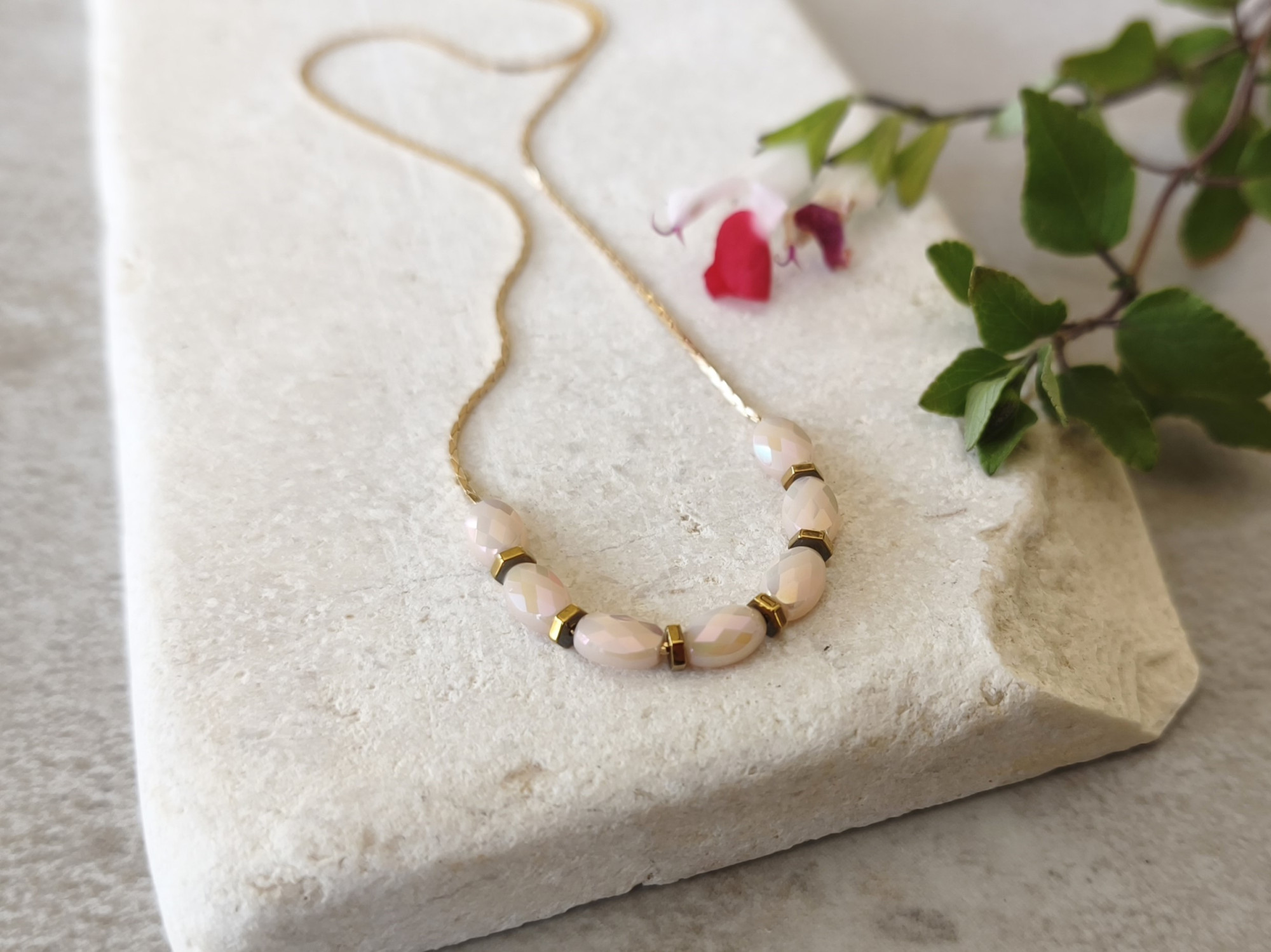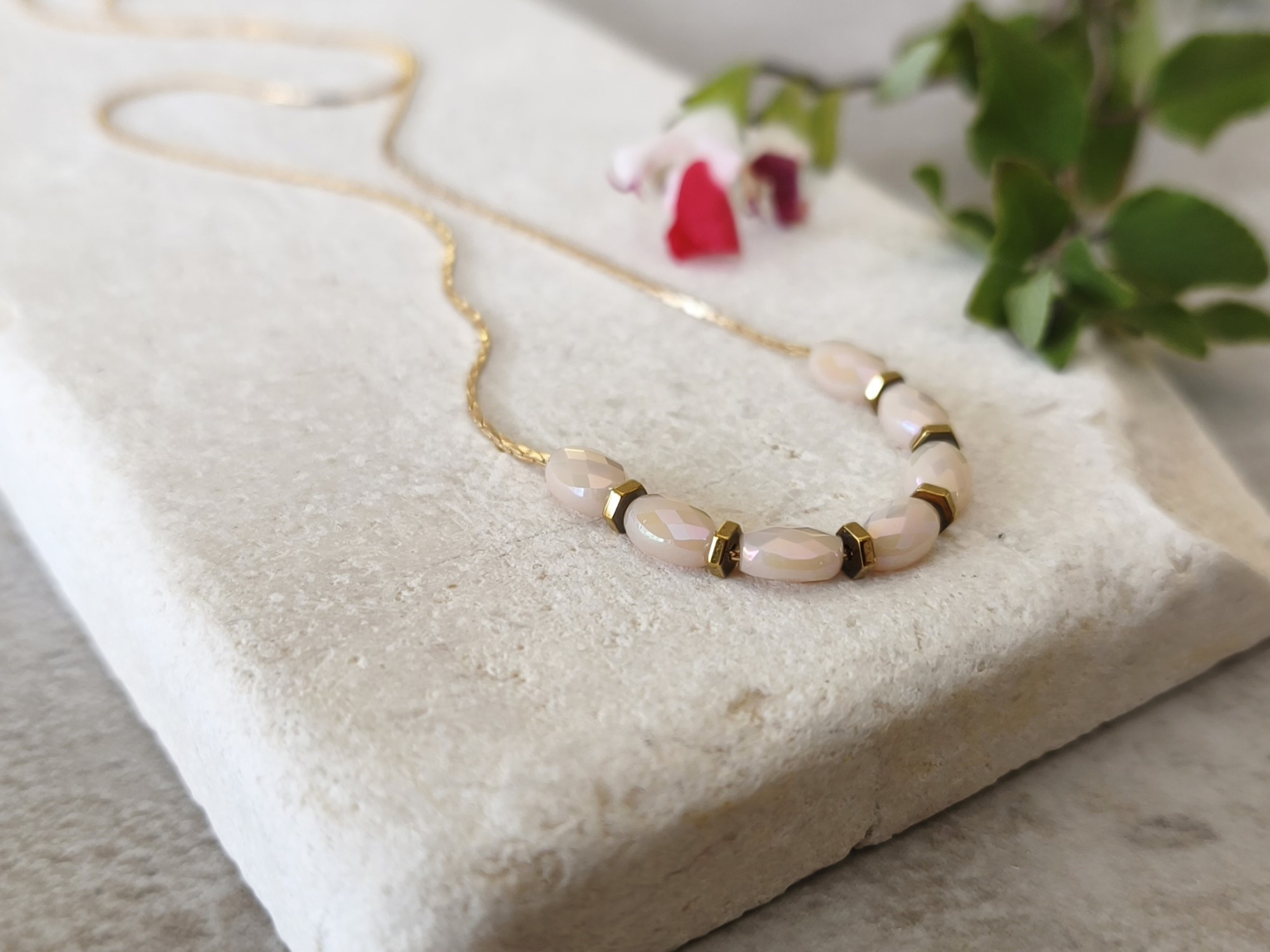 שרשרת דקיקה ועדינה עם שורת חרוזי זכוכית בגוון קרם, בשילוב חרוזי המטייט (אבן טבעית) בגוון נחושת.