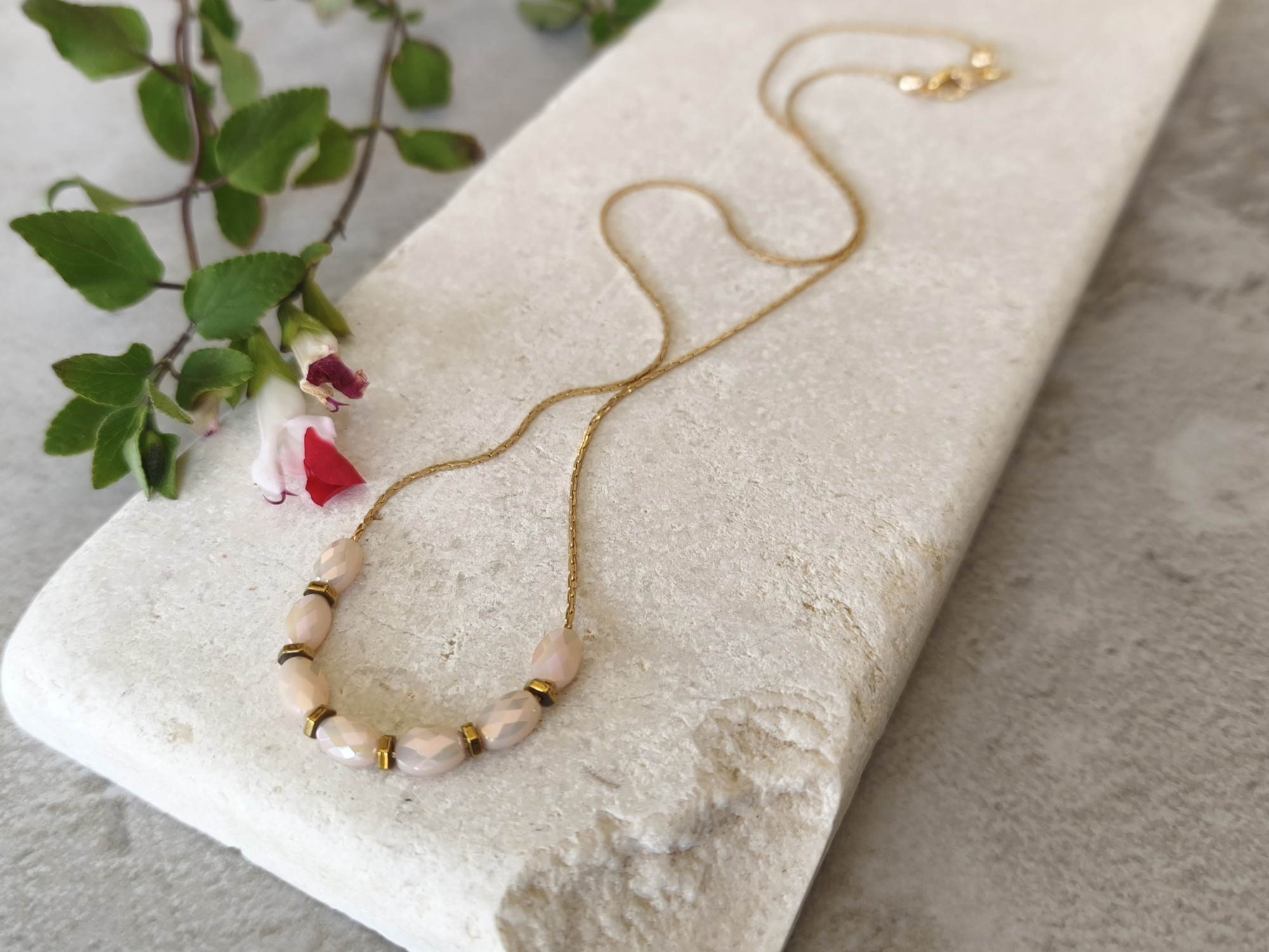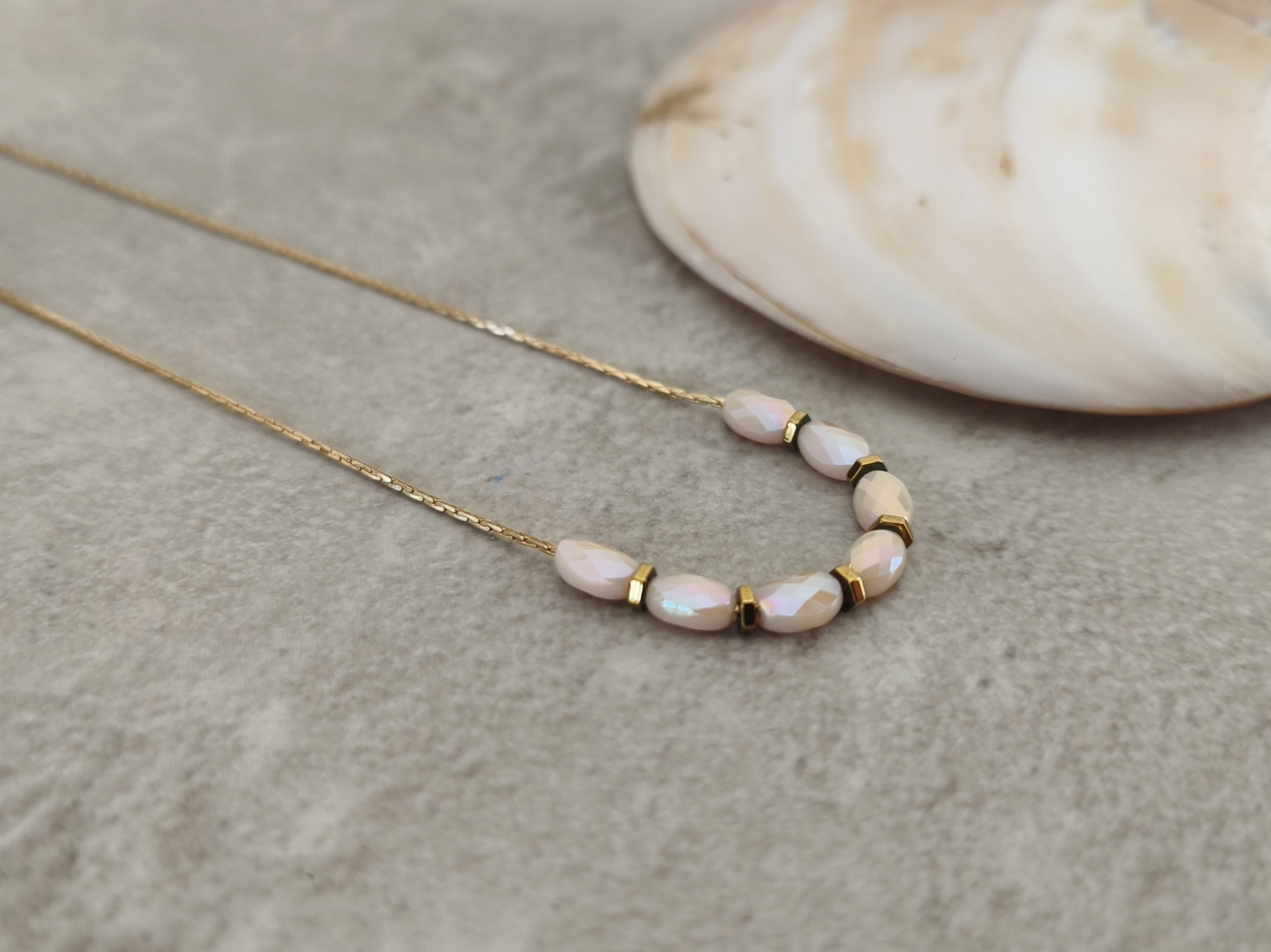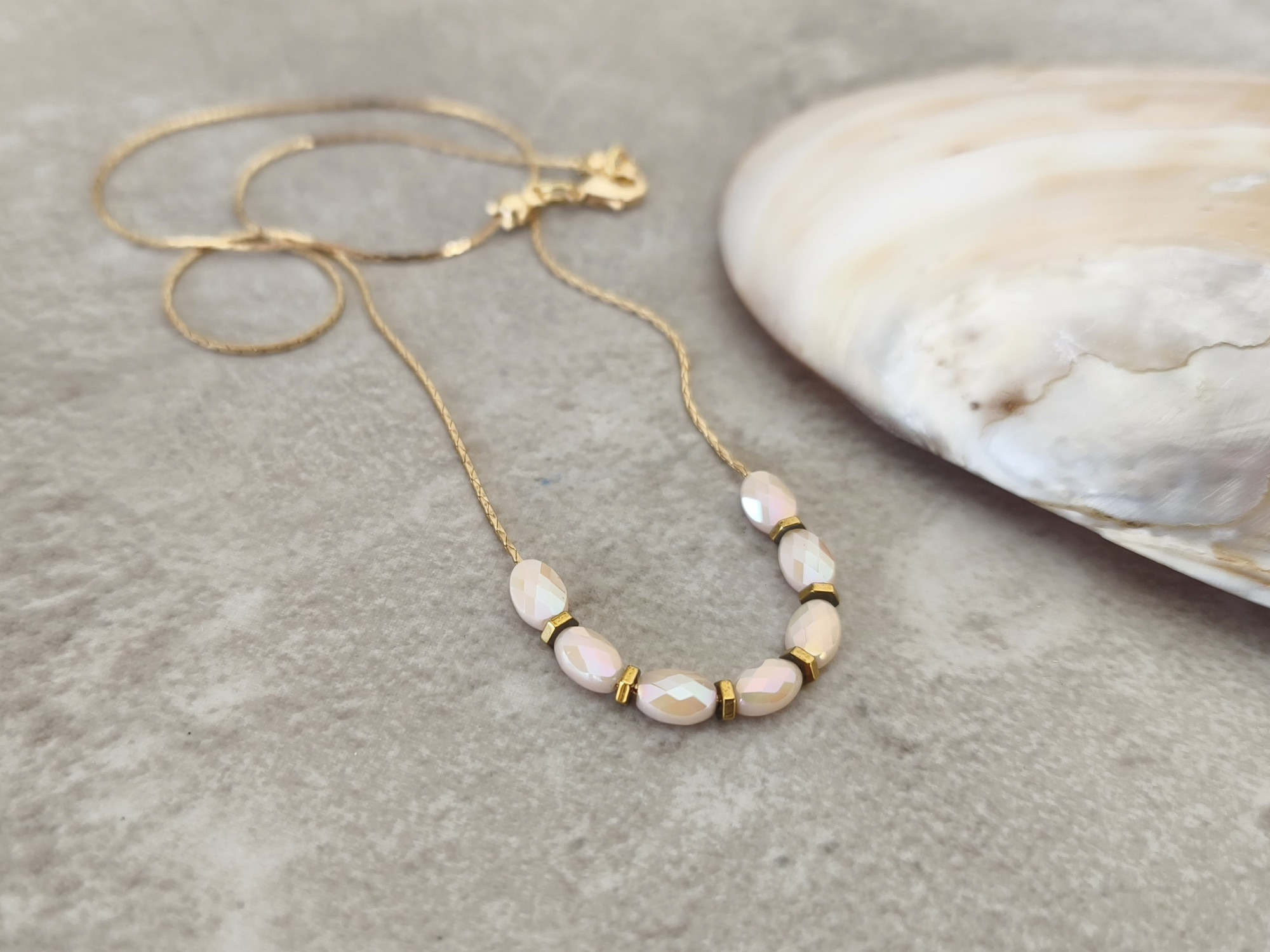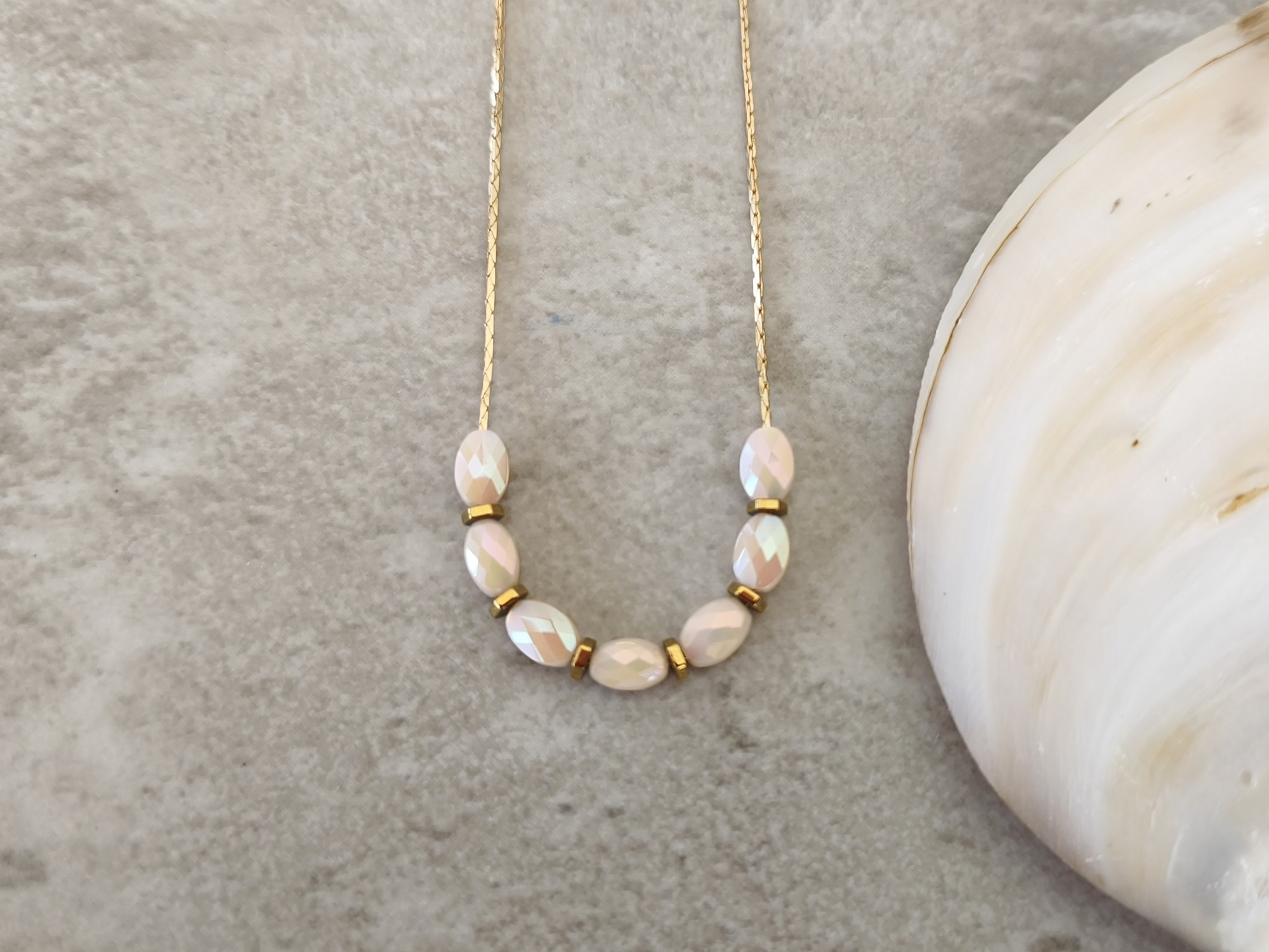 שרשרת דקיקה ועדינה עם שורת חרוזי זכוכית בגוון קרם, בשילוב חרוזי המטייט (אבן טבעית) בגוון נחושת.