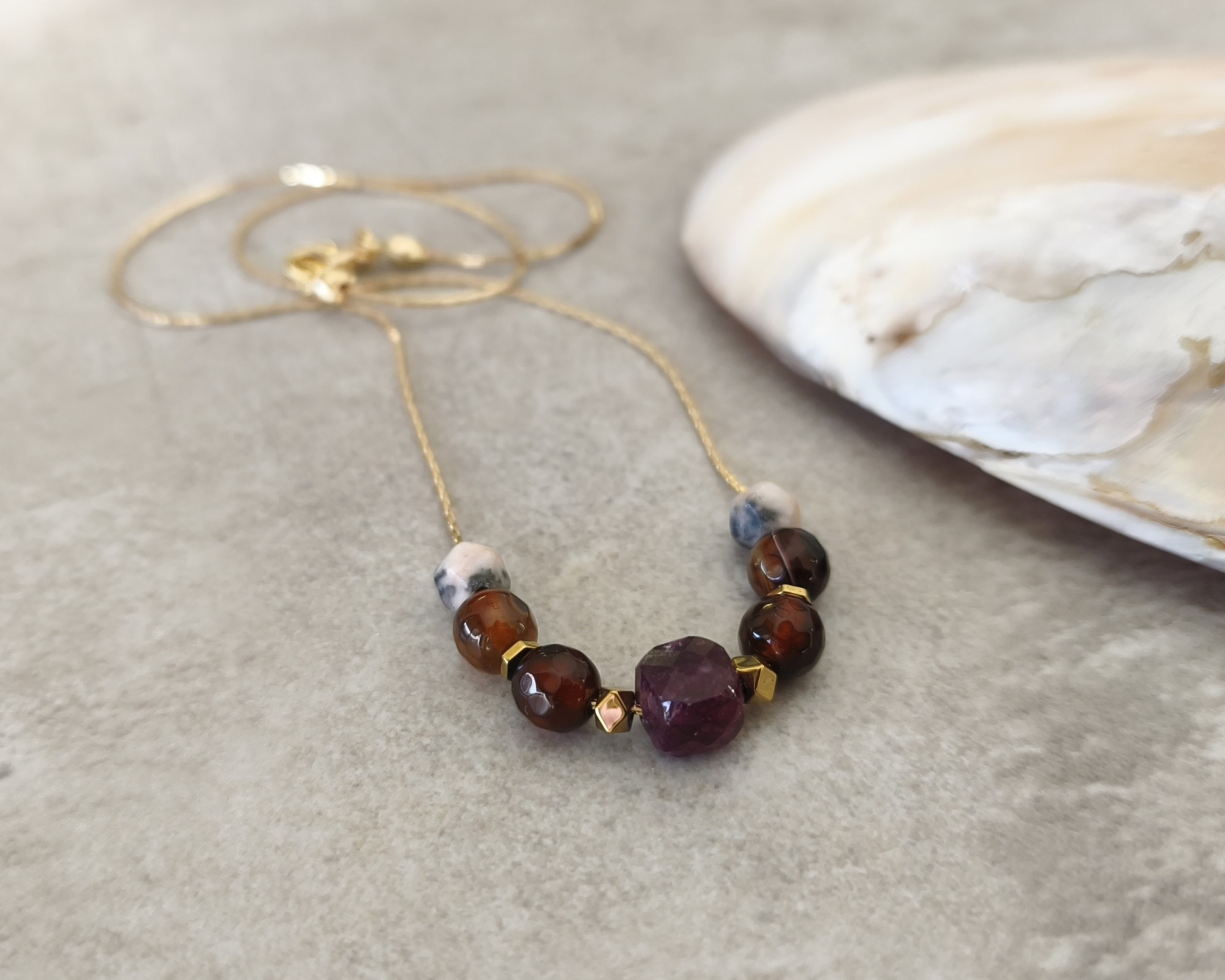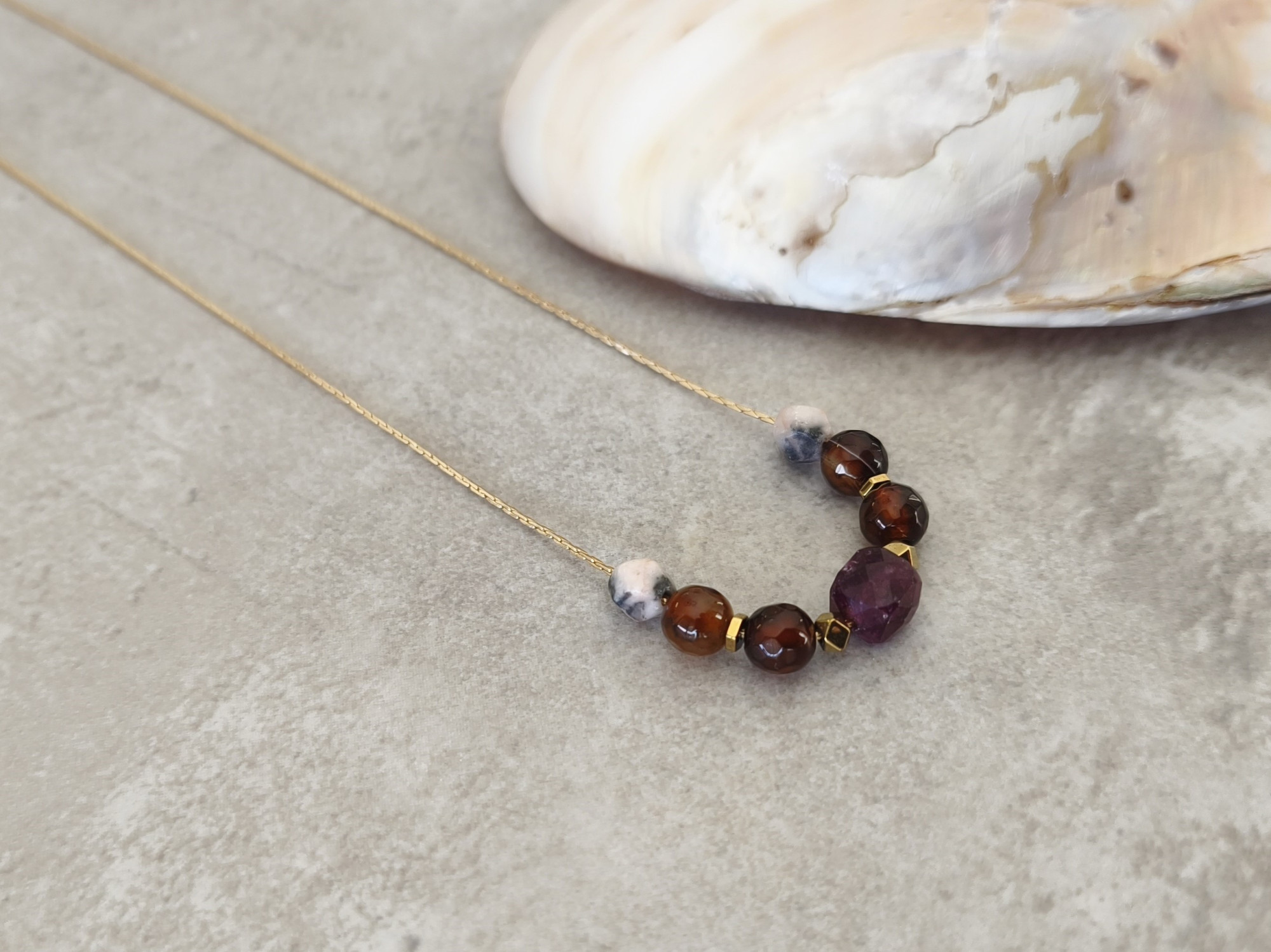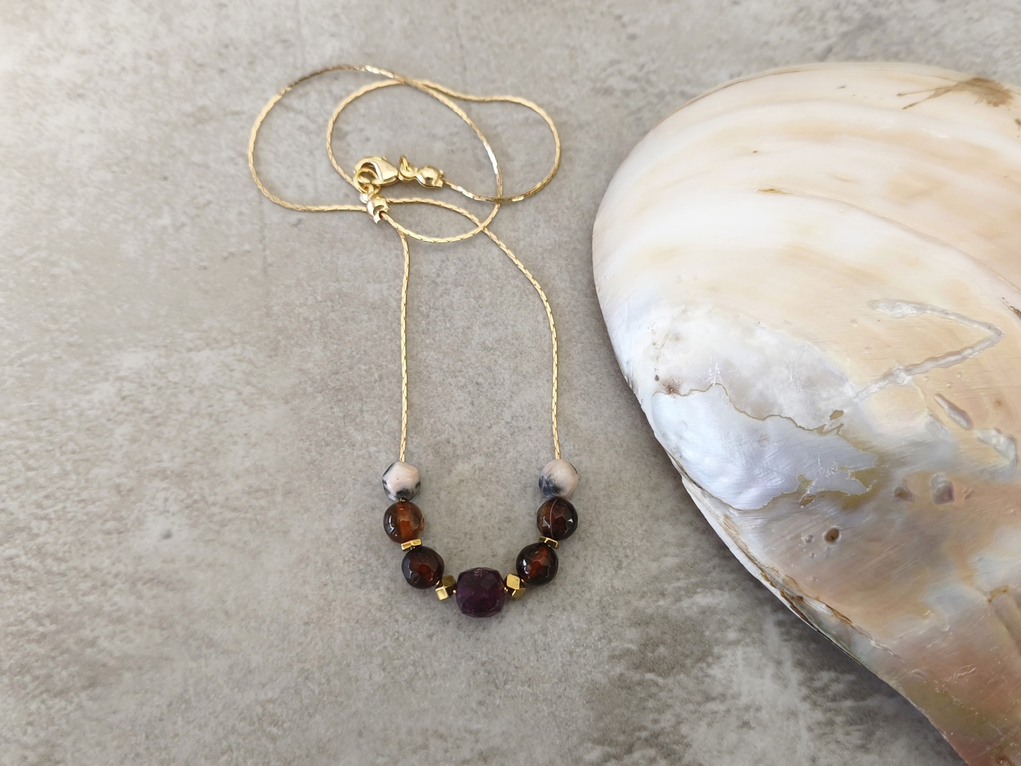 שרשרת עדינה בציפוי זהב, עם שורת חרוזי אבני חן בגווני סגול, חום וניוד.