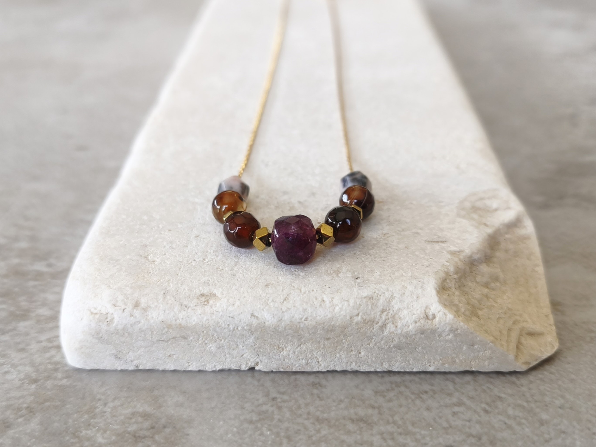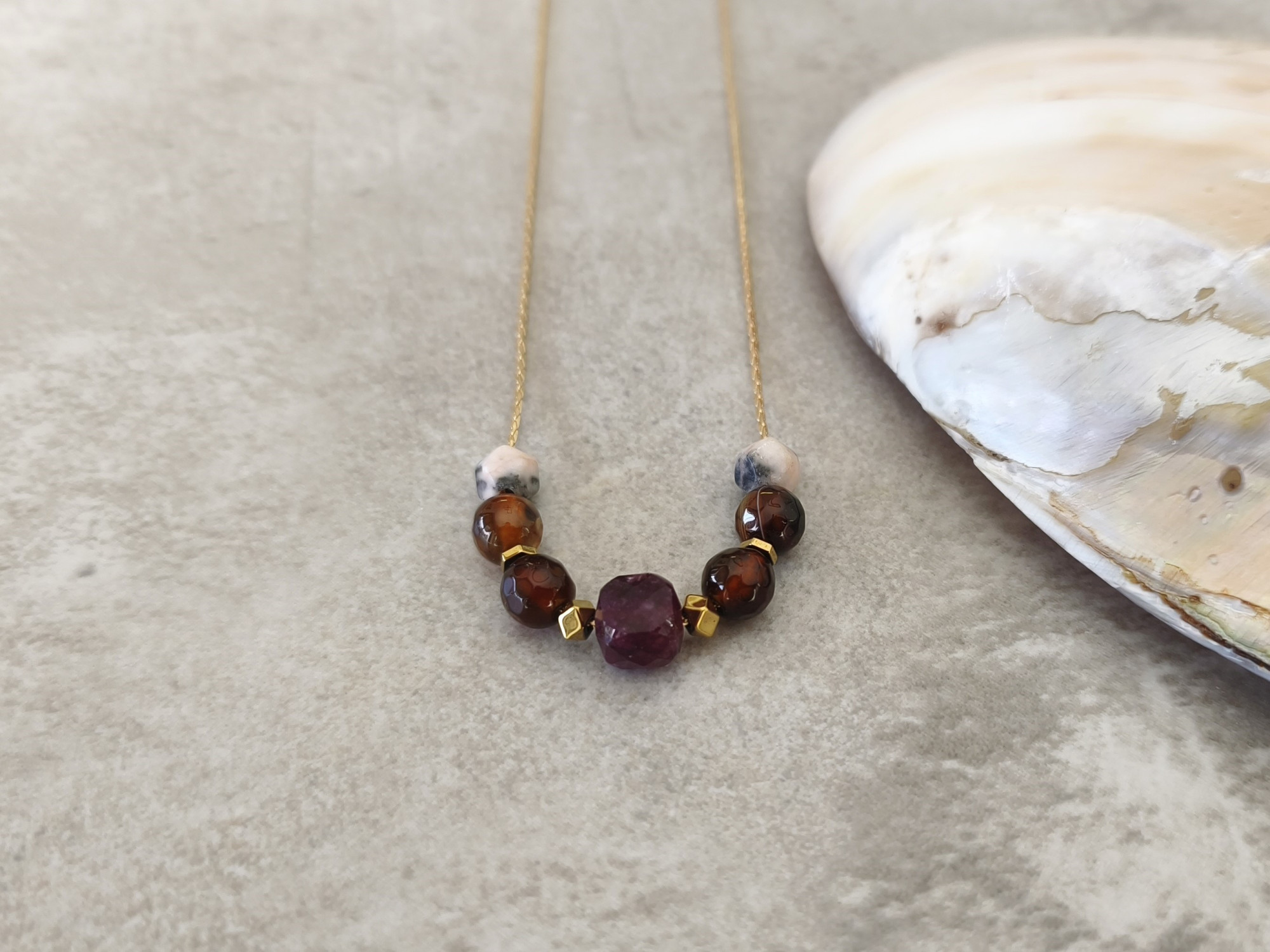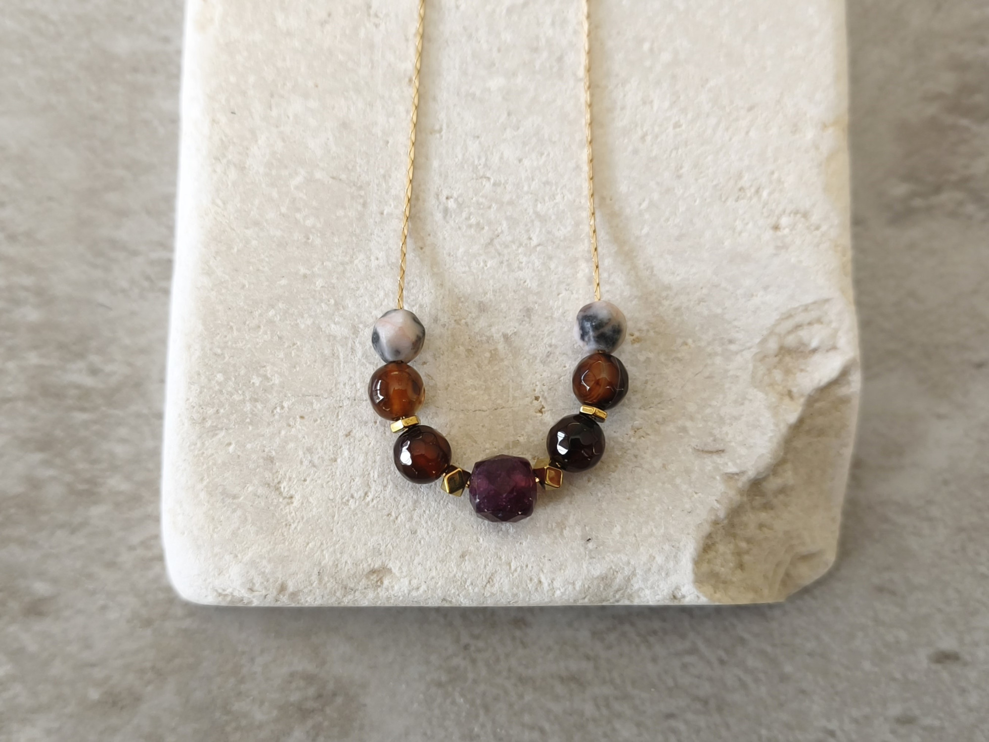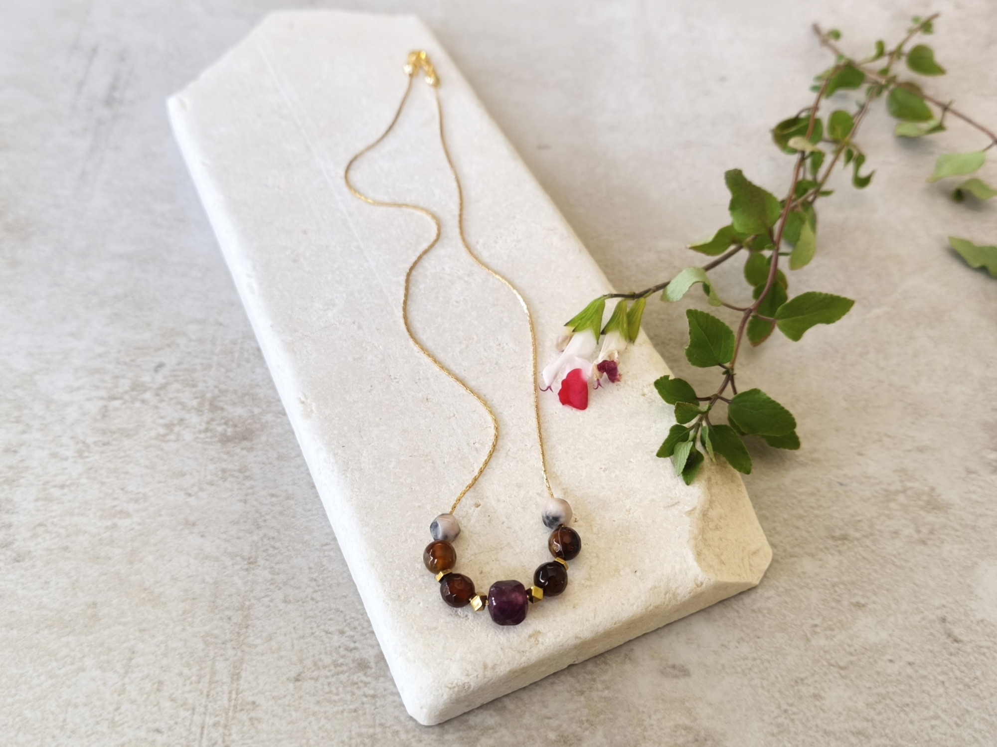 שרשרת עדינה בציפוי זהב, עם שורת חרוזי אבני חן בגווני סגול, חום וניוד.