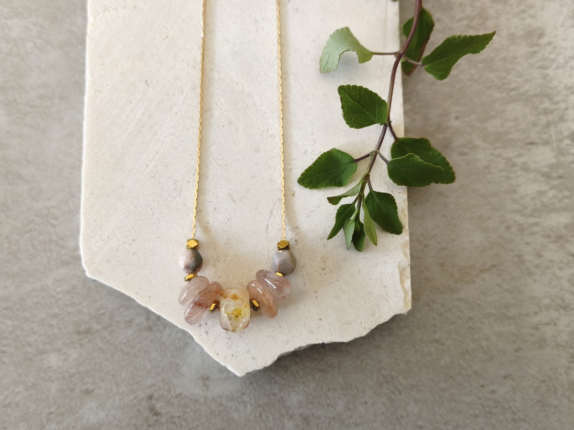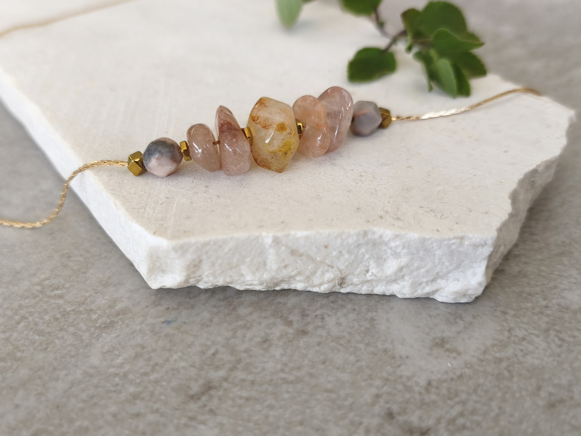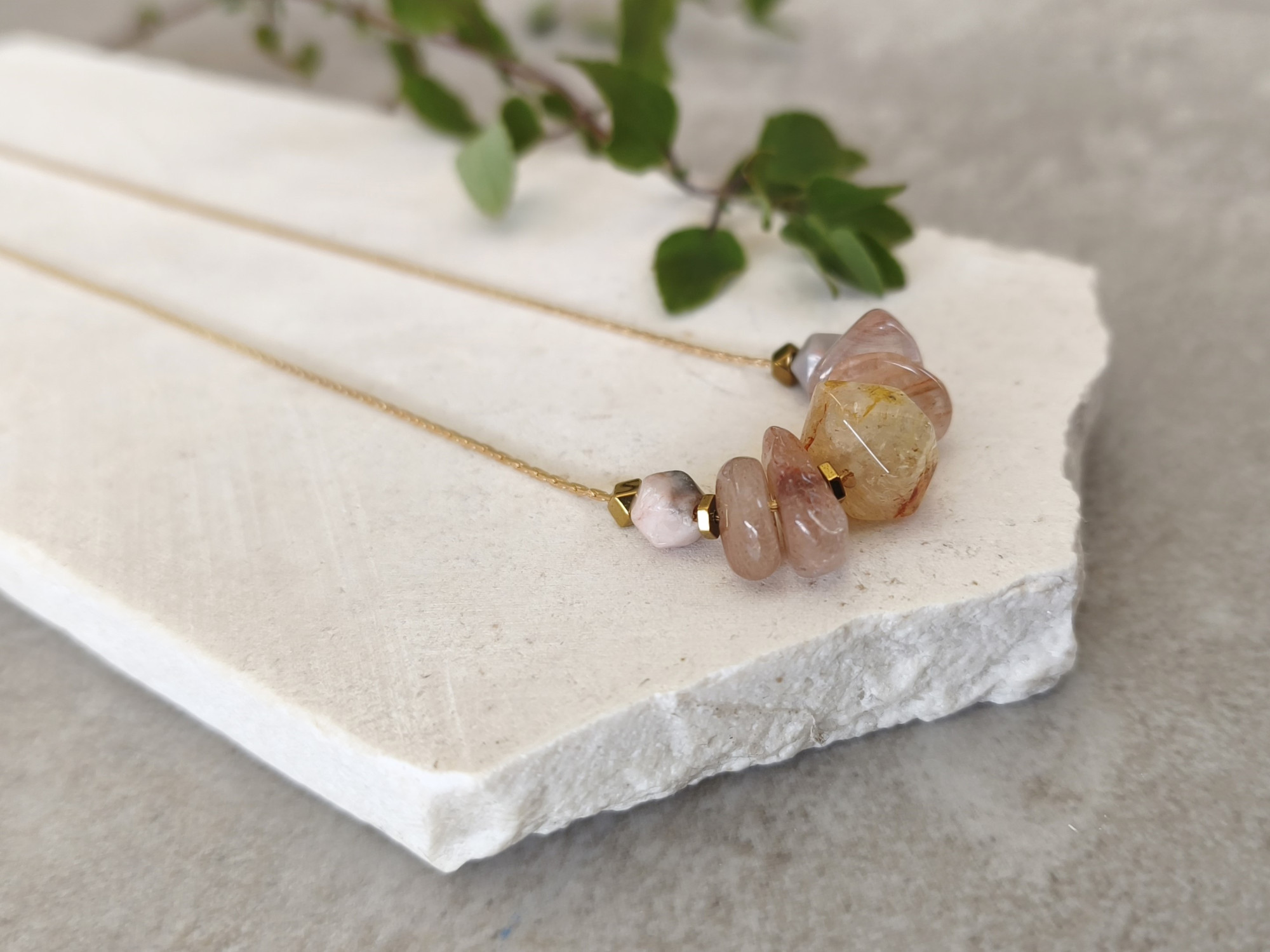 שרשרת עדינה בציפוי זהב, עם שורת חרוזי אבני חן בגווני ורוד ושנהב.