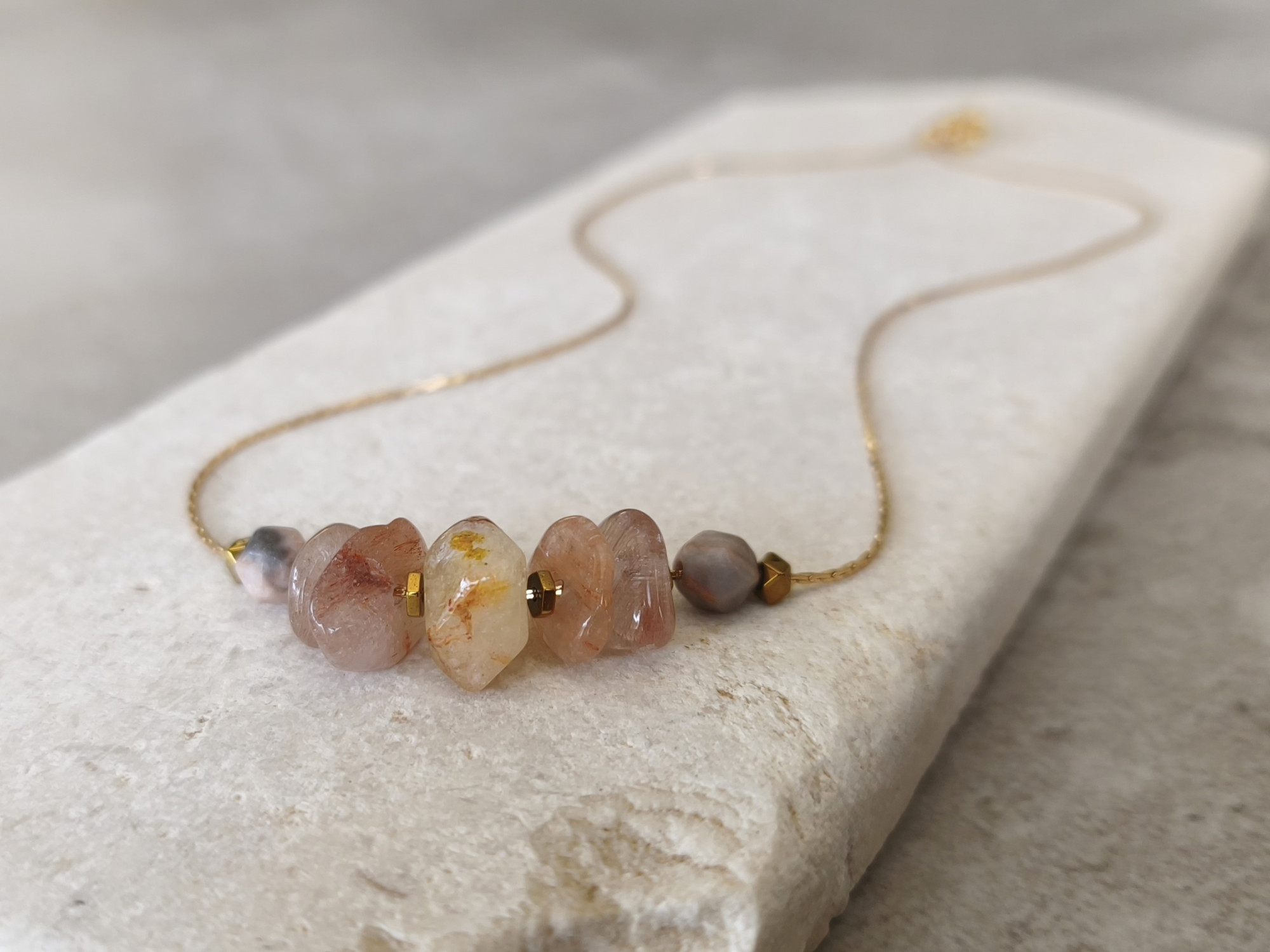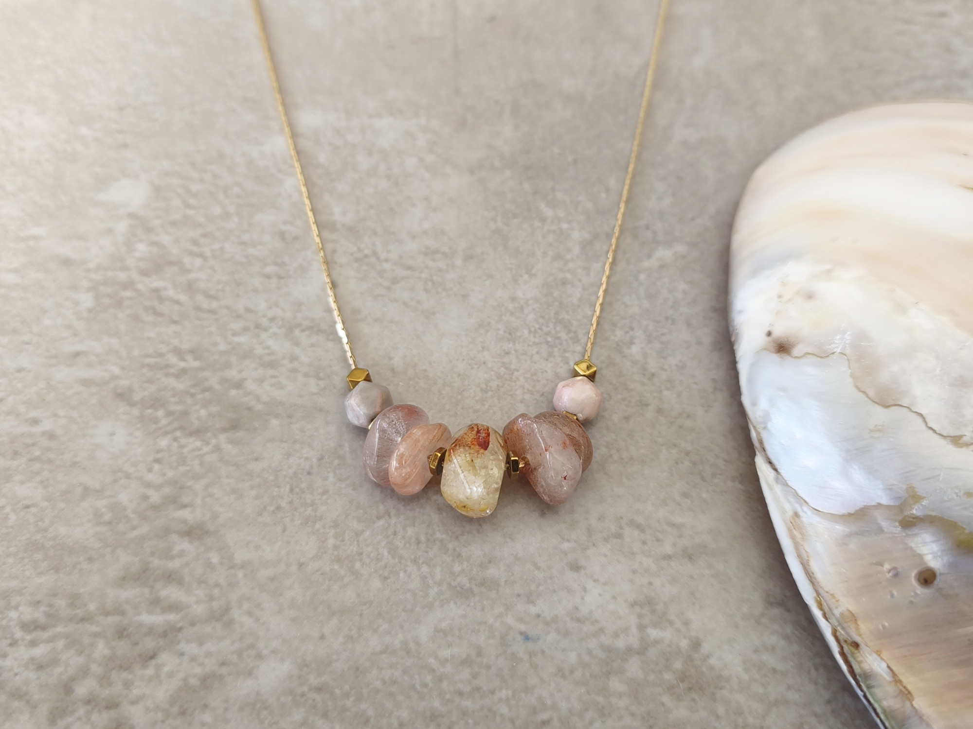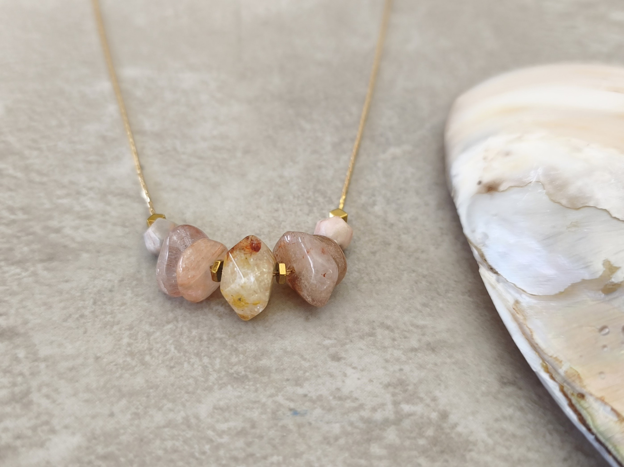 שרשרת עדינה בציפוי זהב, עם שורת חרוזי אבני חן בגווני ורוד ושנהב.