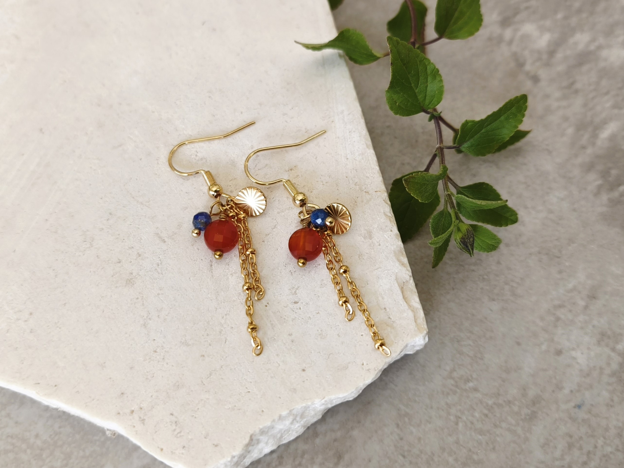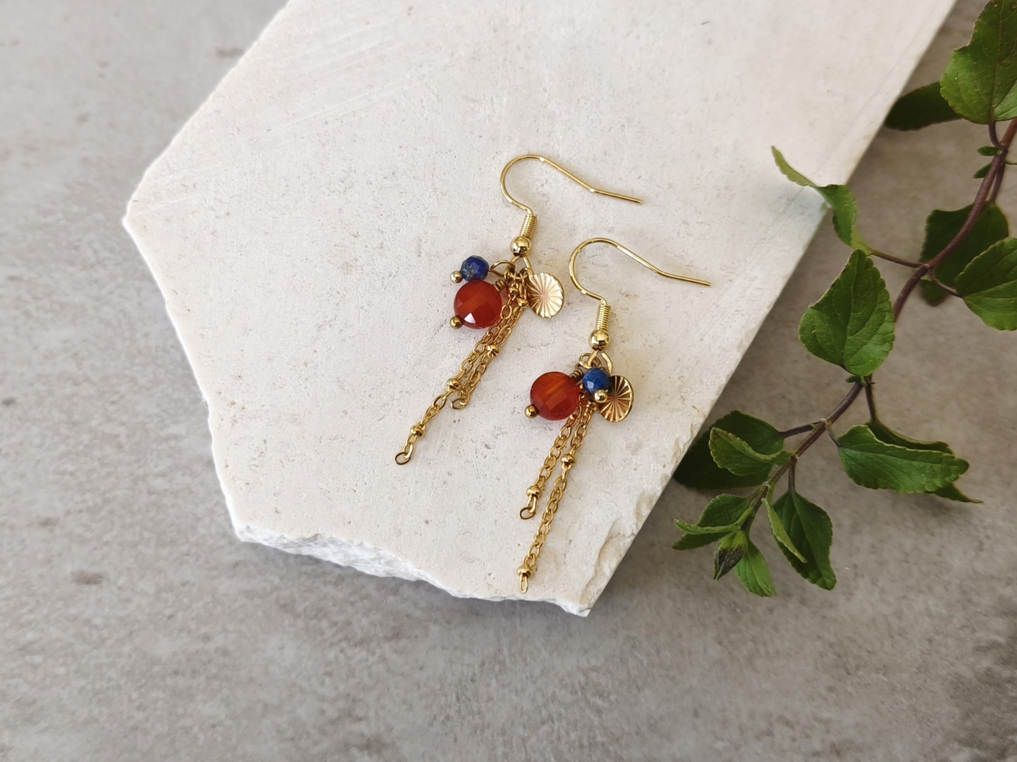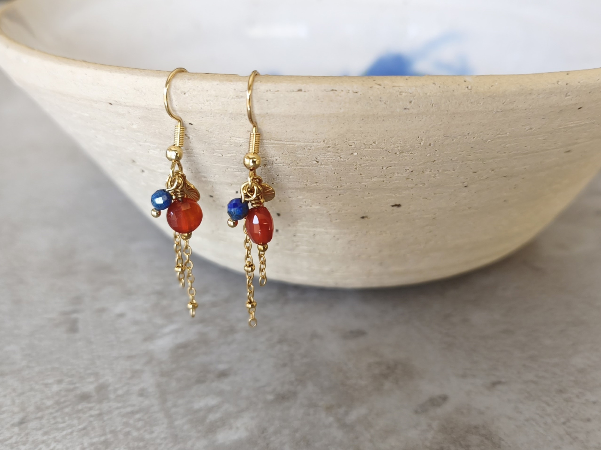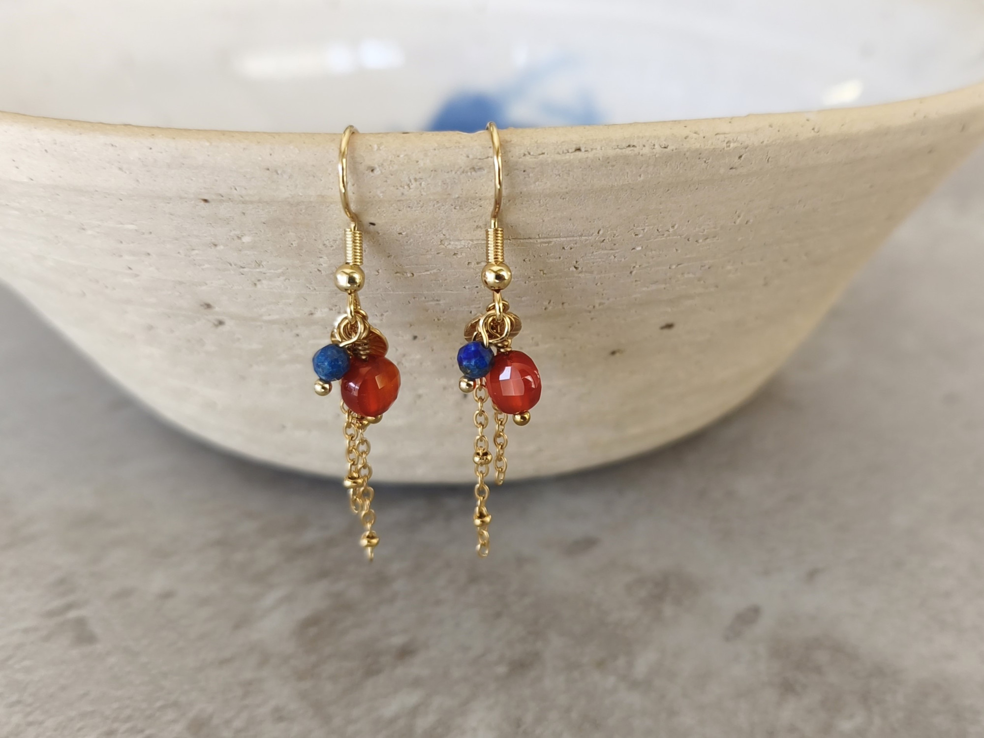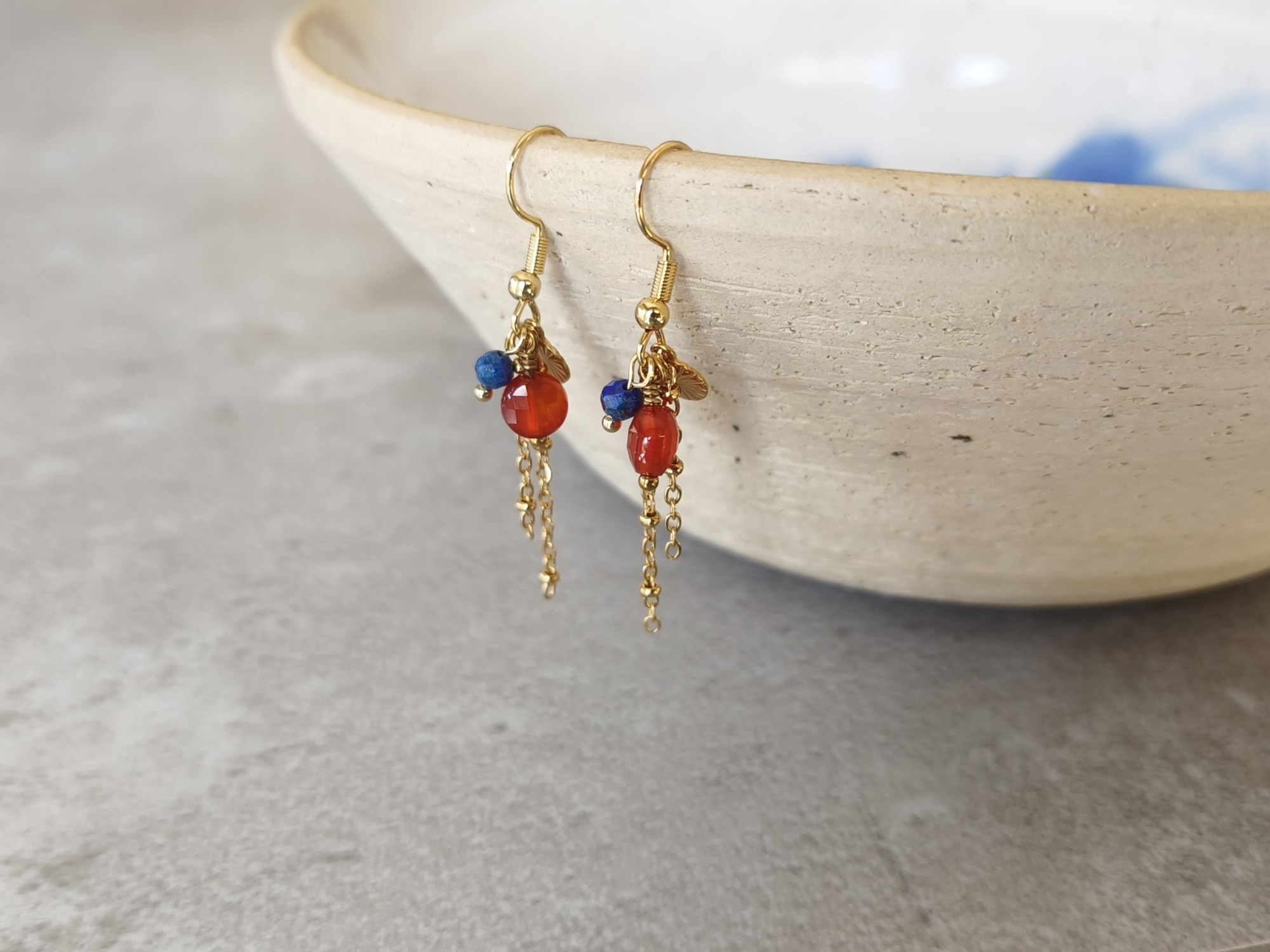 עגילים תלויים עם תליוני אבני חן בגווני כתום כהה, כחול וזהב.