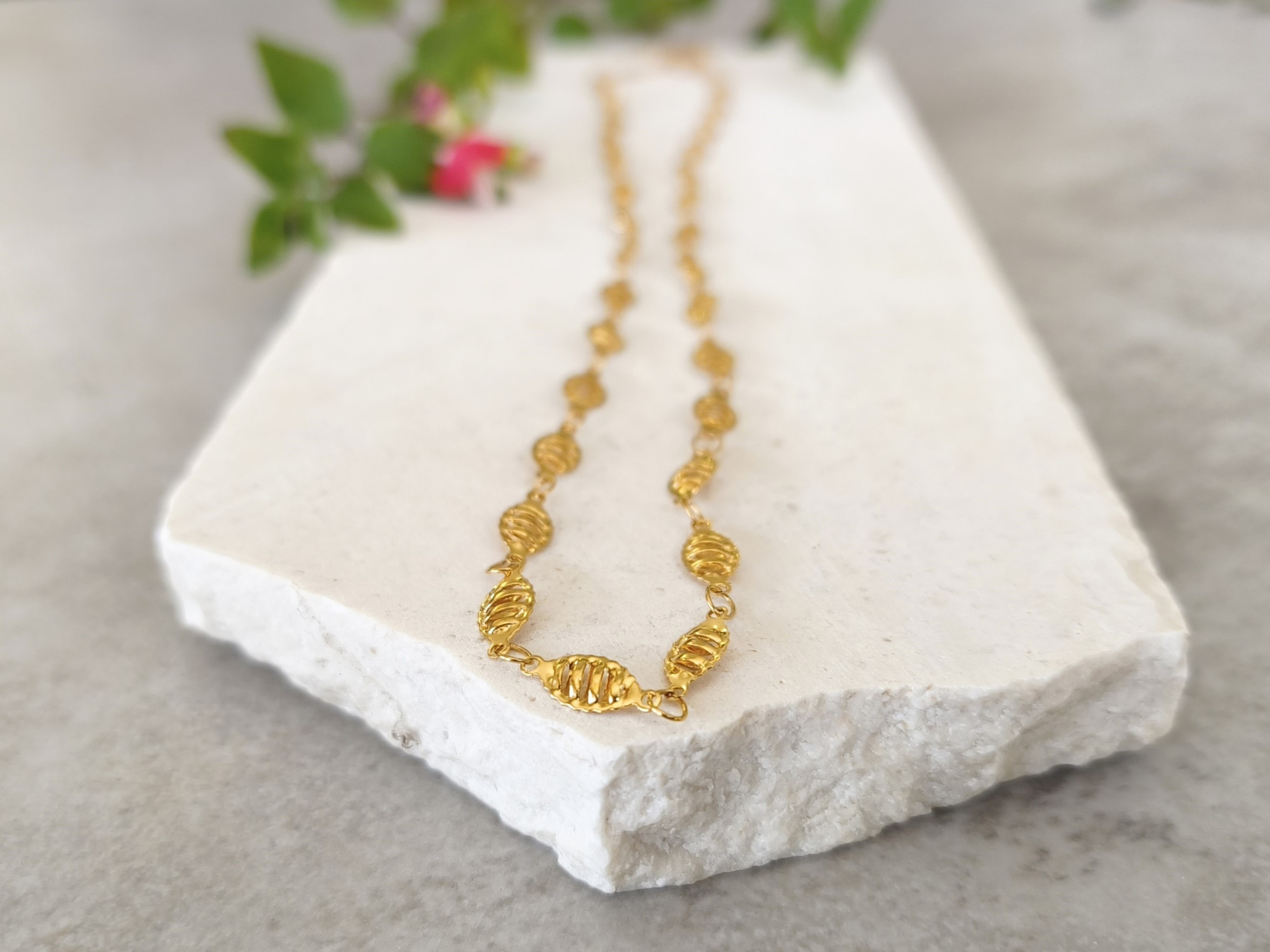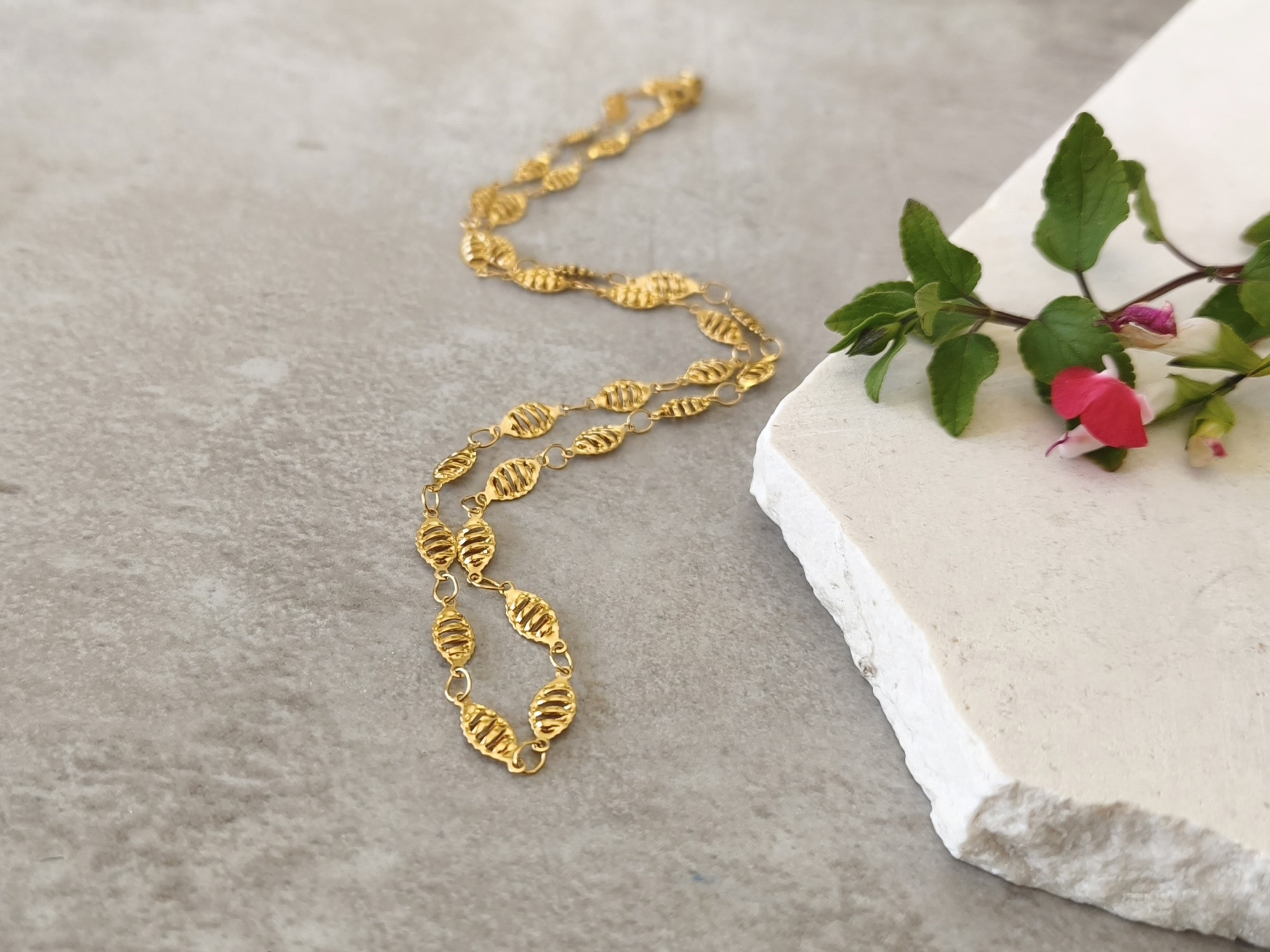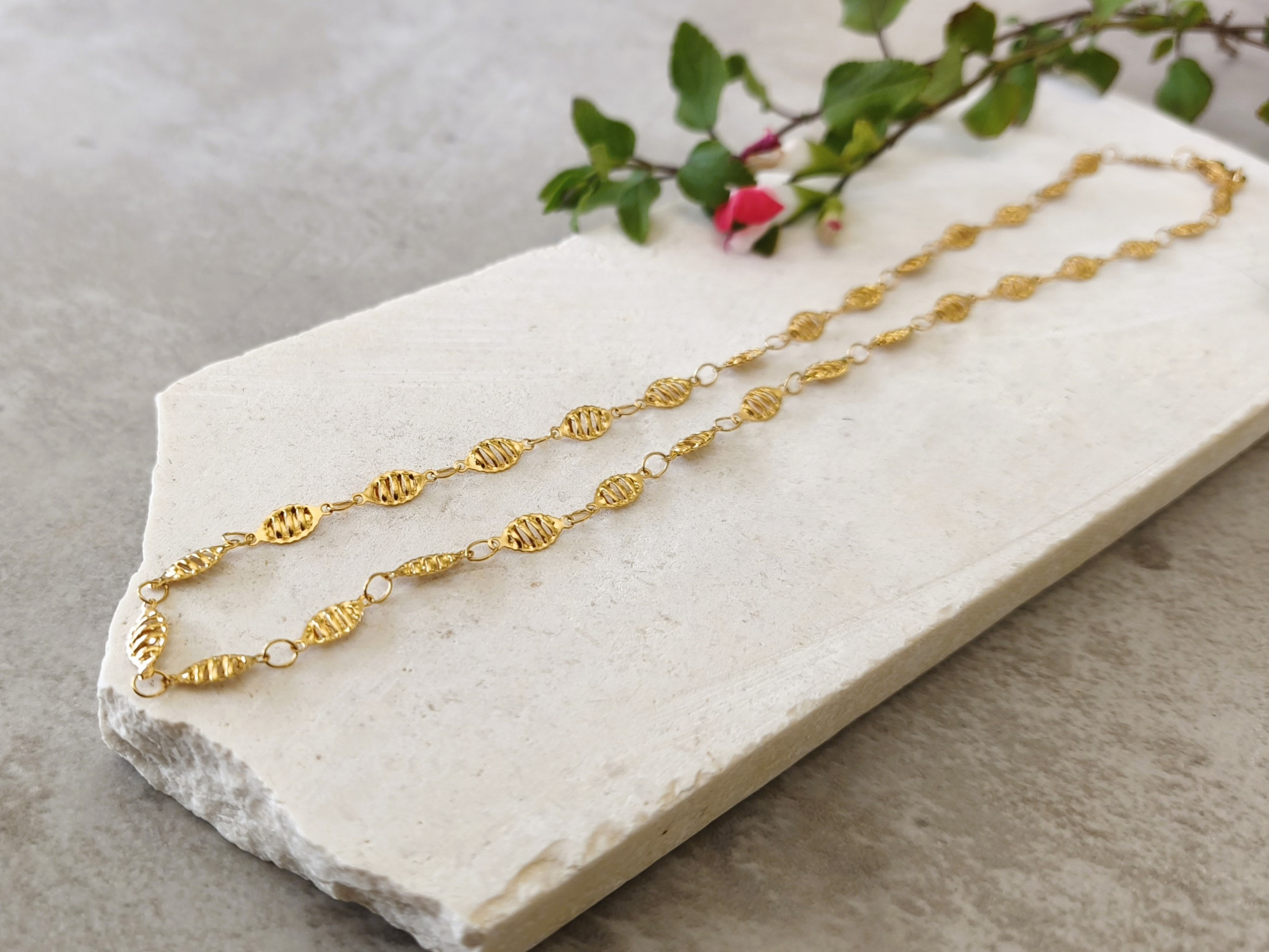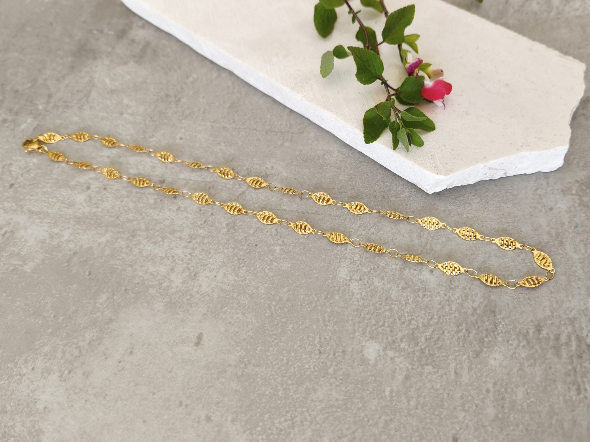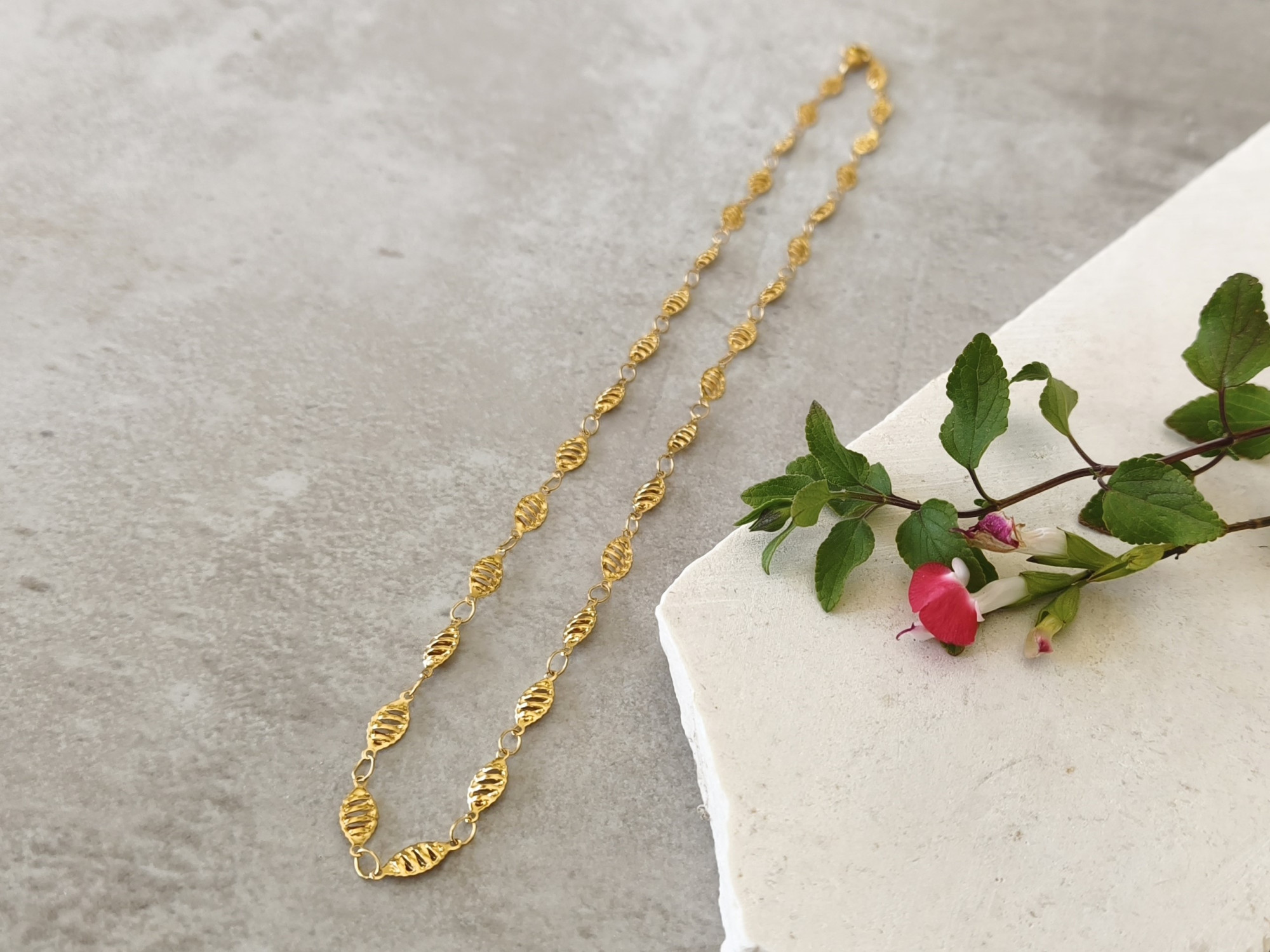 שרשרת פלדת אל-חלד בציפוי זהב איכותי, המורכבת מחוליות עלים מעוטרים.