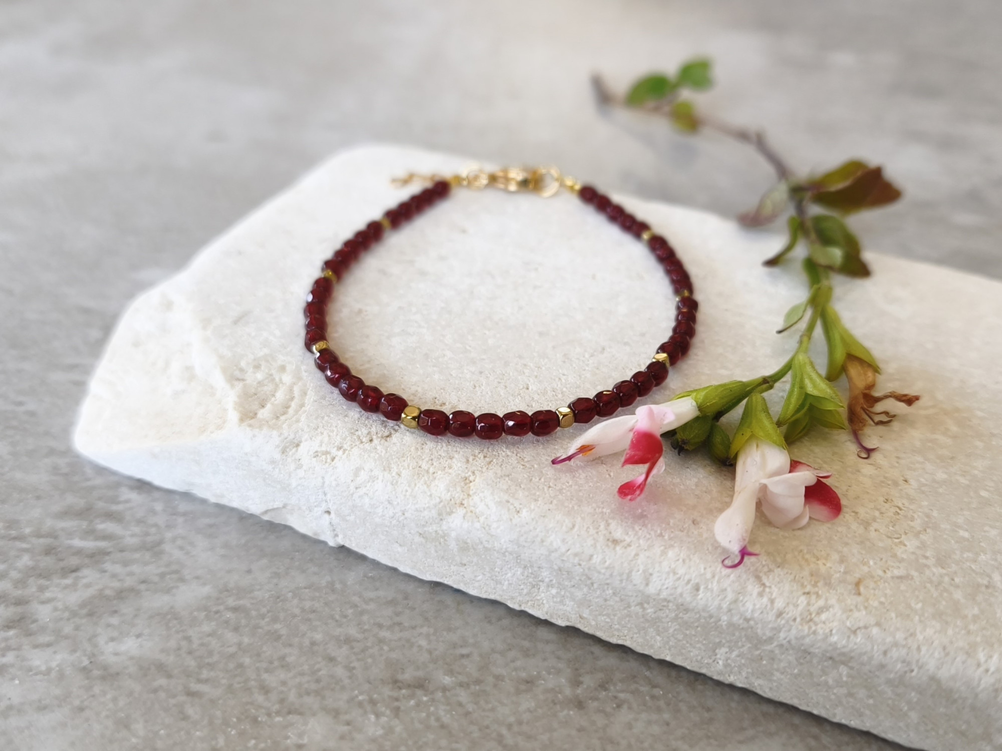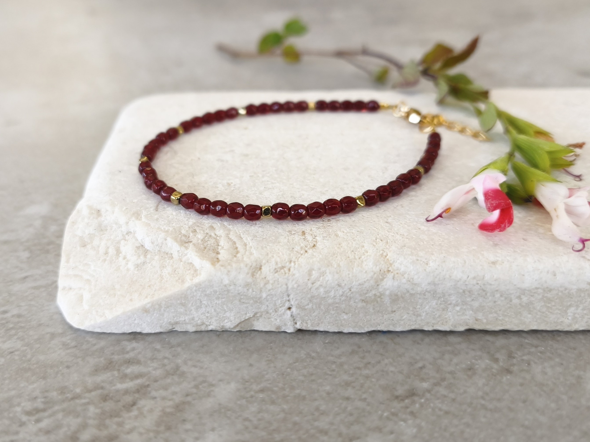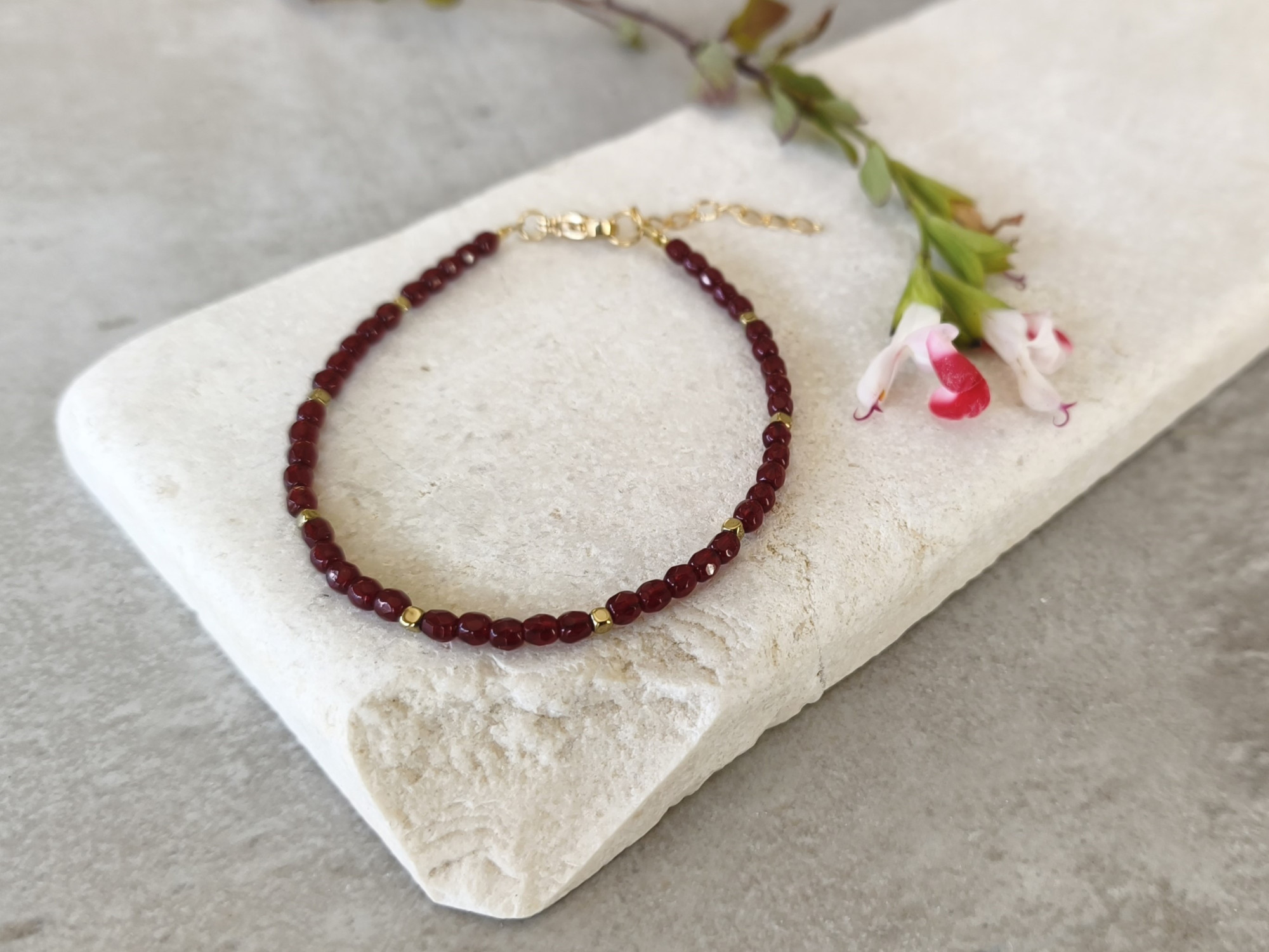צמיד חרוזי זכוכית באדום-בורדו מהפנט, בשילוב חרוזים זהובים קטנטנים. צמיד דק ועדין, מוסיף נגיעה של צבע קסום ומיוחד. תוספת ייחודית ומעניינת לאוסף התכשיטים שלך!