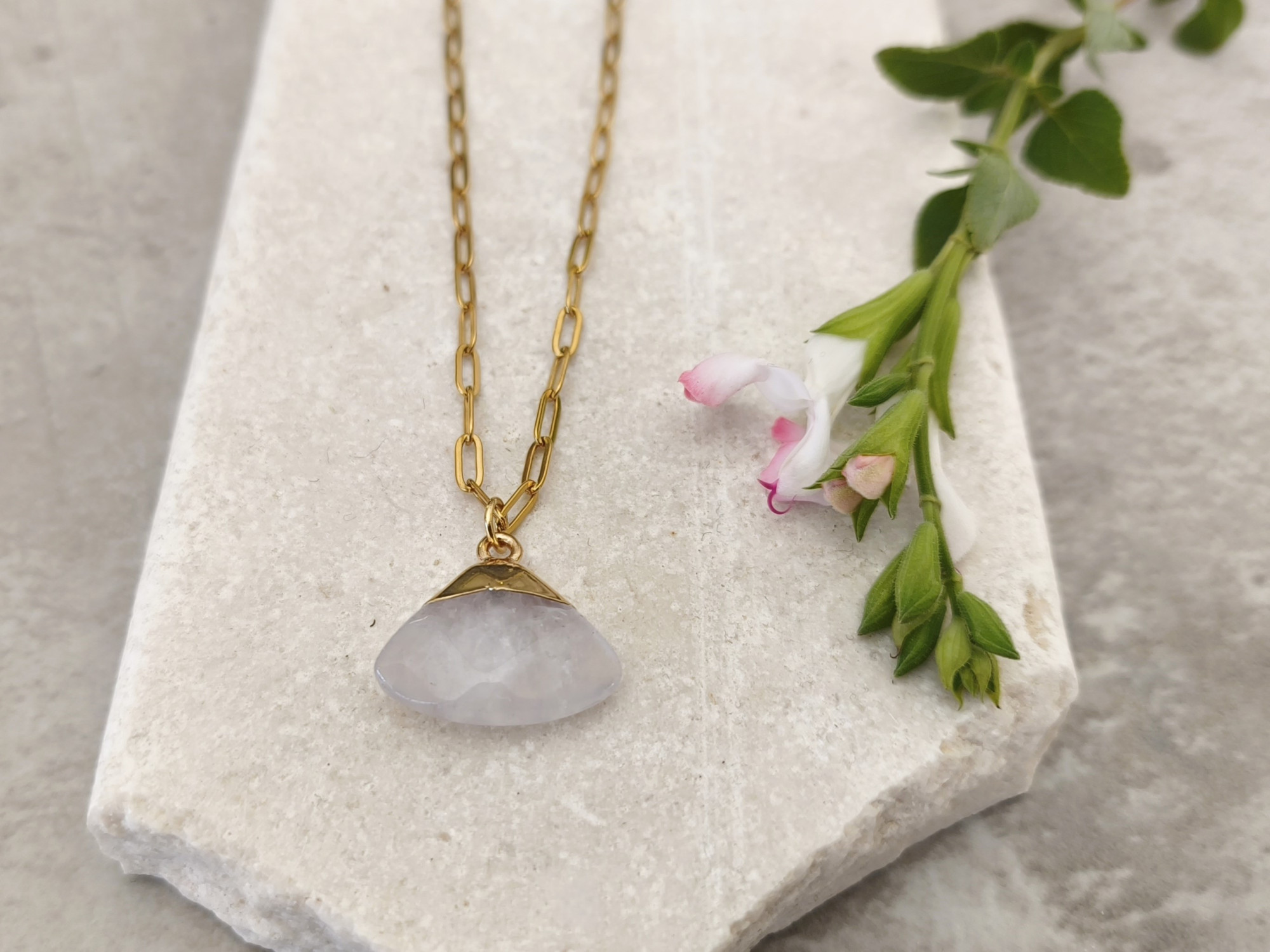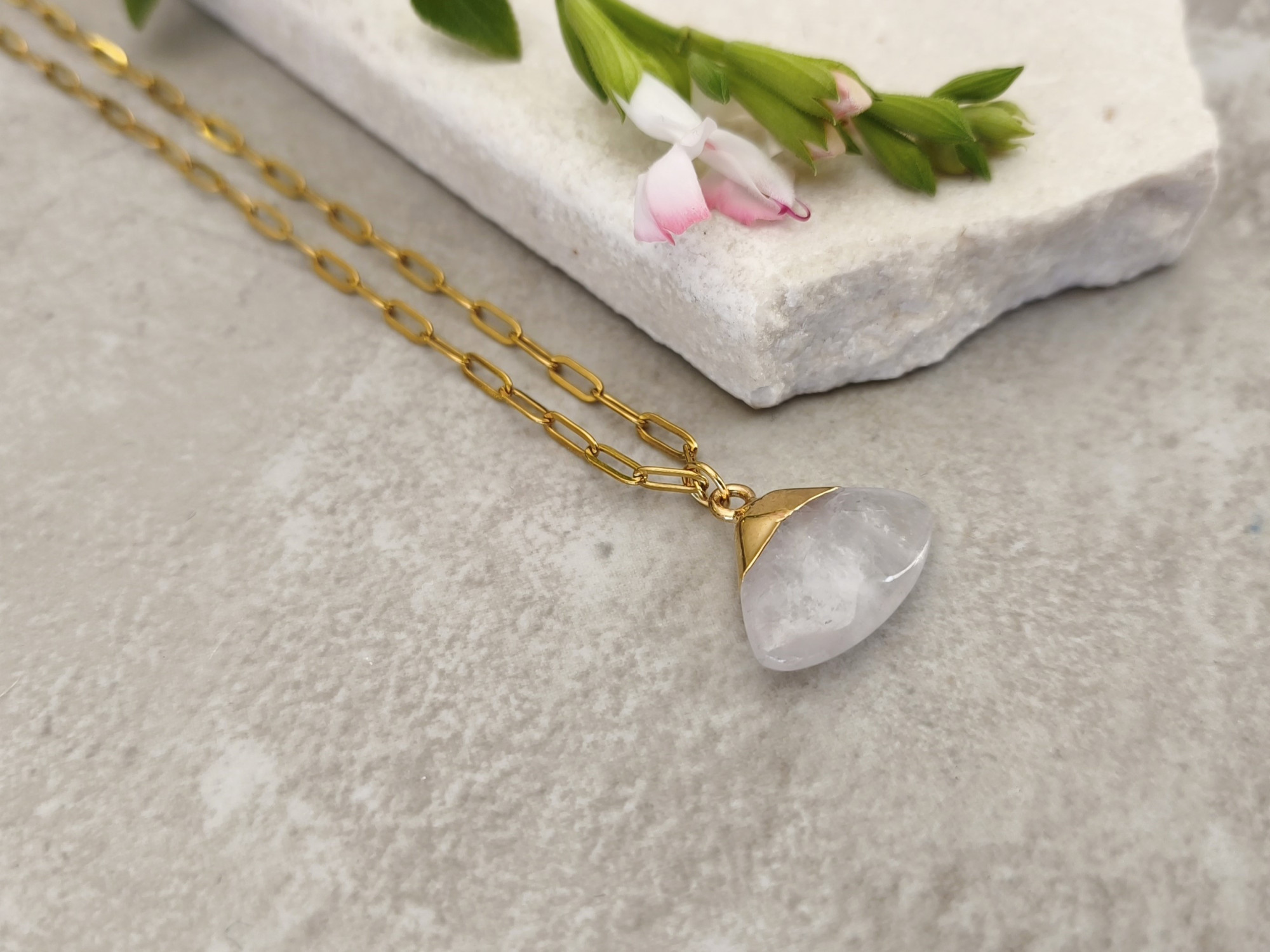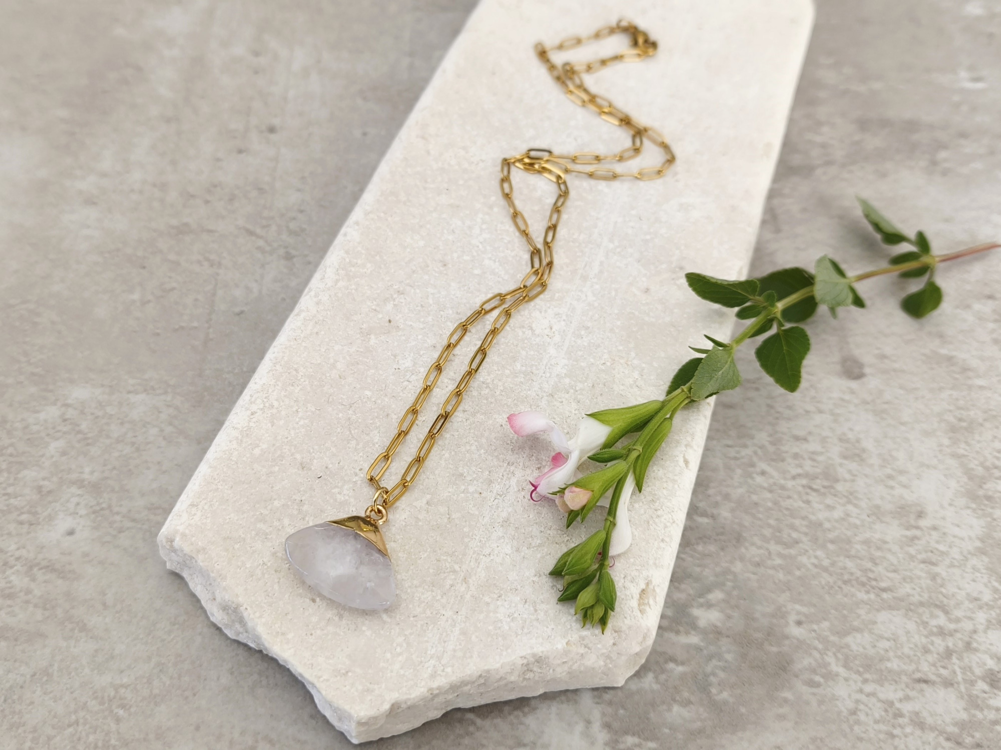 שרשרת חוליות פלדת אל-חלד בציפוי זהב עם תליון אבן קוורץ לבנה בחיתוך משולש.