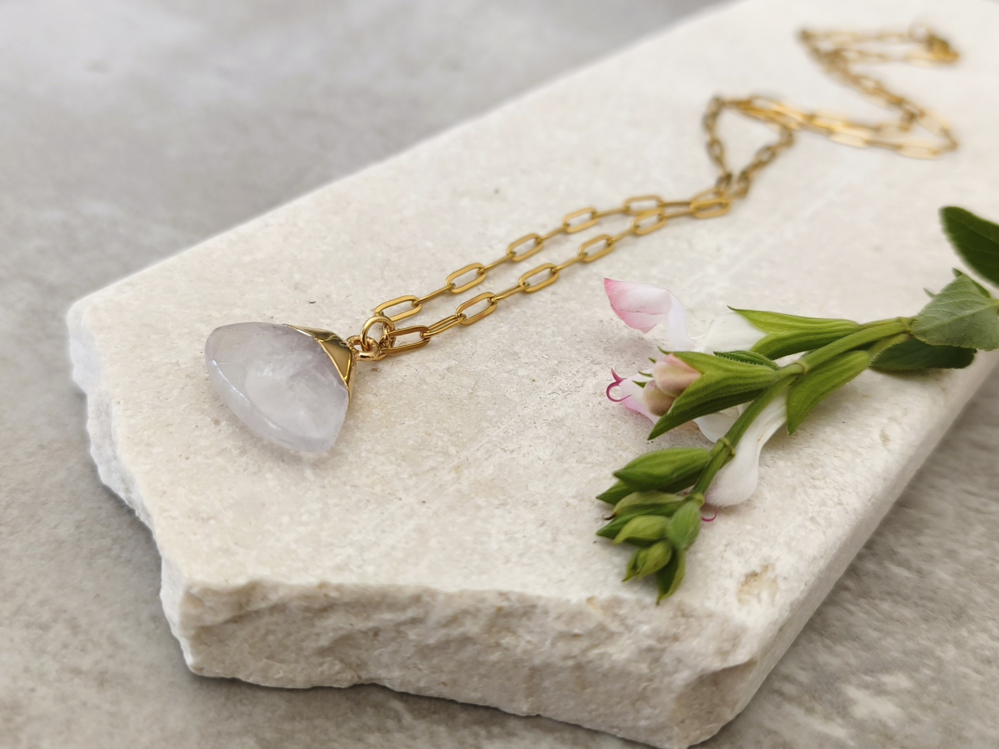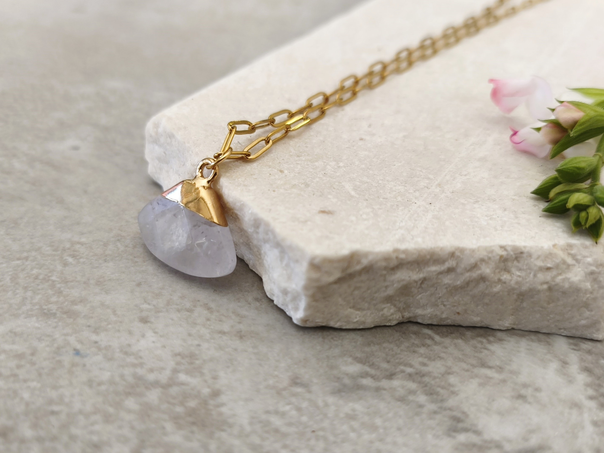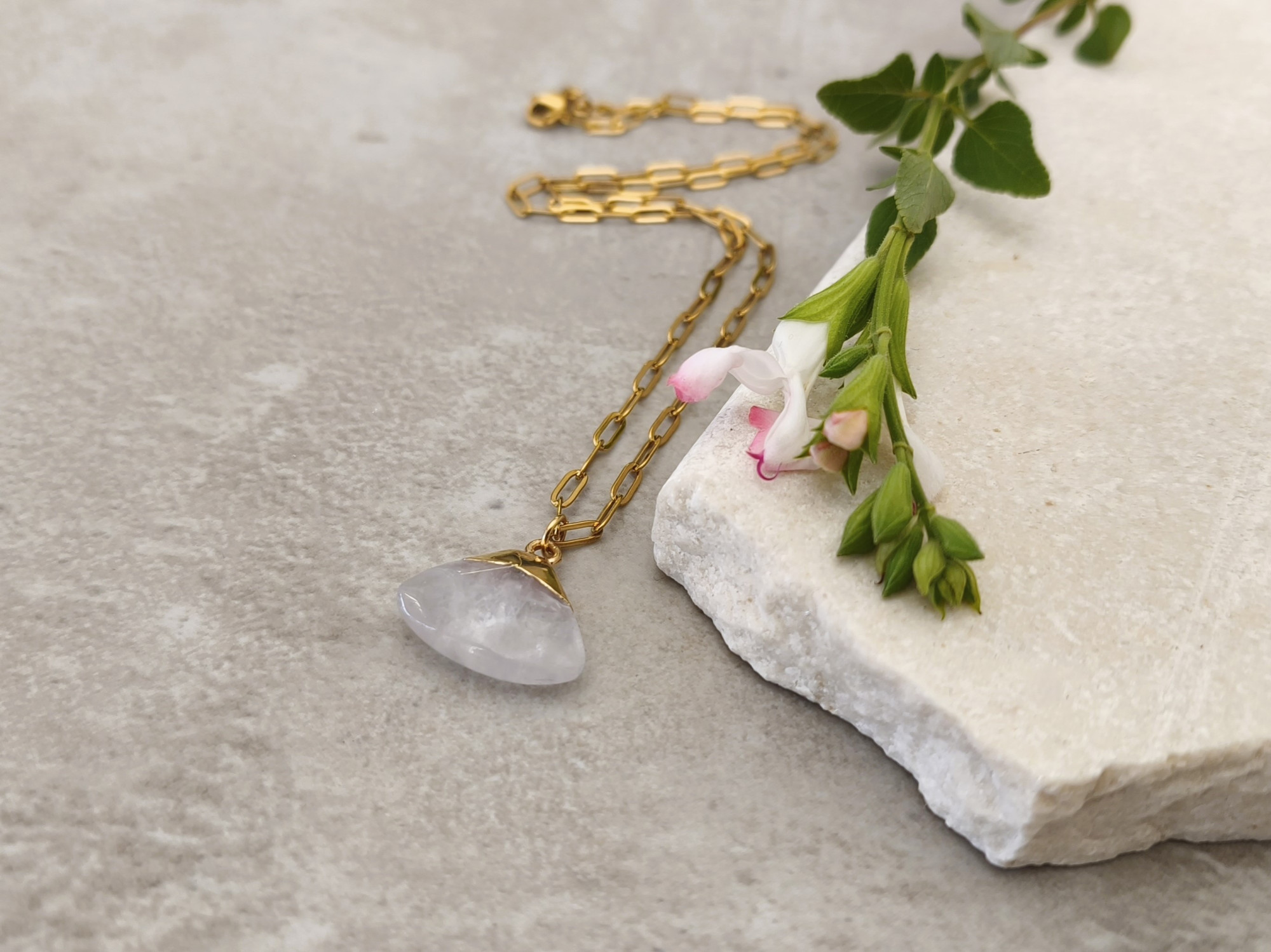 שרשרת חוליות פלדת אל-חלד בציפוי זהב עם תליון אבן קוורץ לבנה בחיתוך משולש.
