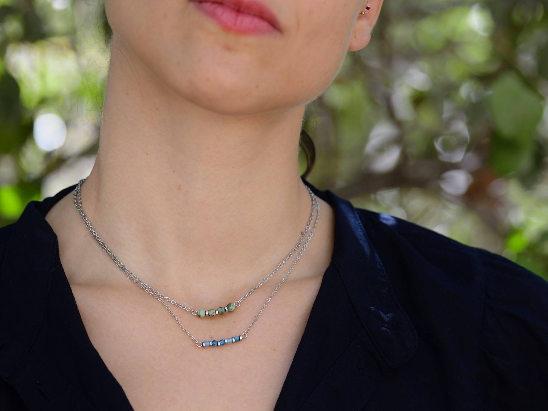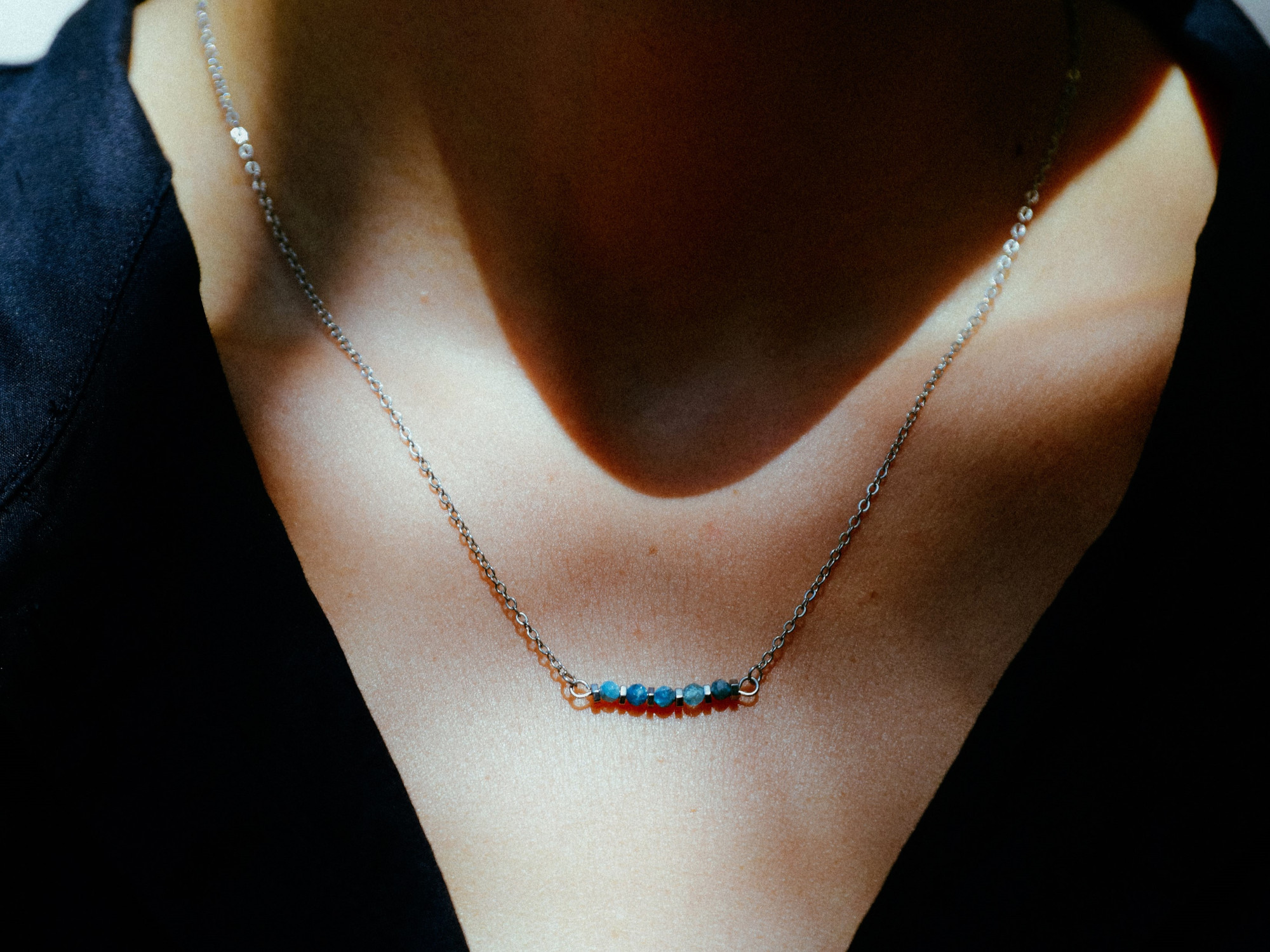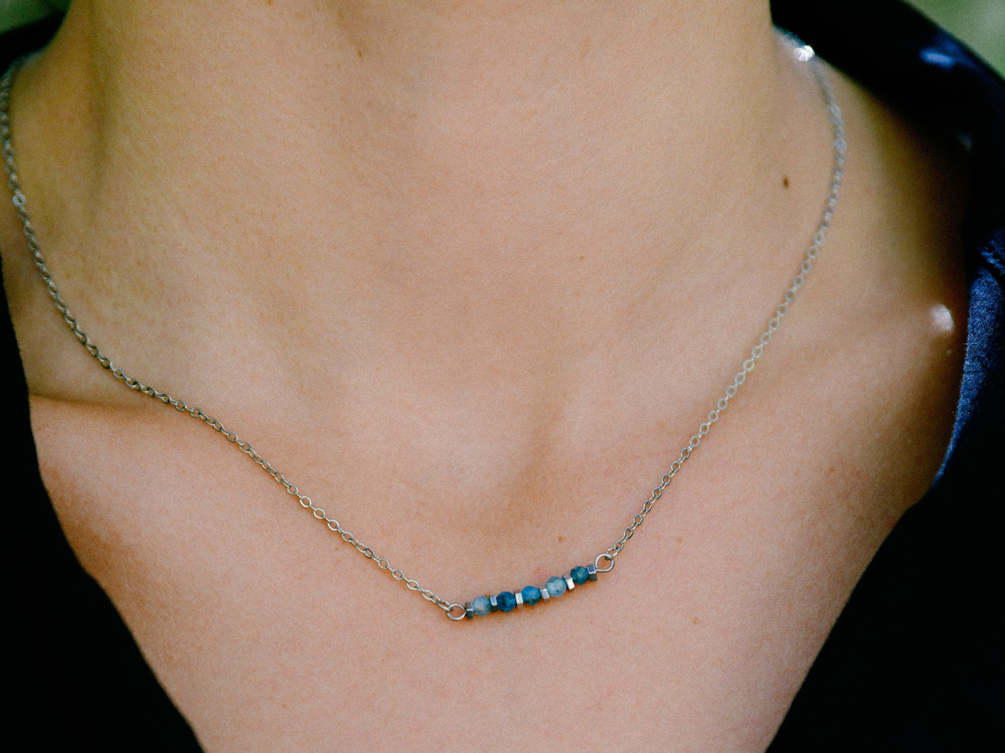 שרשרת כסופה עדינה עם בר אבני חן בגוון כחול-אוקיינוס. שרשרת קצרה ומינימליסטית, שמוסיפה טאצ' עדין של צבע מהפנט. שרשרת סופר-שימושית, קלילה וייחודית.