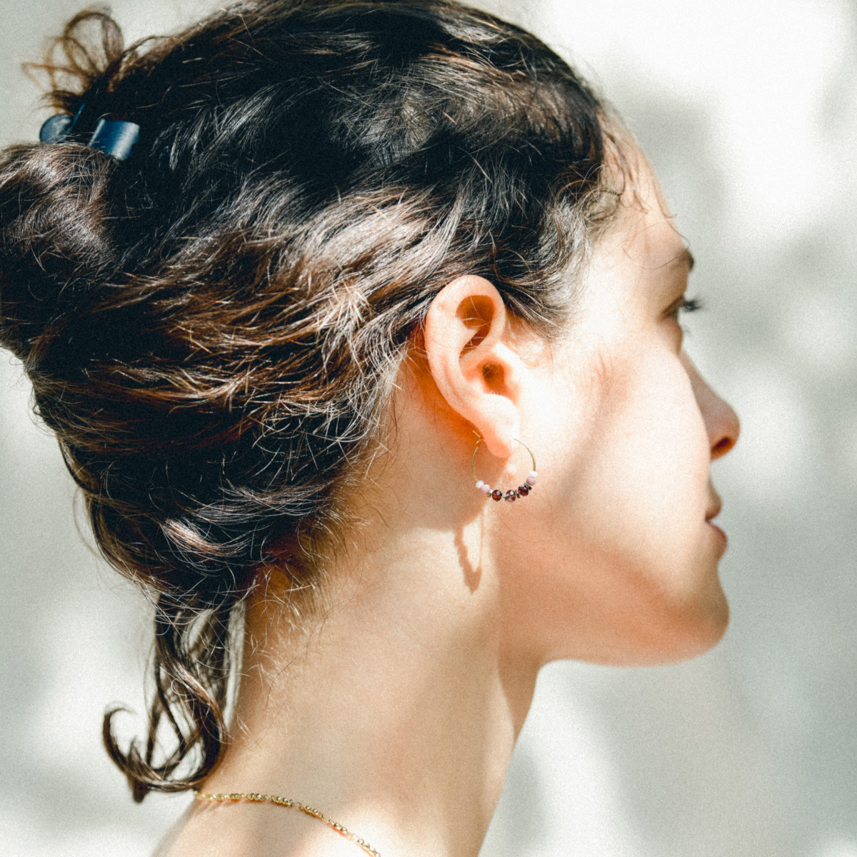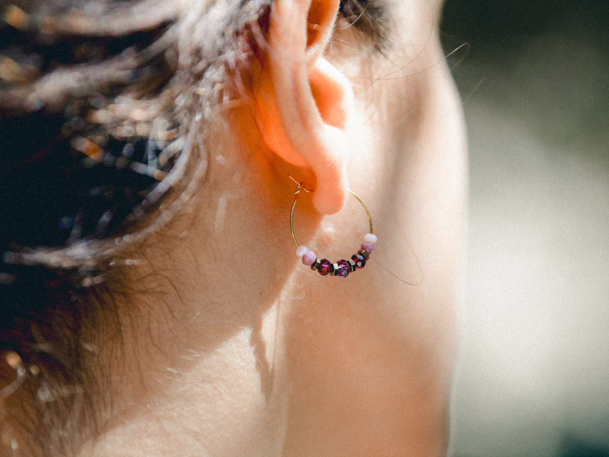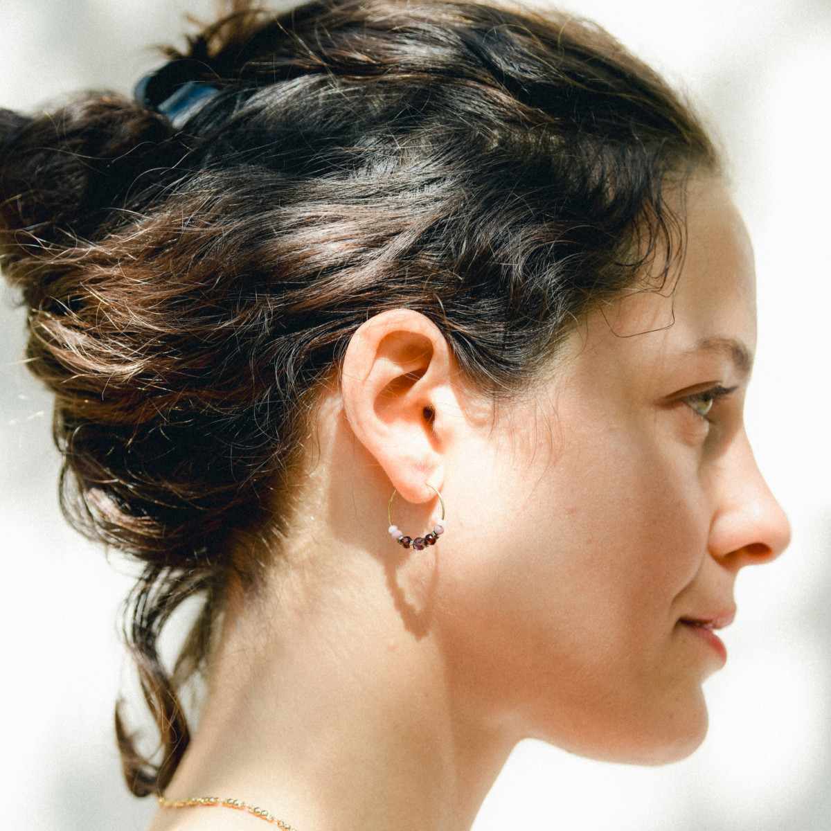 עגילי חישוק קטנים עם חרוזים סגולים בגוונים מדורגים. עגילים קלילים (בעיצוב ובמשקל), בגודל קטן ונח, ובצבע משמח. מתאימים לכל אחת ולכל מצב.