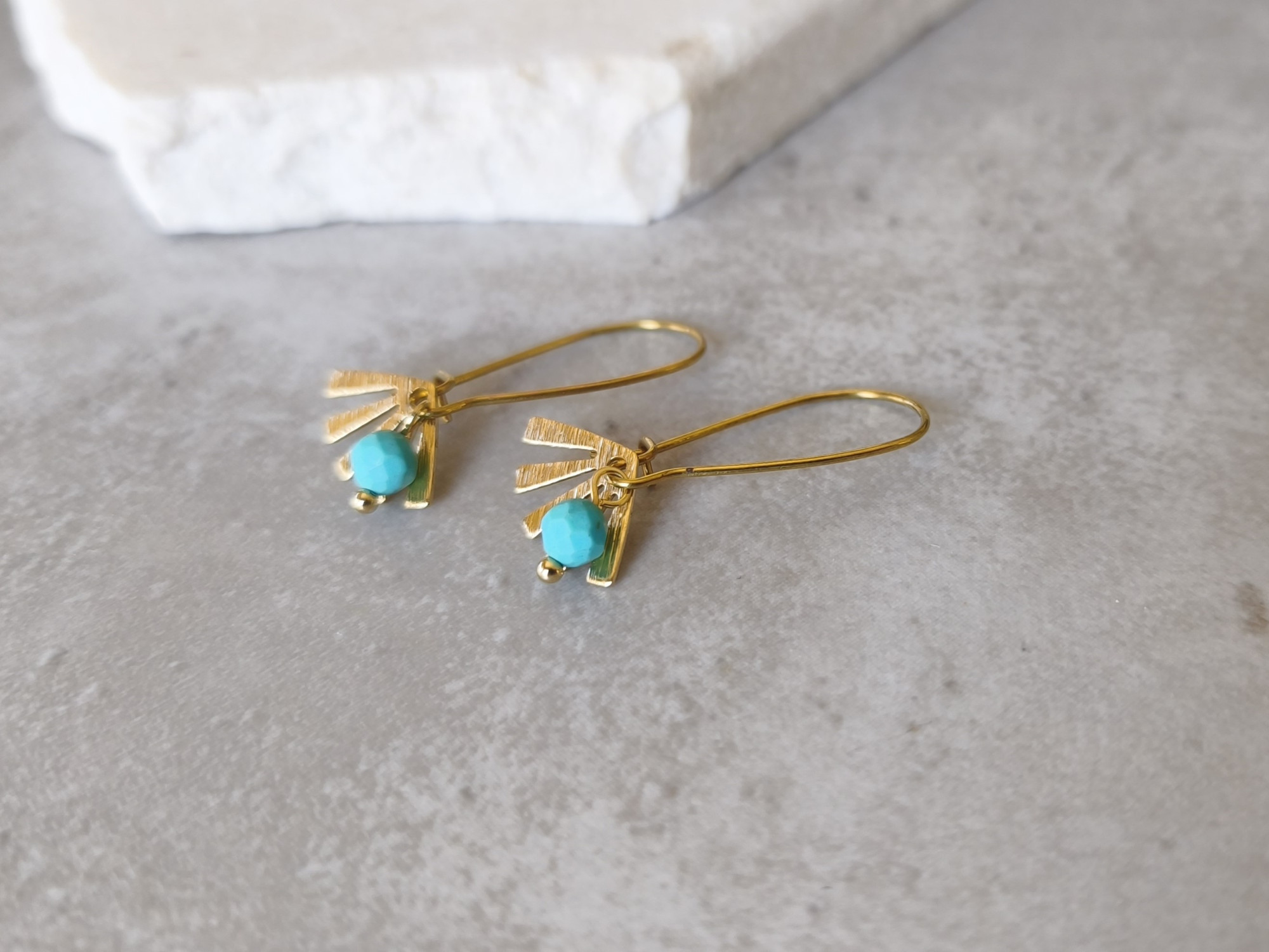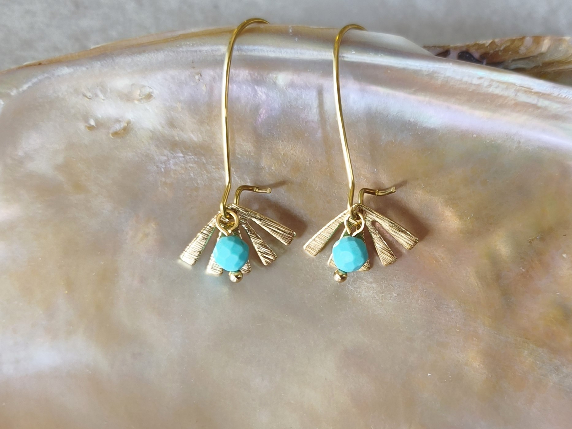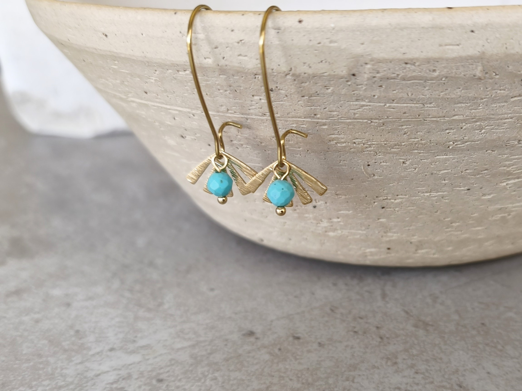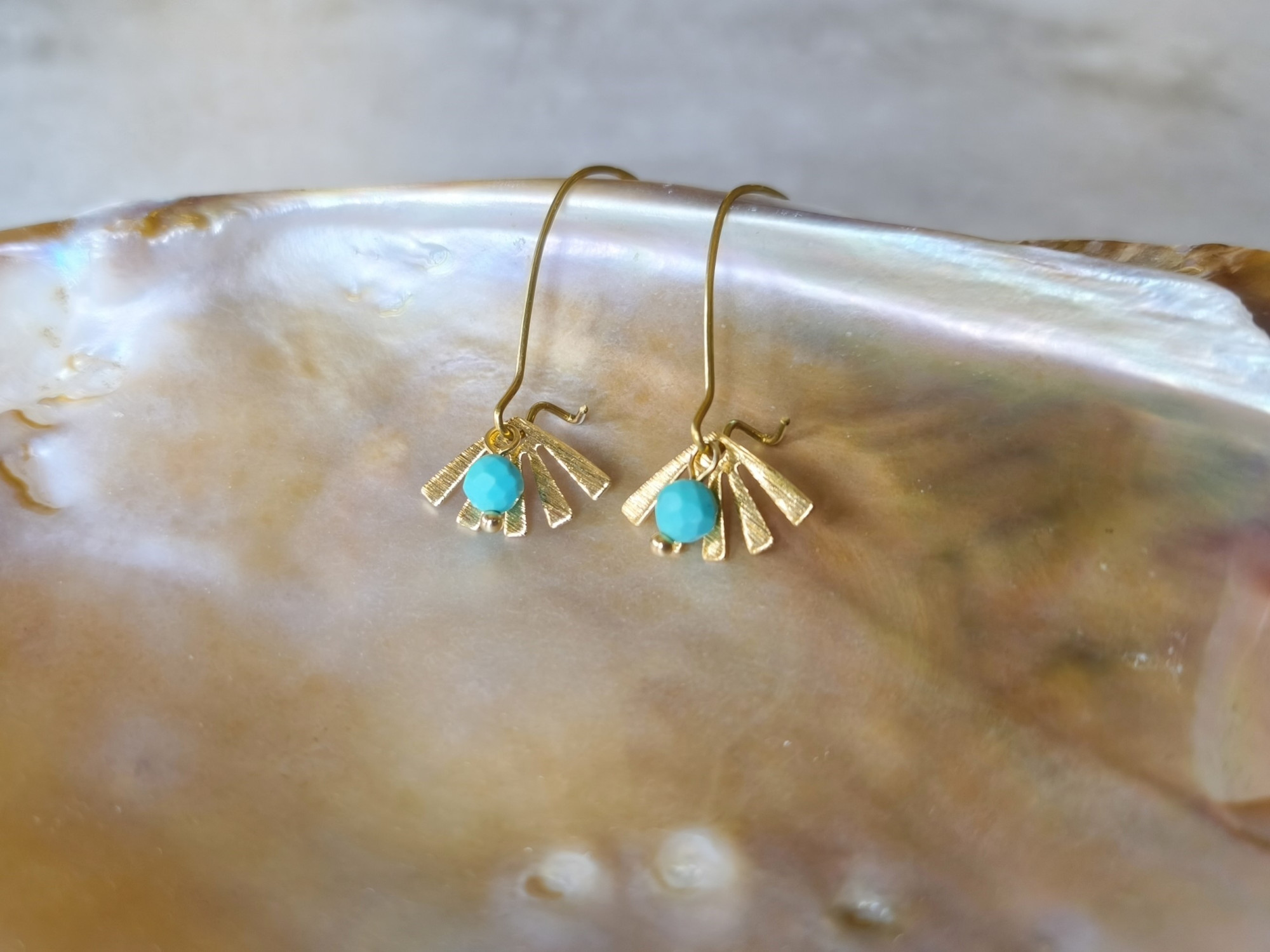 עגילים תלויים קלילים, עם מניפת בראס קטנה וחרוז טורקיז קטן שגונב את ההצגה.
