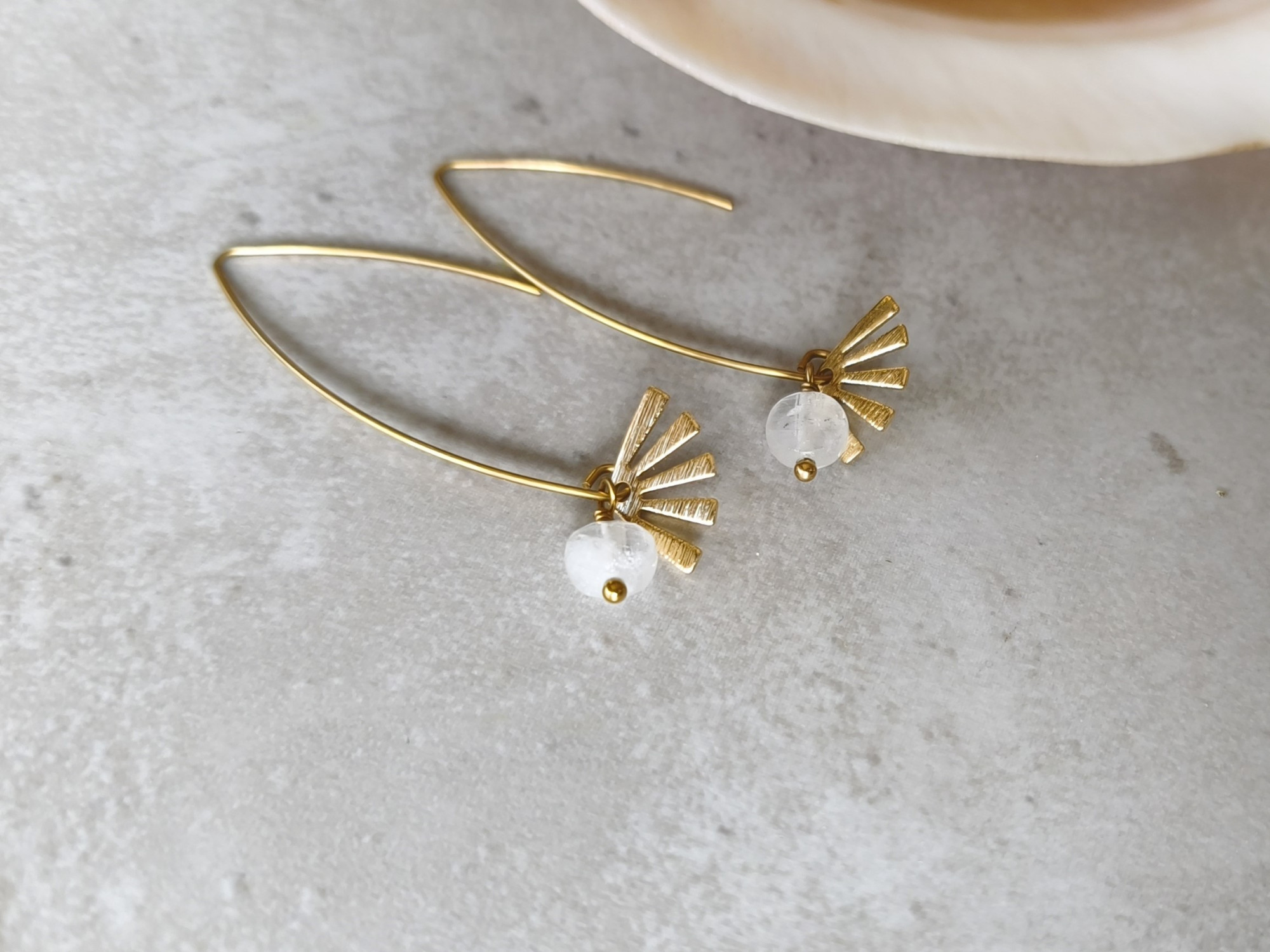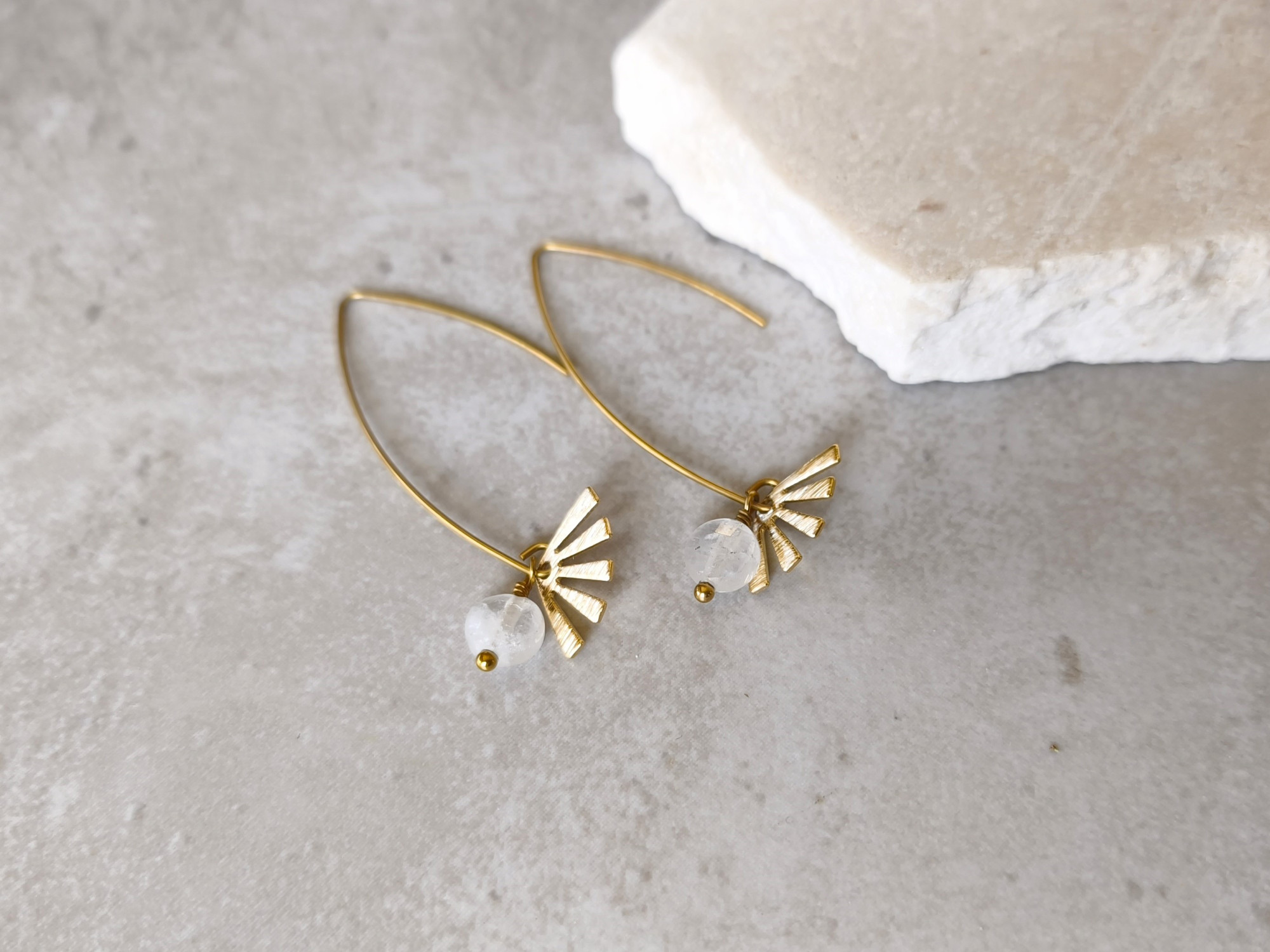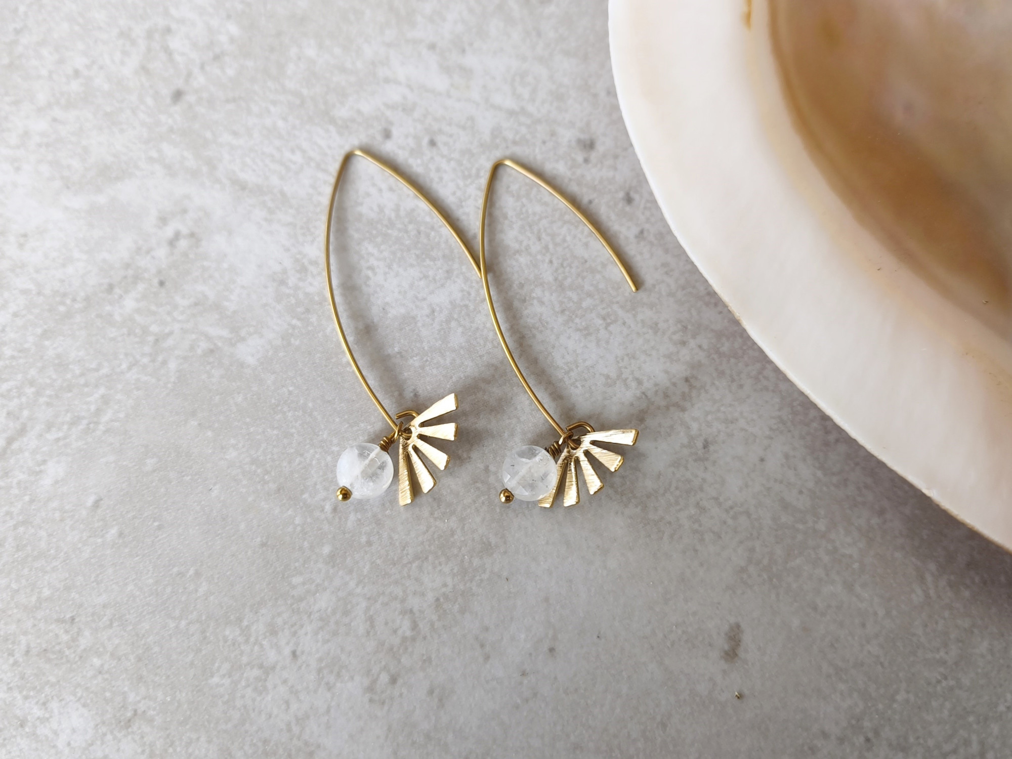 עגילים תלויים קלילים, עם מניפת בראס קטנה וחרוז קוורץ לבן שמוסיף ניצוץ של אור.
