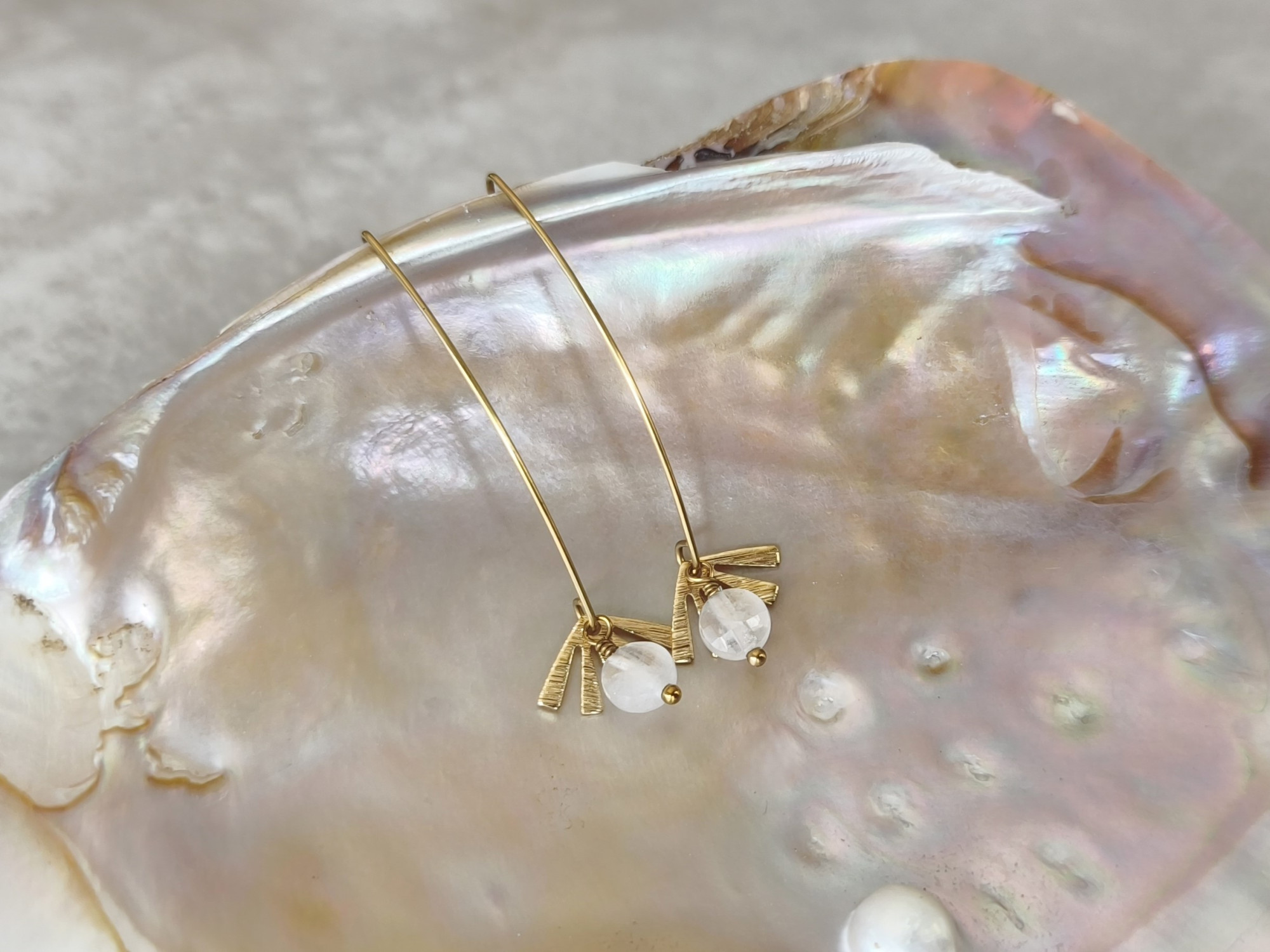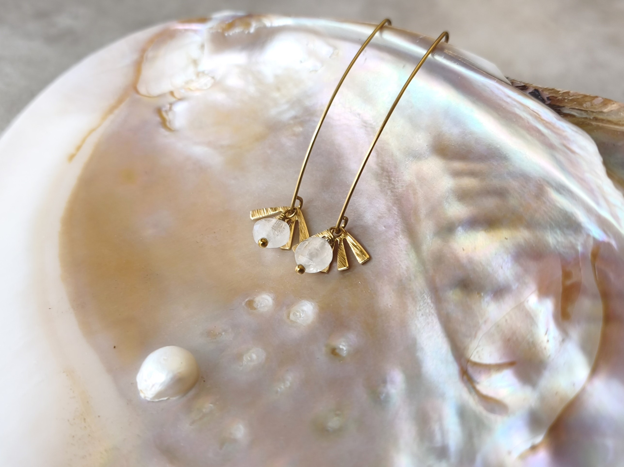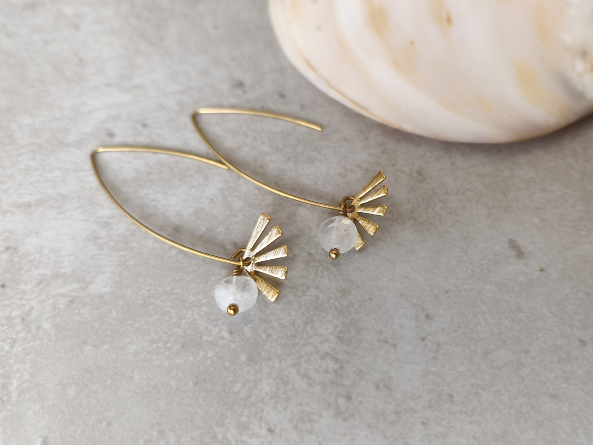 עגילים תלויים קלילים, עם מניפת בראס קטנה וחרוז קוורץ לבן שמוסיף ניצוץ של אור.