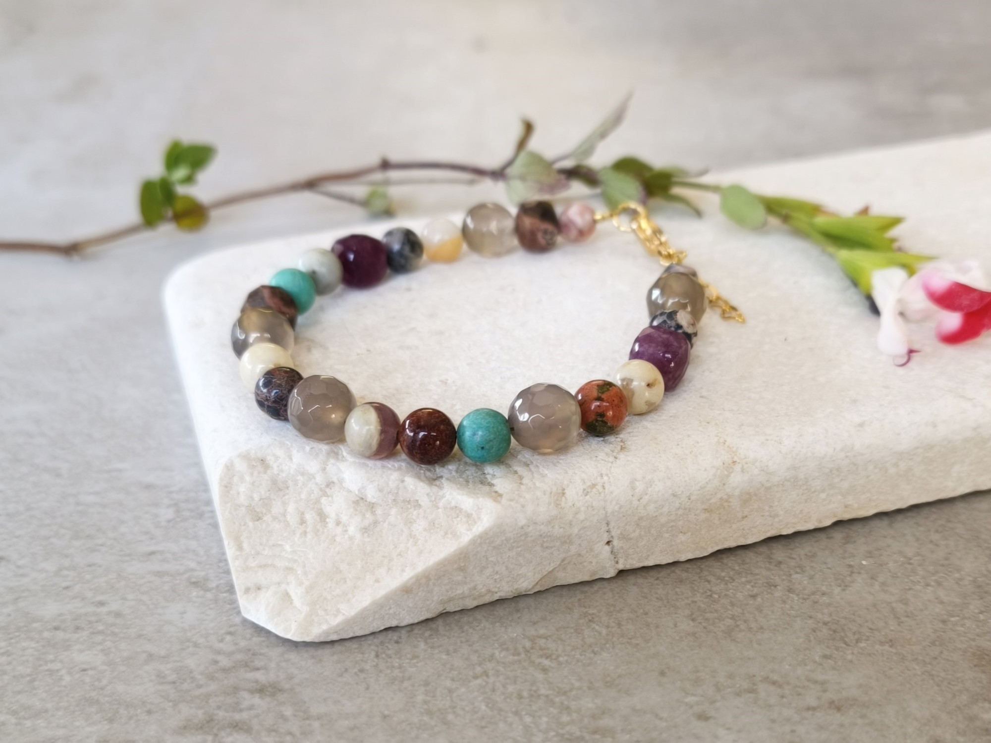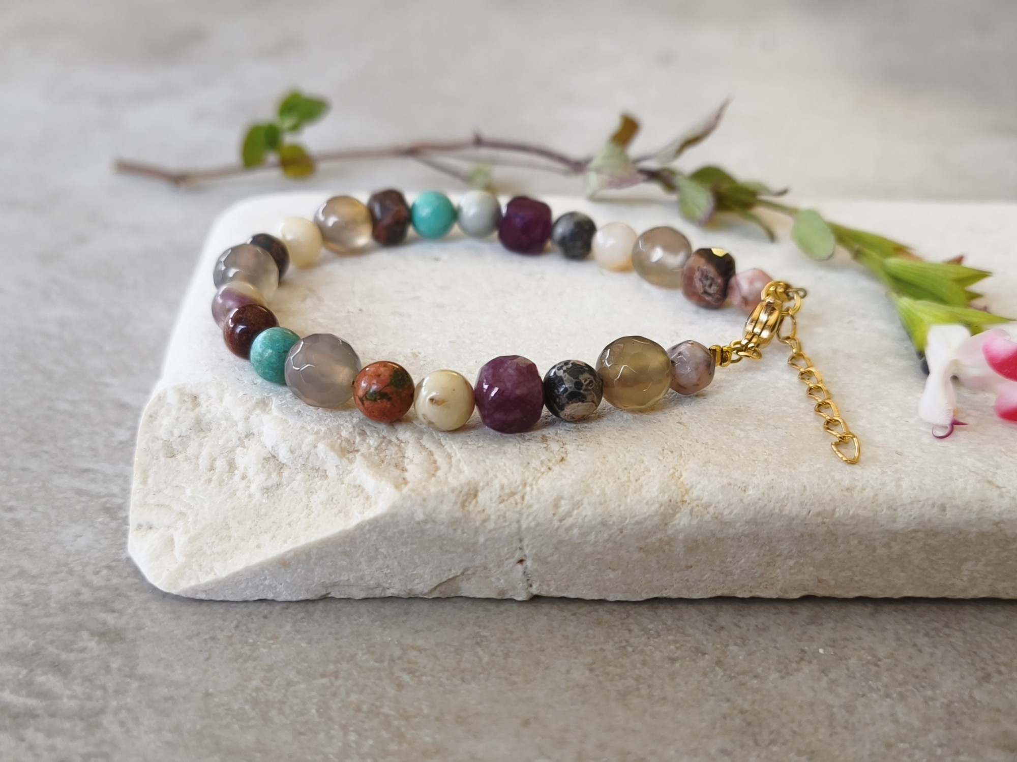 צמיד צבעוני ובעל נוכחות עם חרוזי אבני חן בגווני סגול, אפור, קרם וטורקיז.
